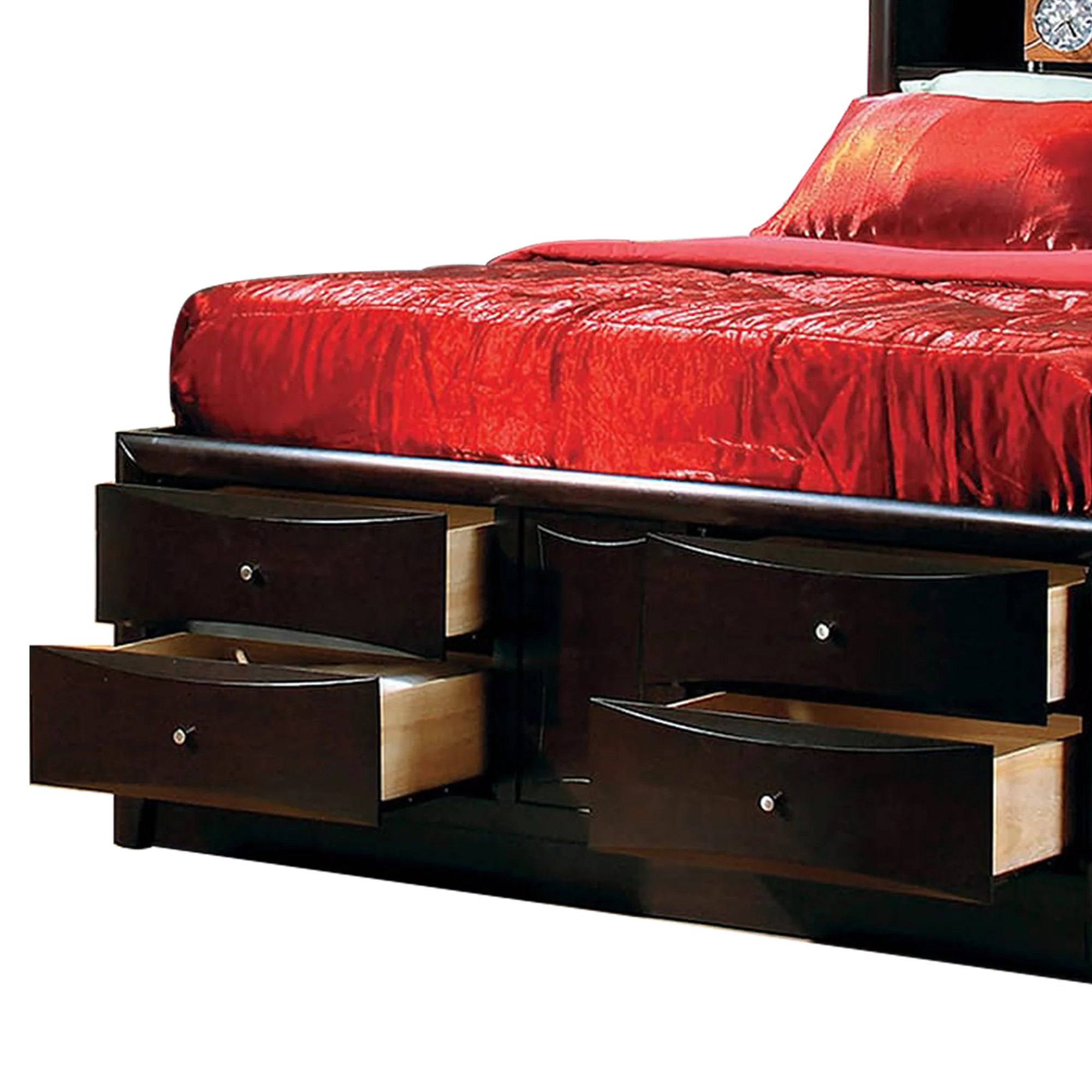 Wooden Queen Size bed with 10 Drawers and 2 Open Shelves, Dark Brown