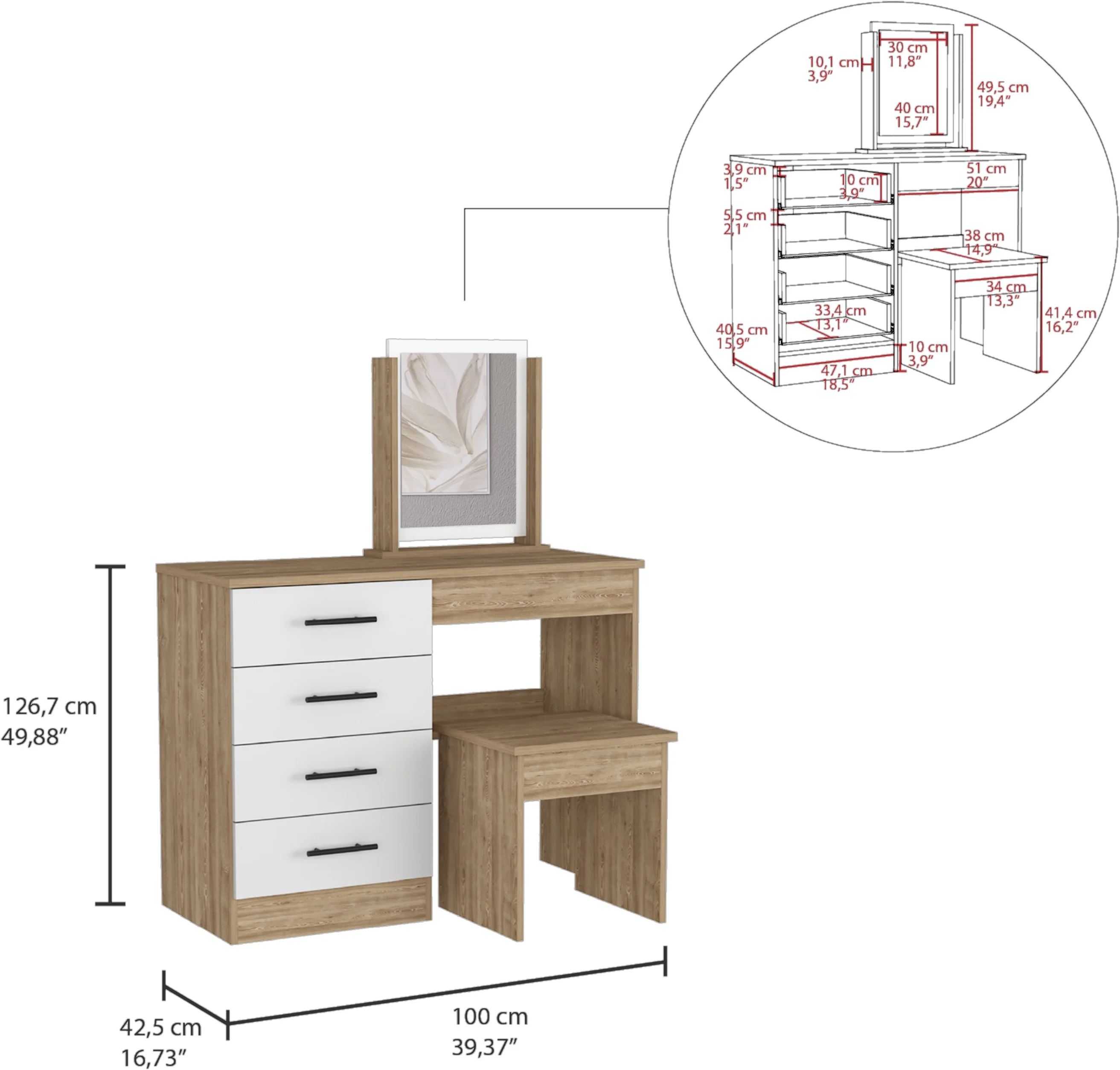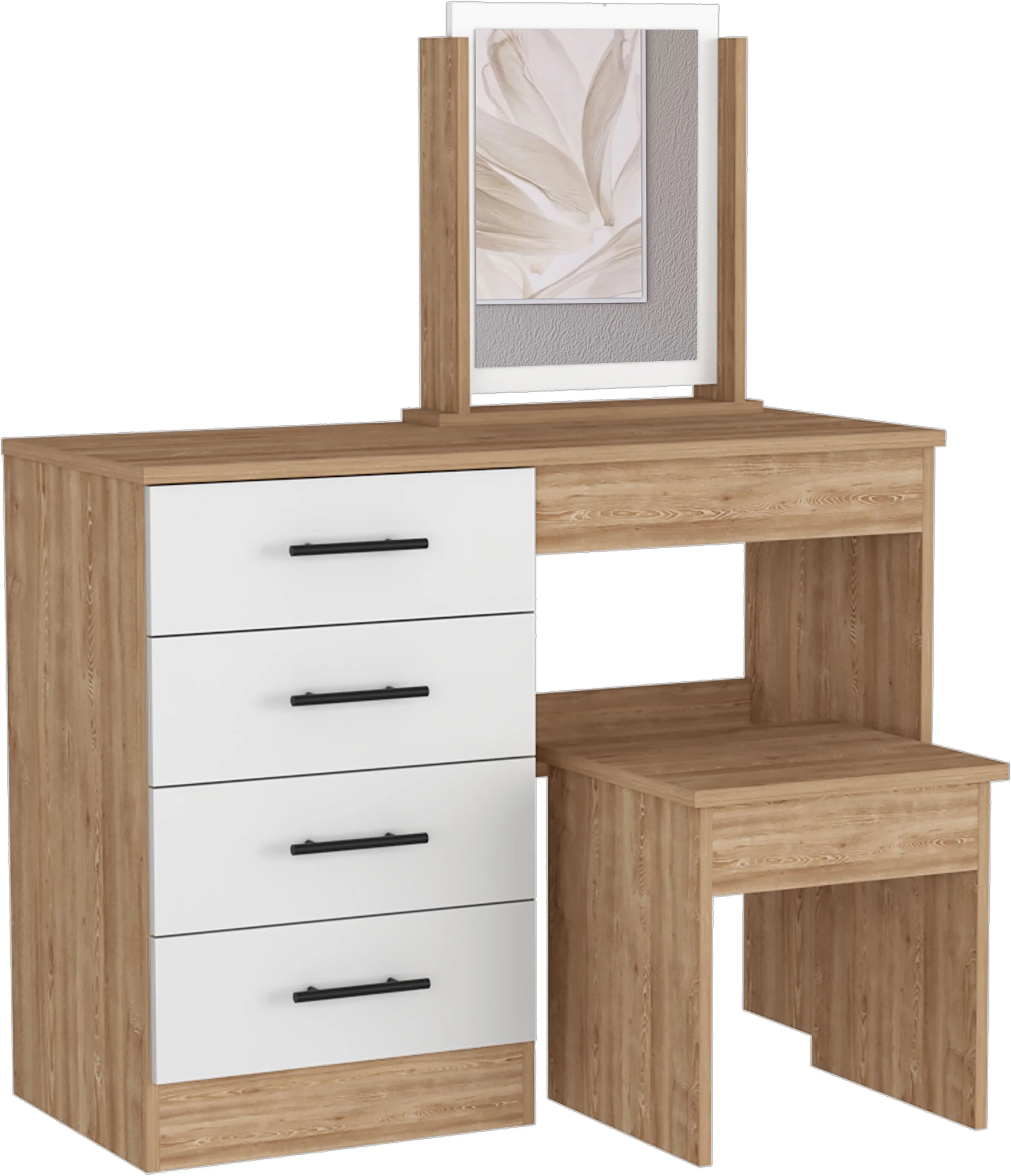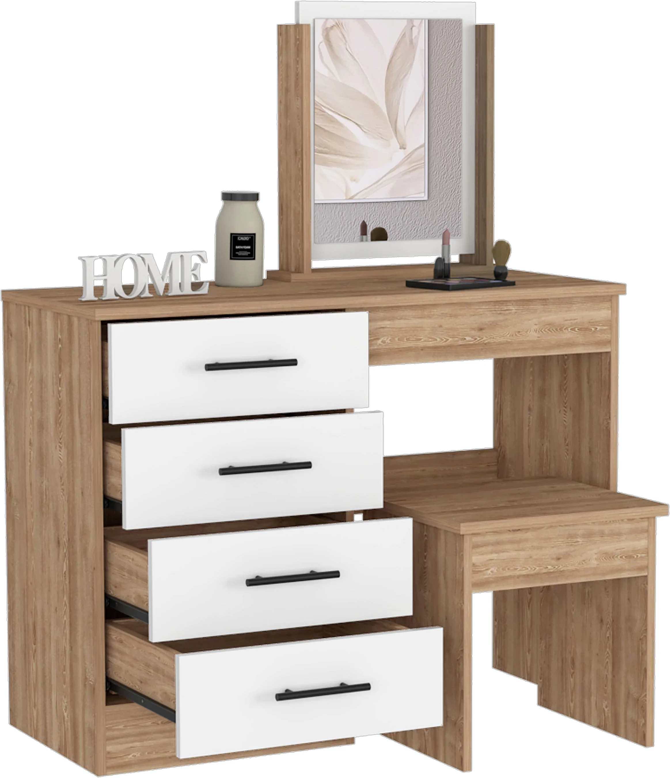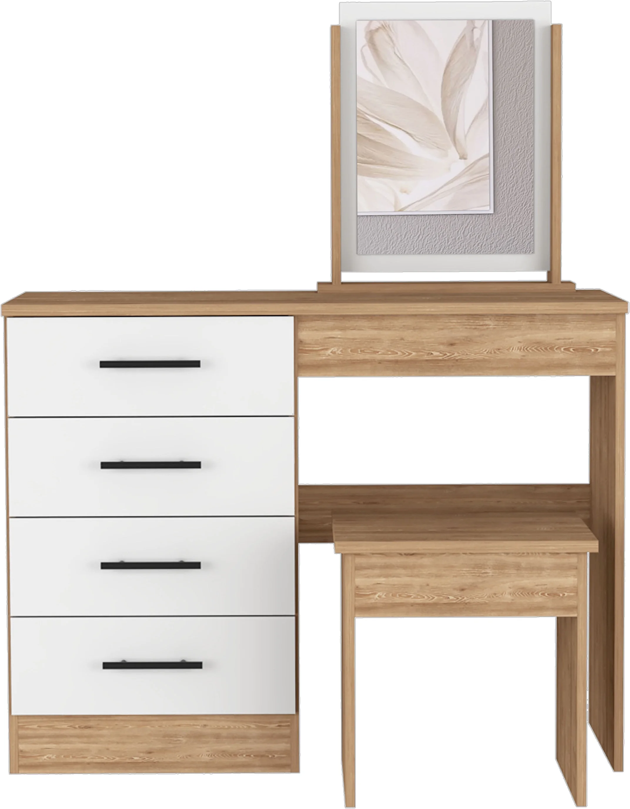 TUHOME Kaia Makeup Dressing Table with Mirror and 4 Drawers, Stool Included, White/ Pine