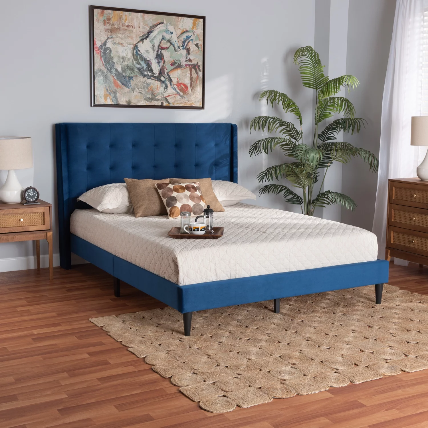 Baxton Studio Gothard Blue Velvet and Dark Brown Wood Queen Size Platform Bed