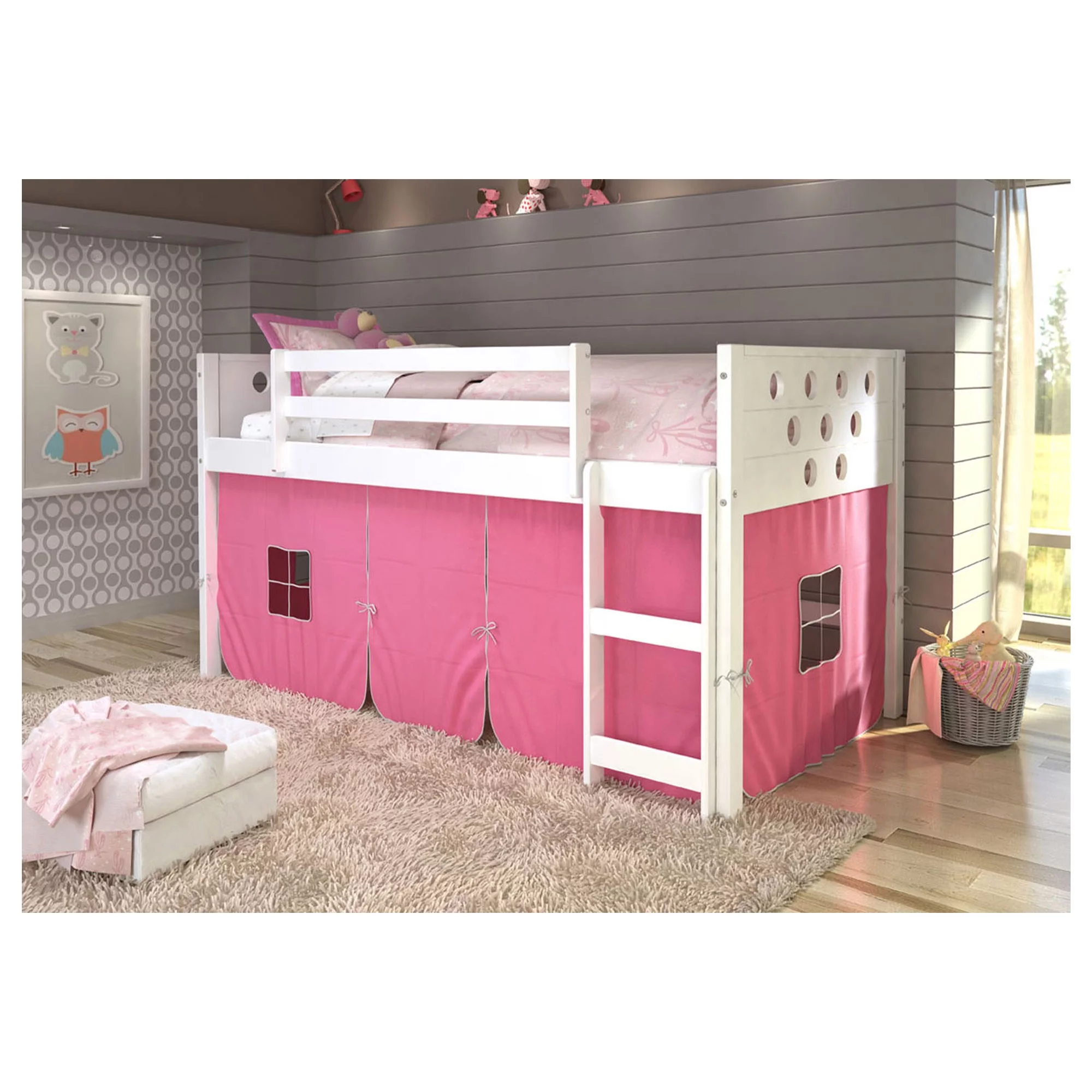 Donco Kids Louvre Low Captain's Loft Pine Wood Twin Bed with Pink Tent, White