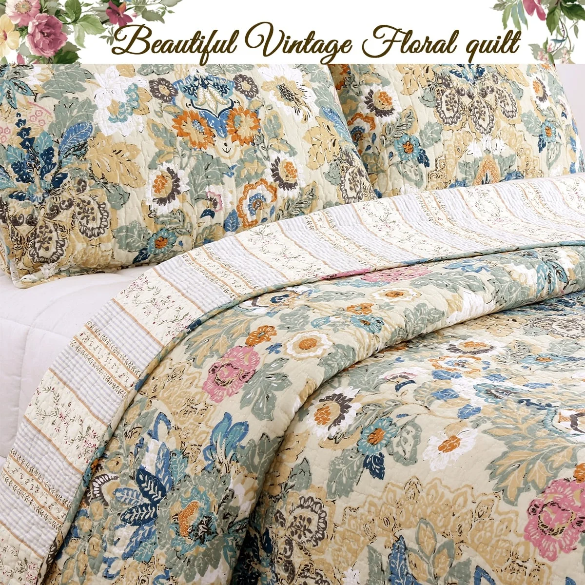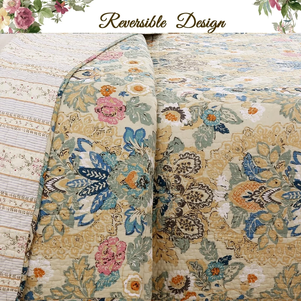 Cozy Line Florabella Cotton Floral 3-pc. Reversible Quilt Set Yellow King Bohemian & Eclectic, Farmhouse