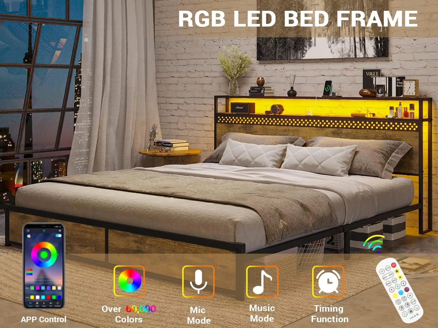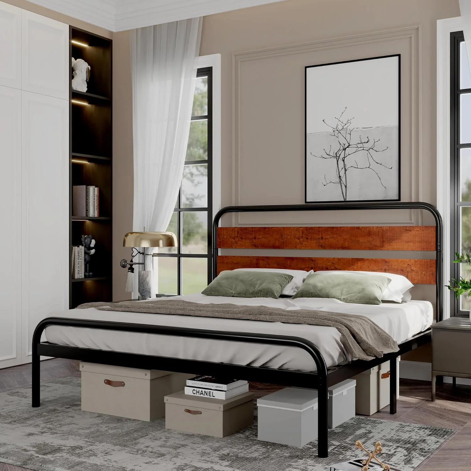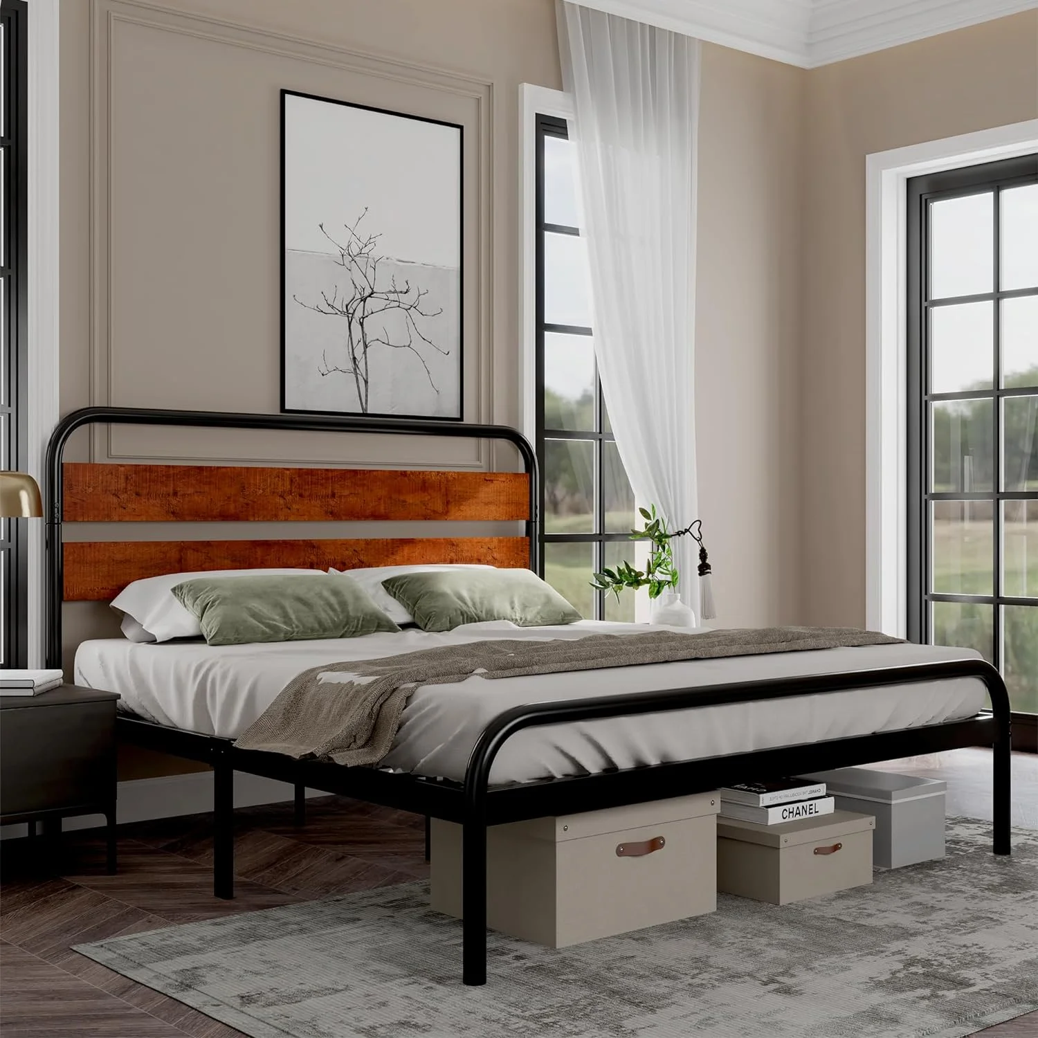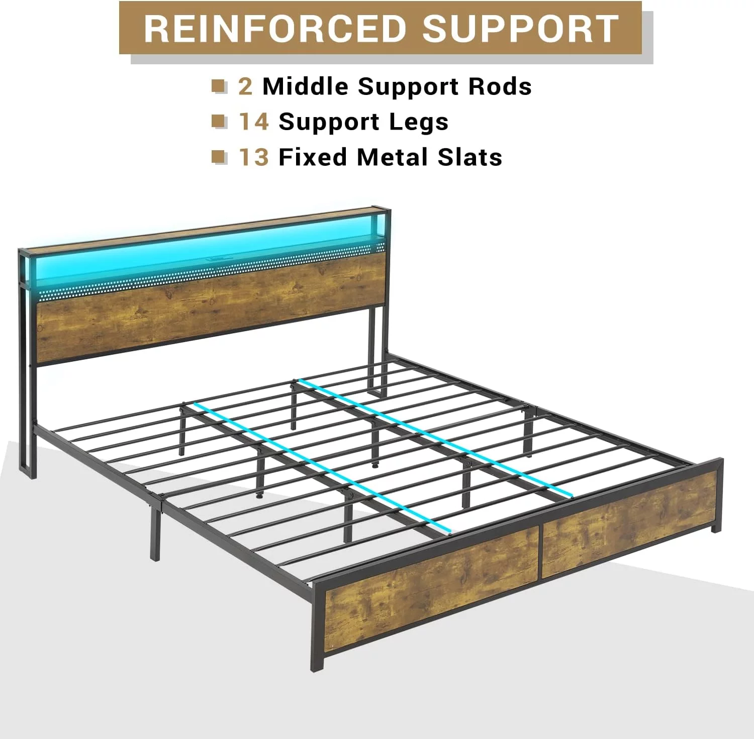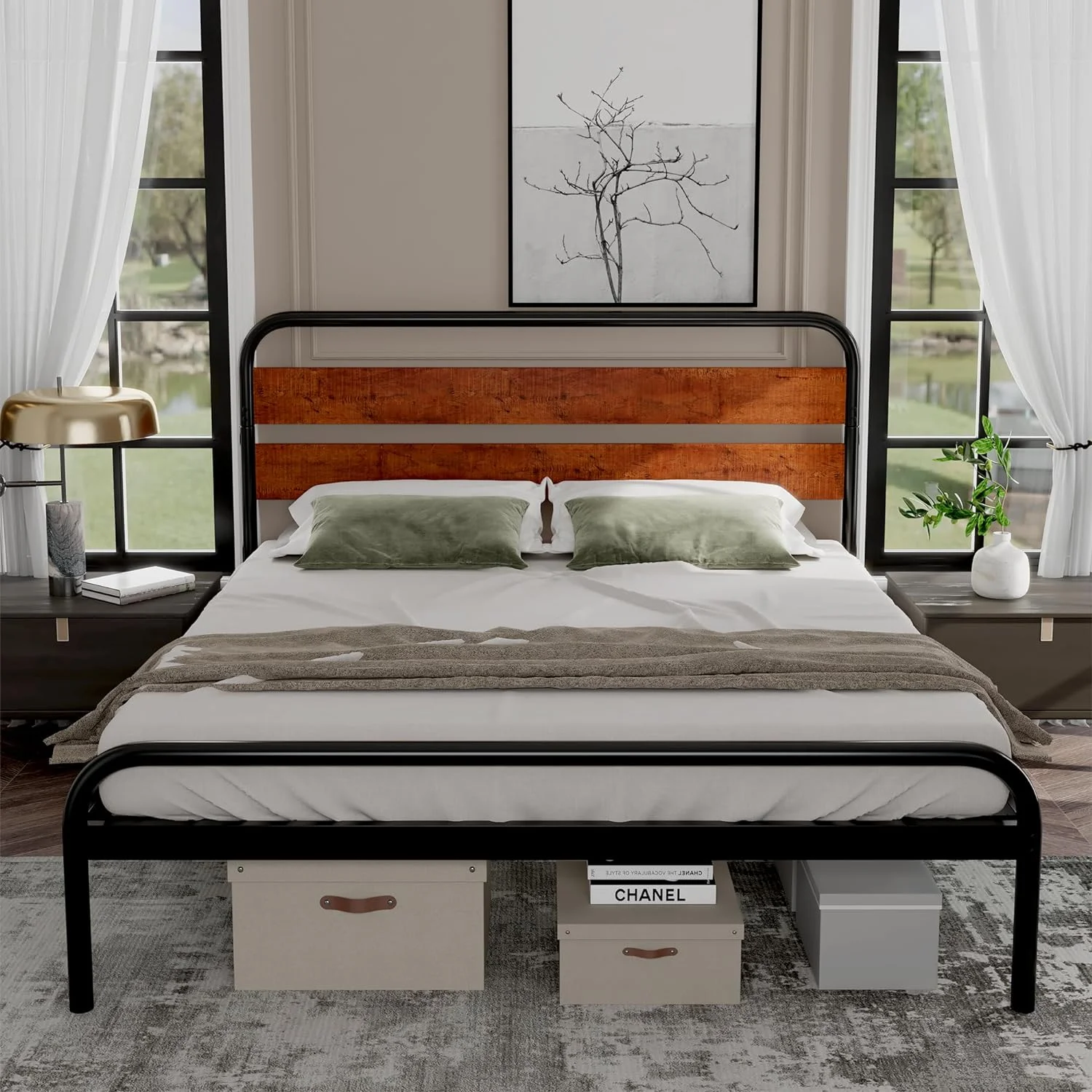 Plank Style Headboard Ach Wood Queen Storage Bed with 2 Drawers, Brown