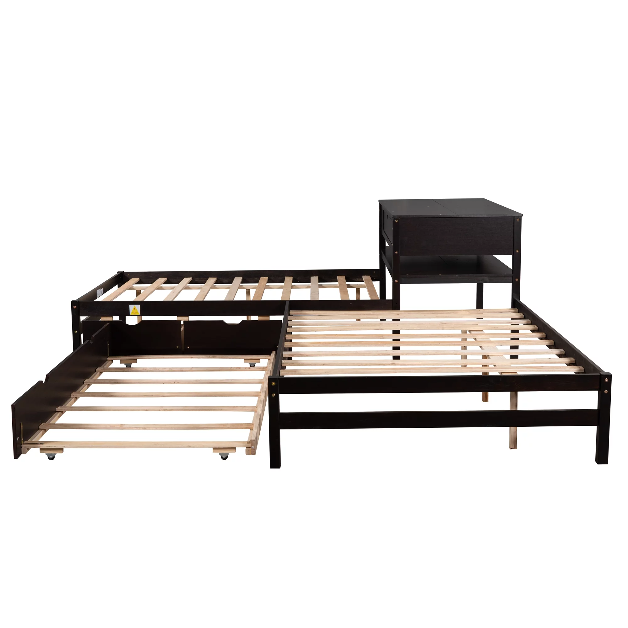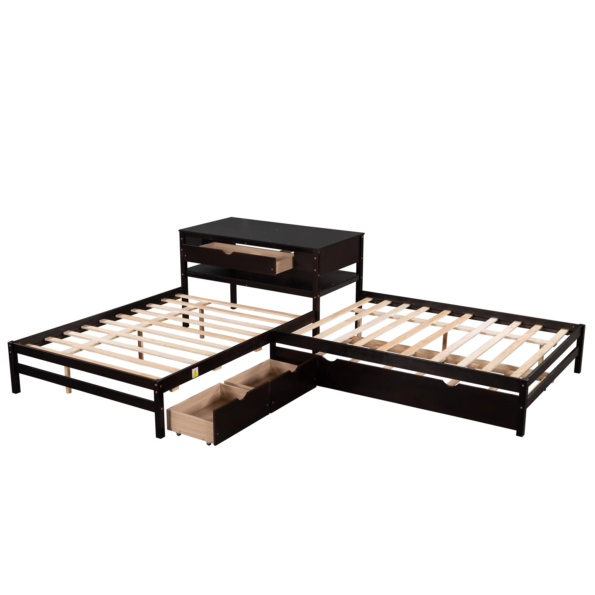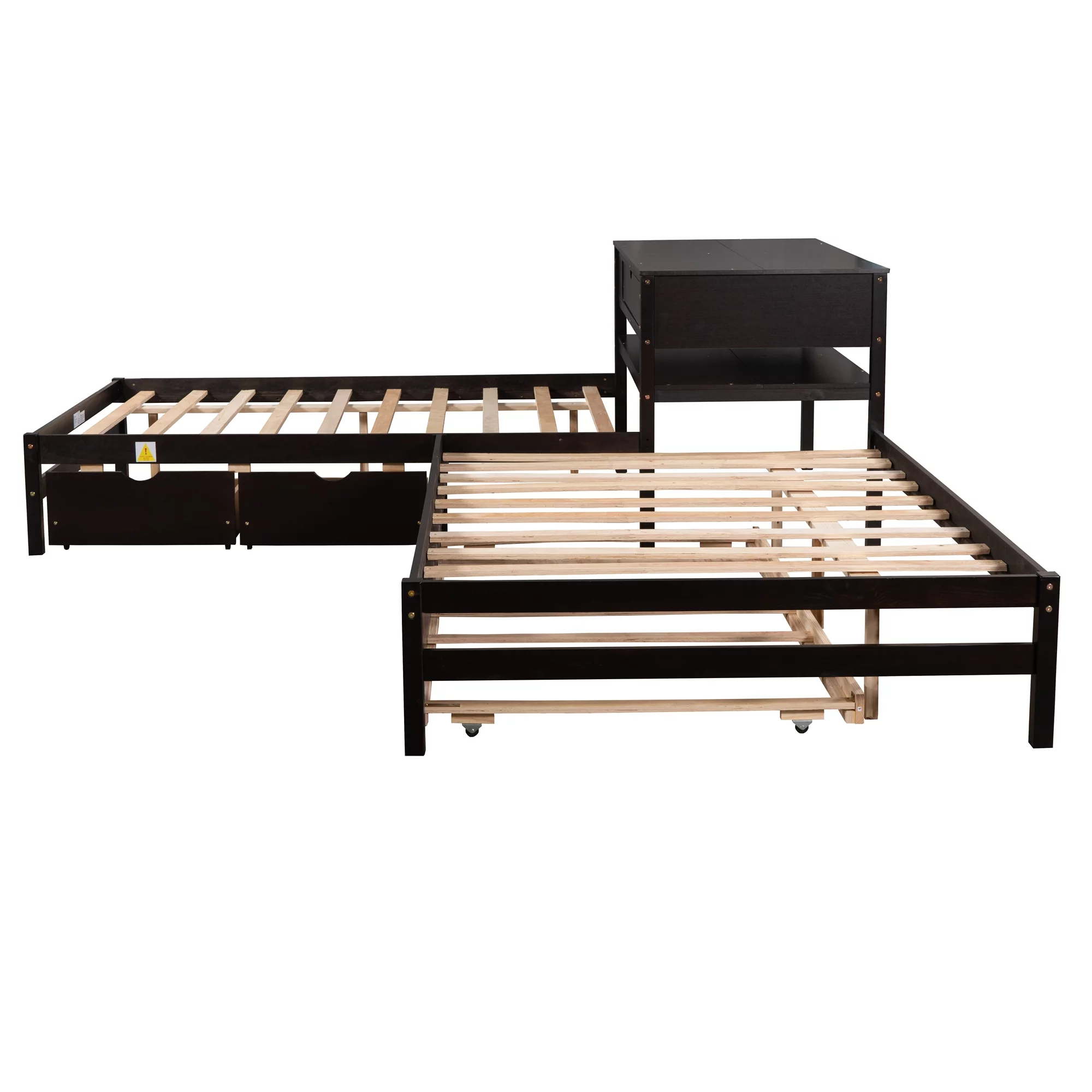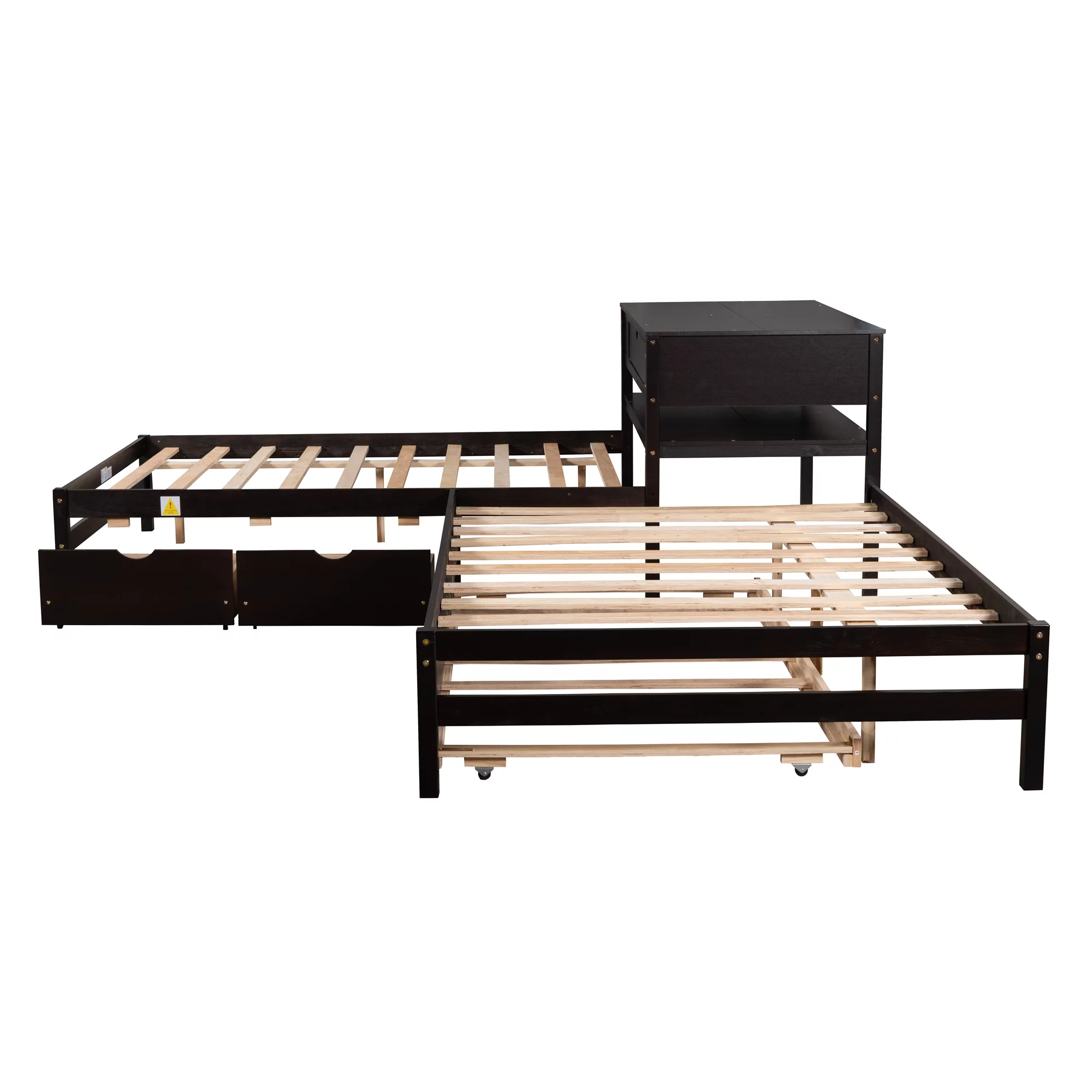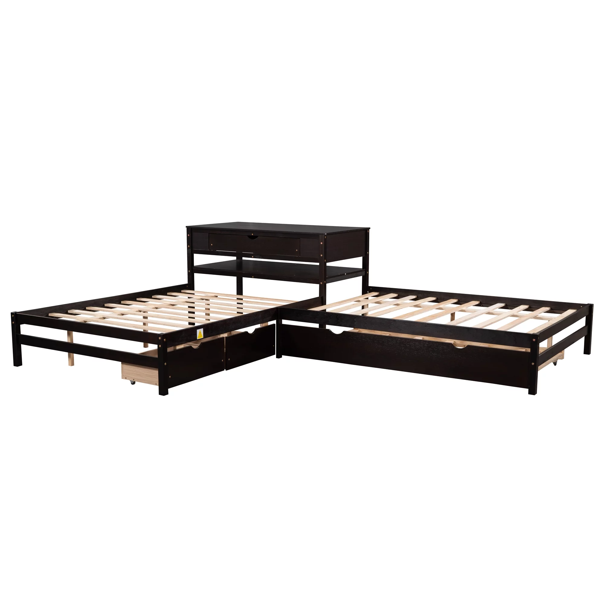 Full Size L-shaped Platform Beds with Trundle, Drawers and Table, Espresso