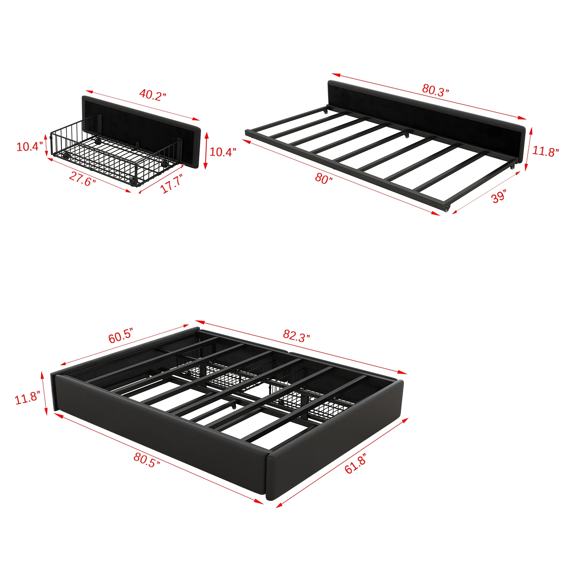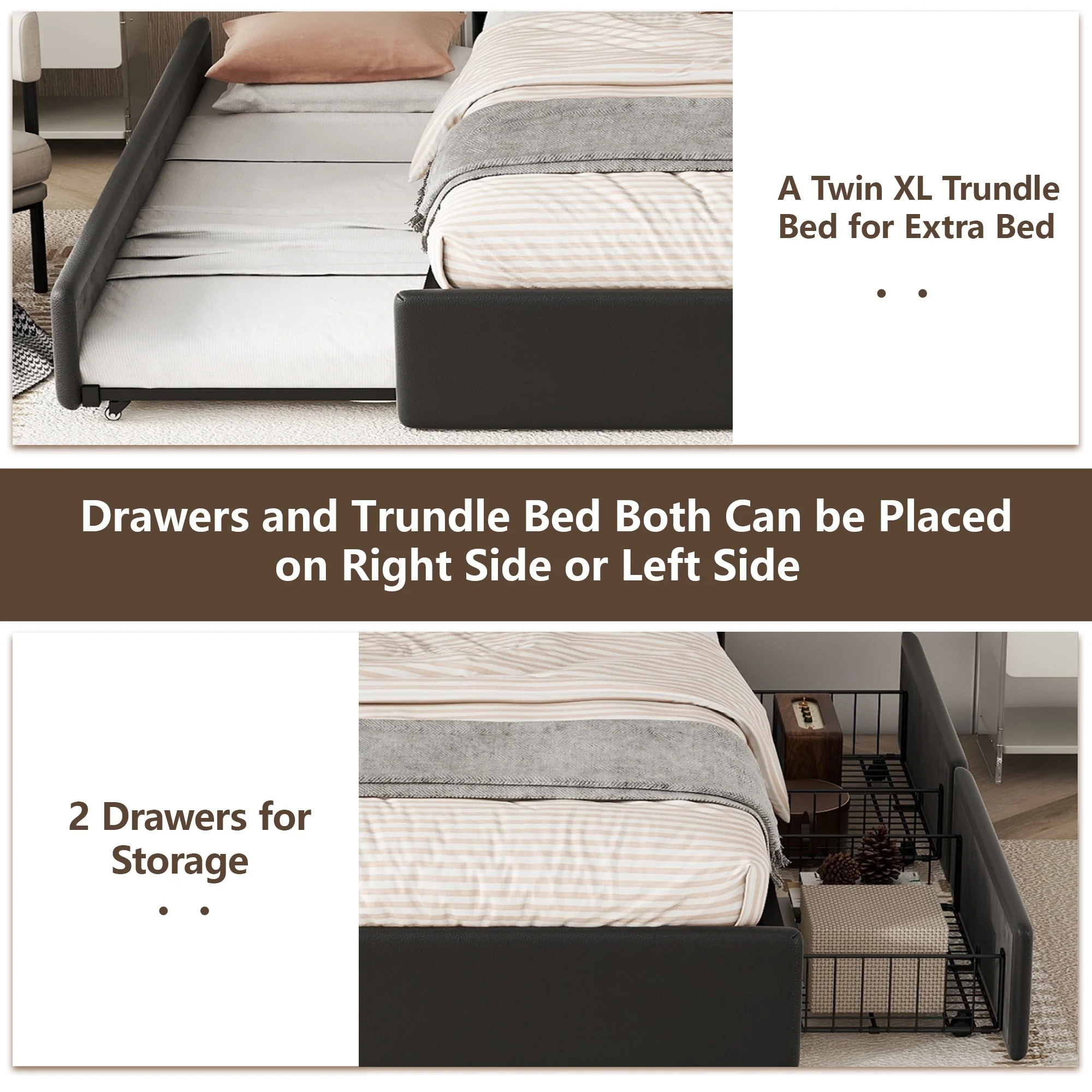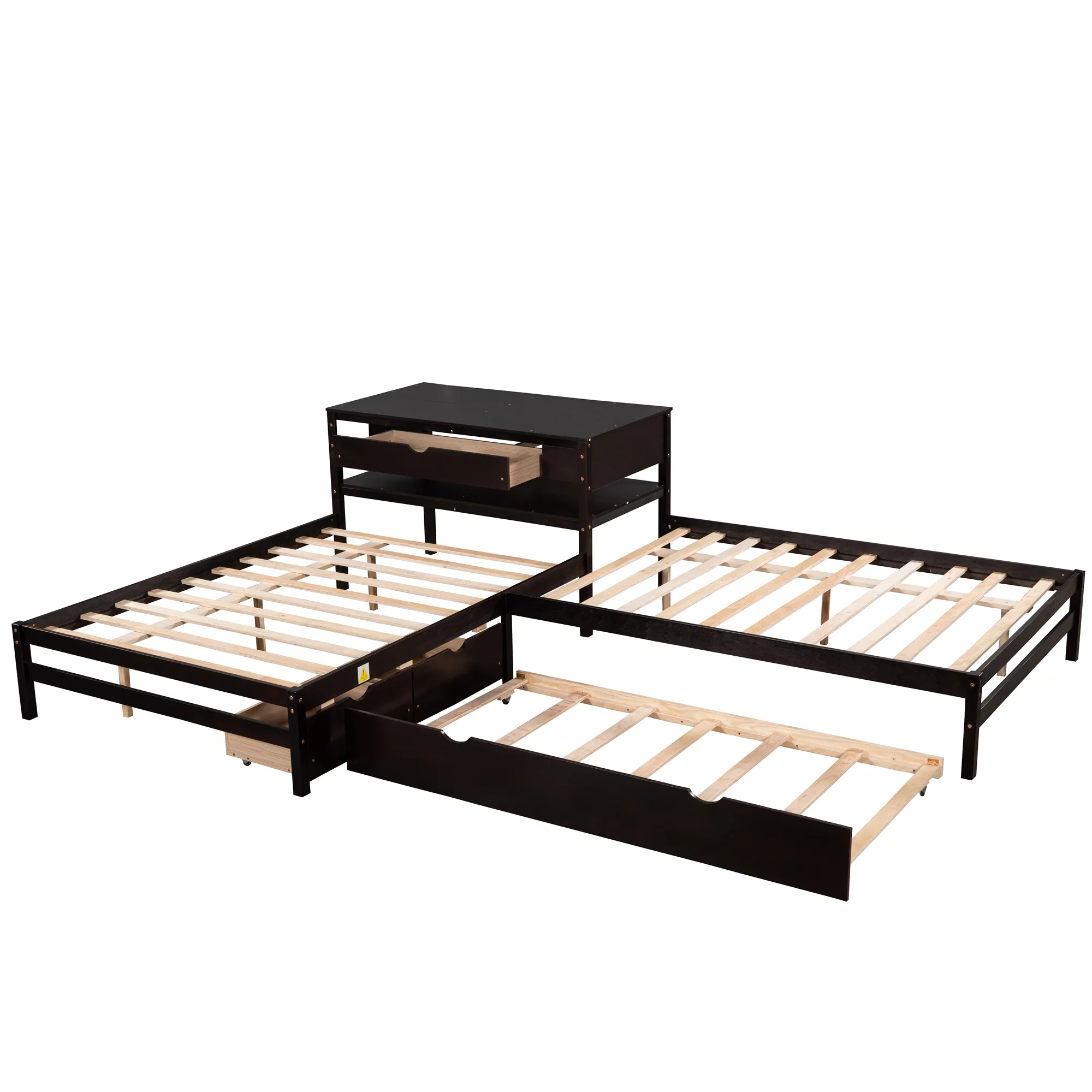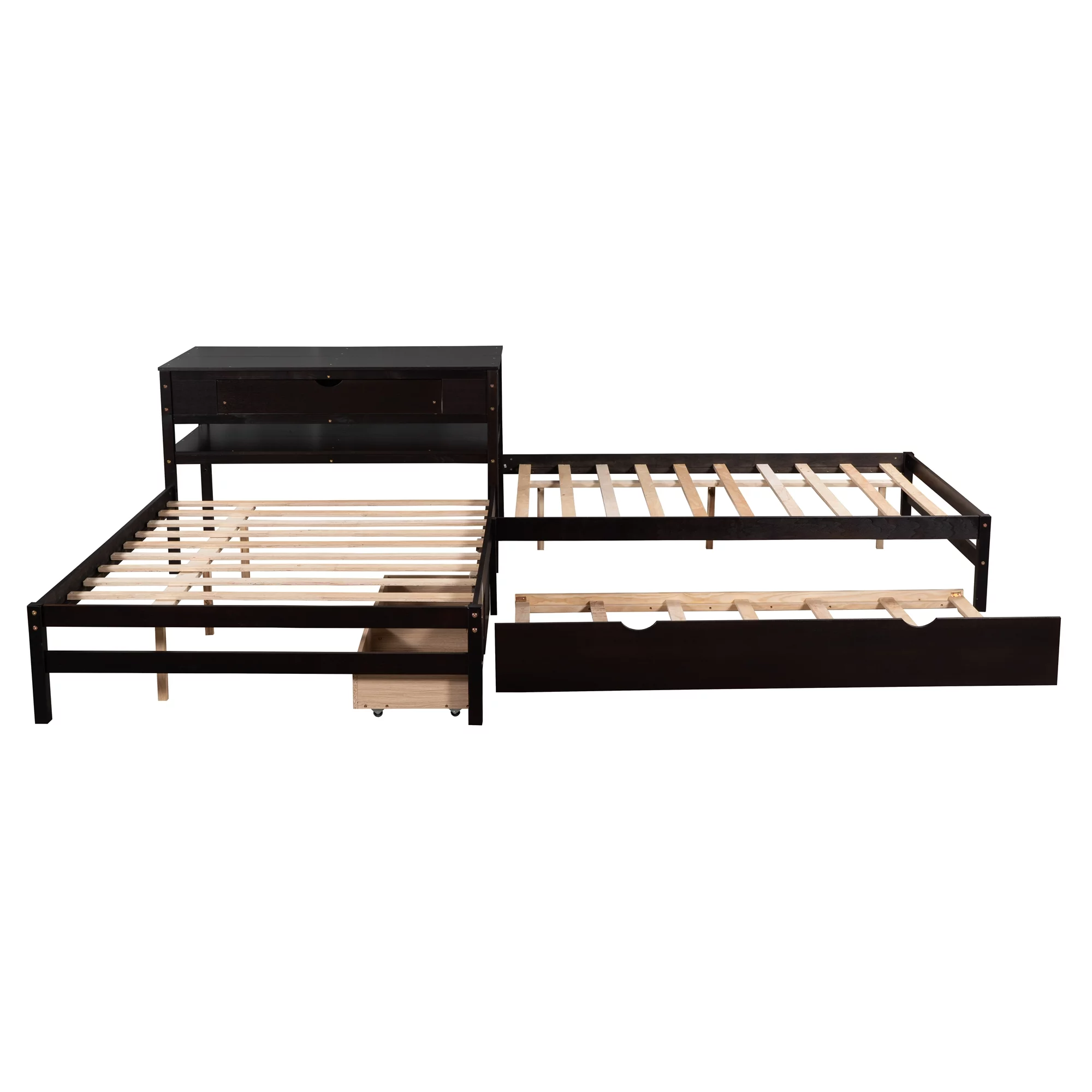 Full Size L-shaped Platform Beds with Trundle, Drawers and Table, Espresso