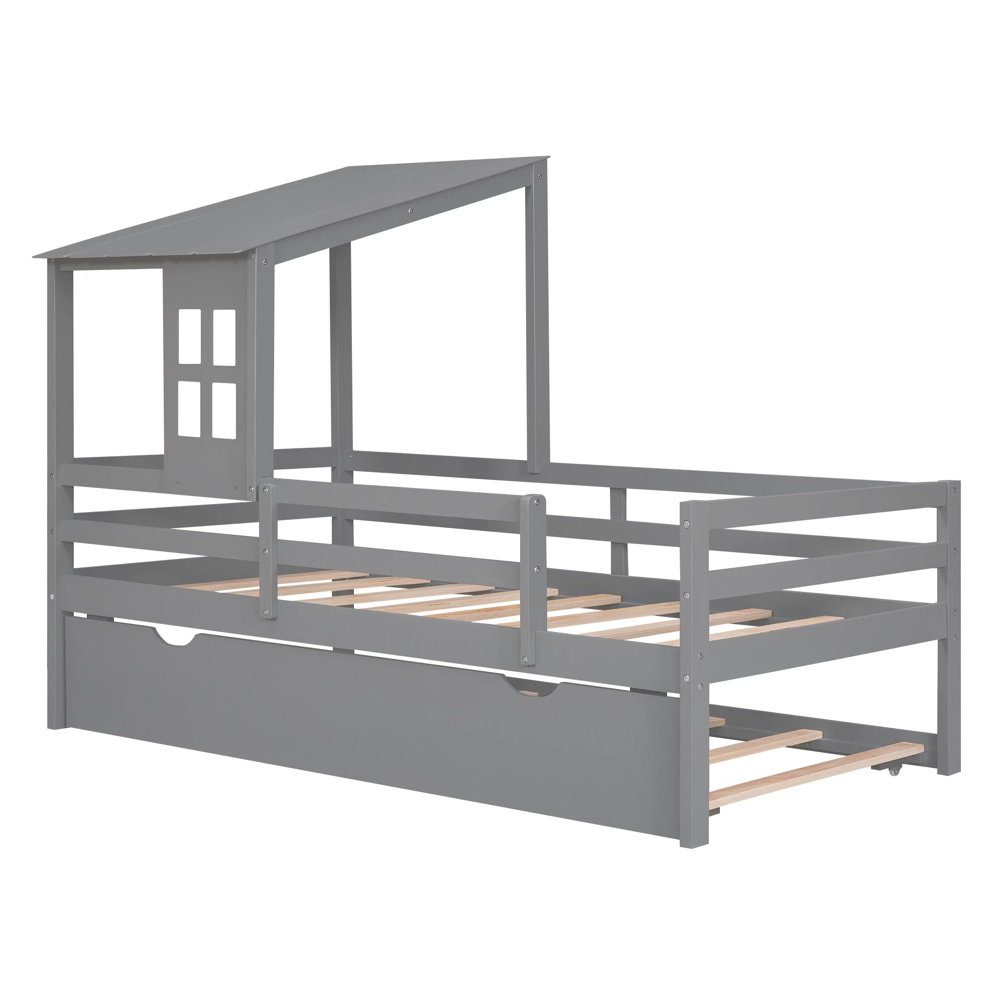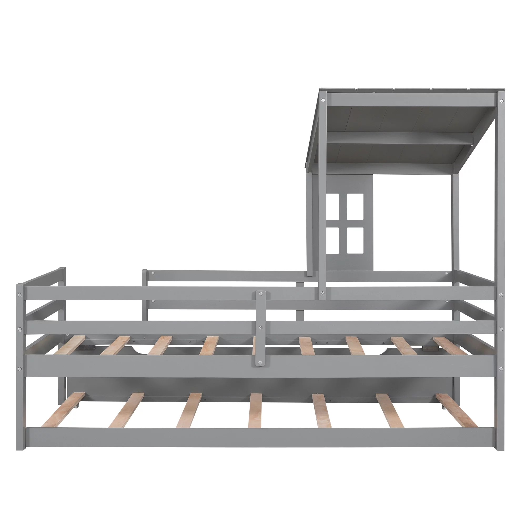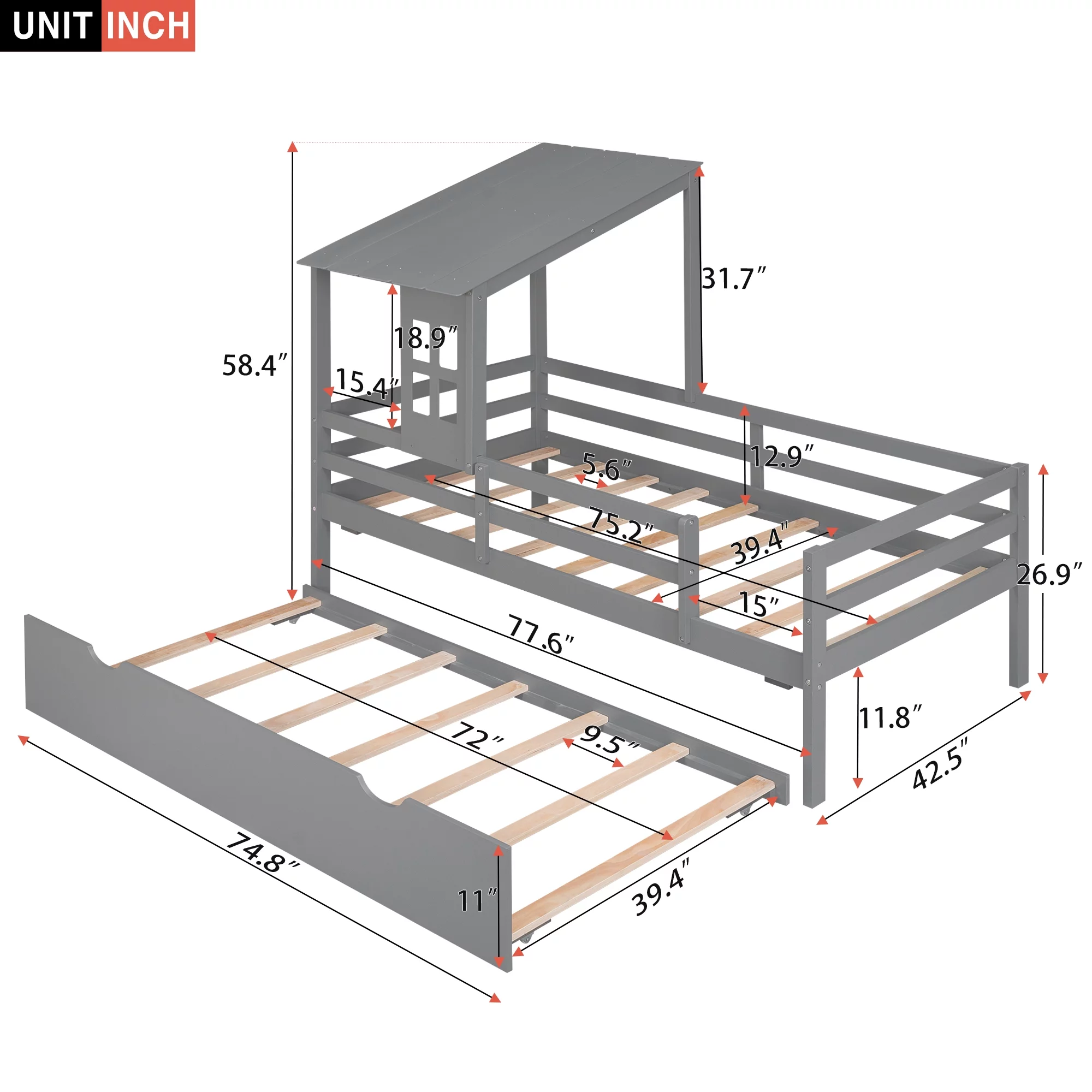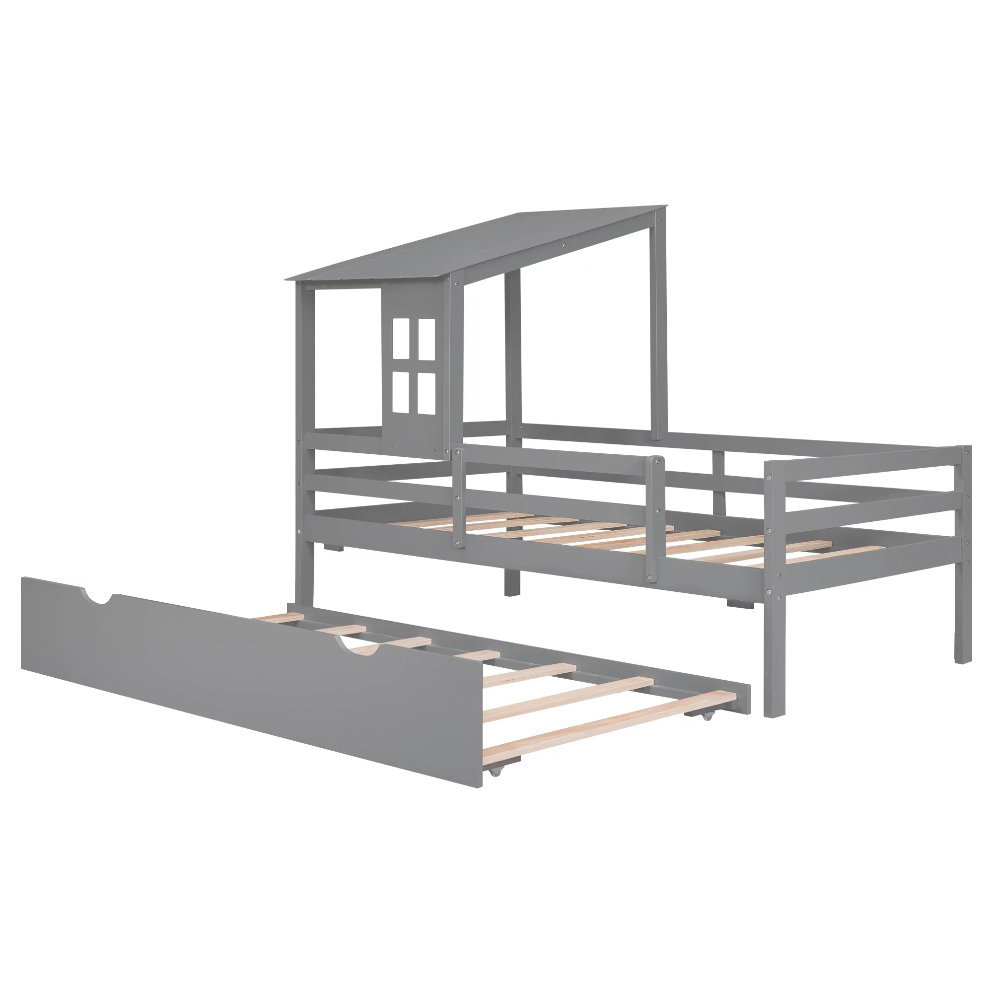 Euroco Wood House Platform Bed with Roof and Trundle for Kids Bedroom, Semi-Close House Bed with Roof and Window, Gray
