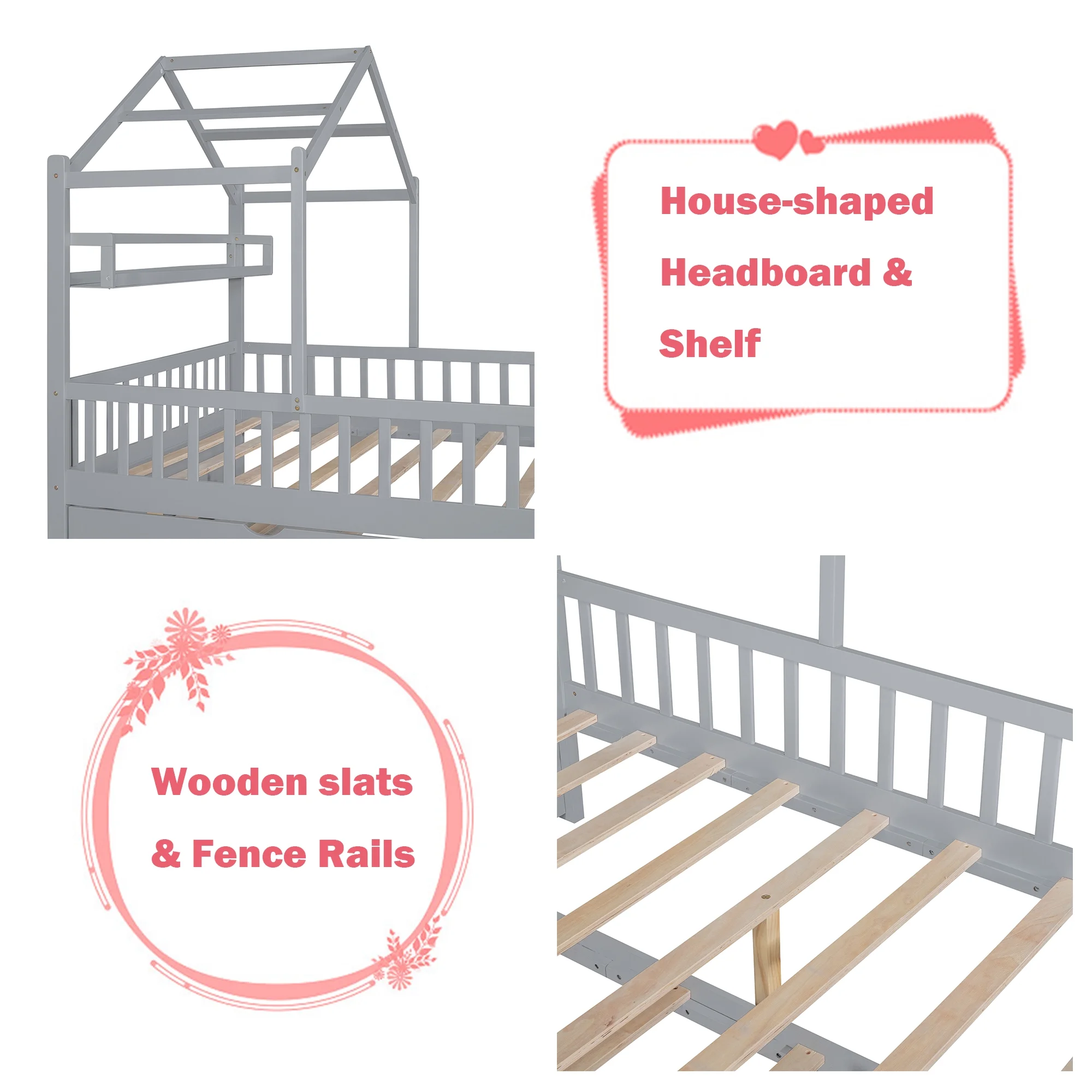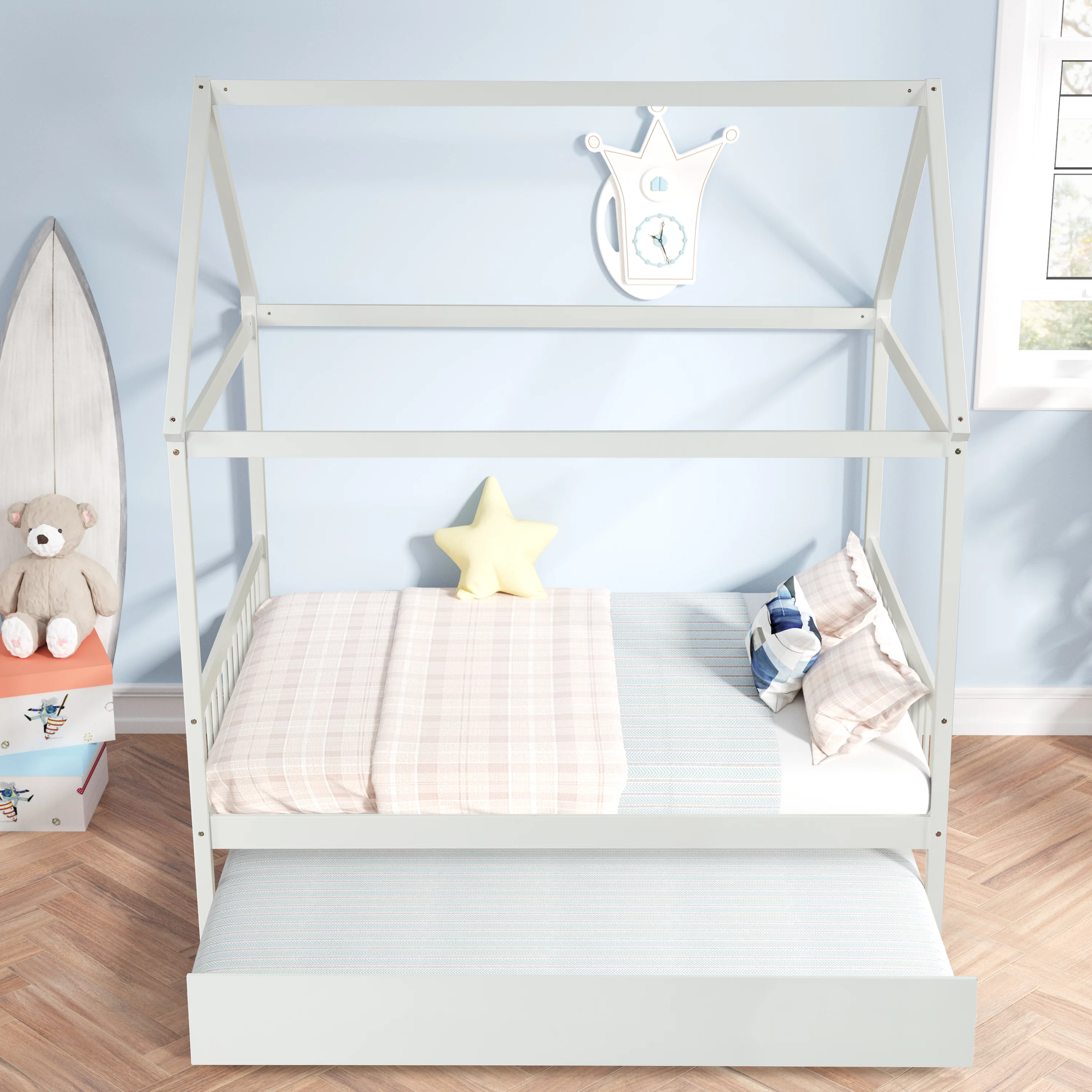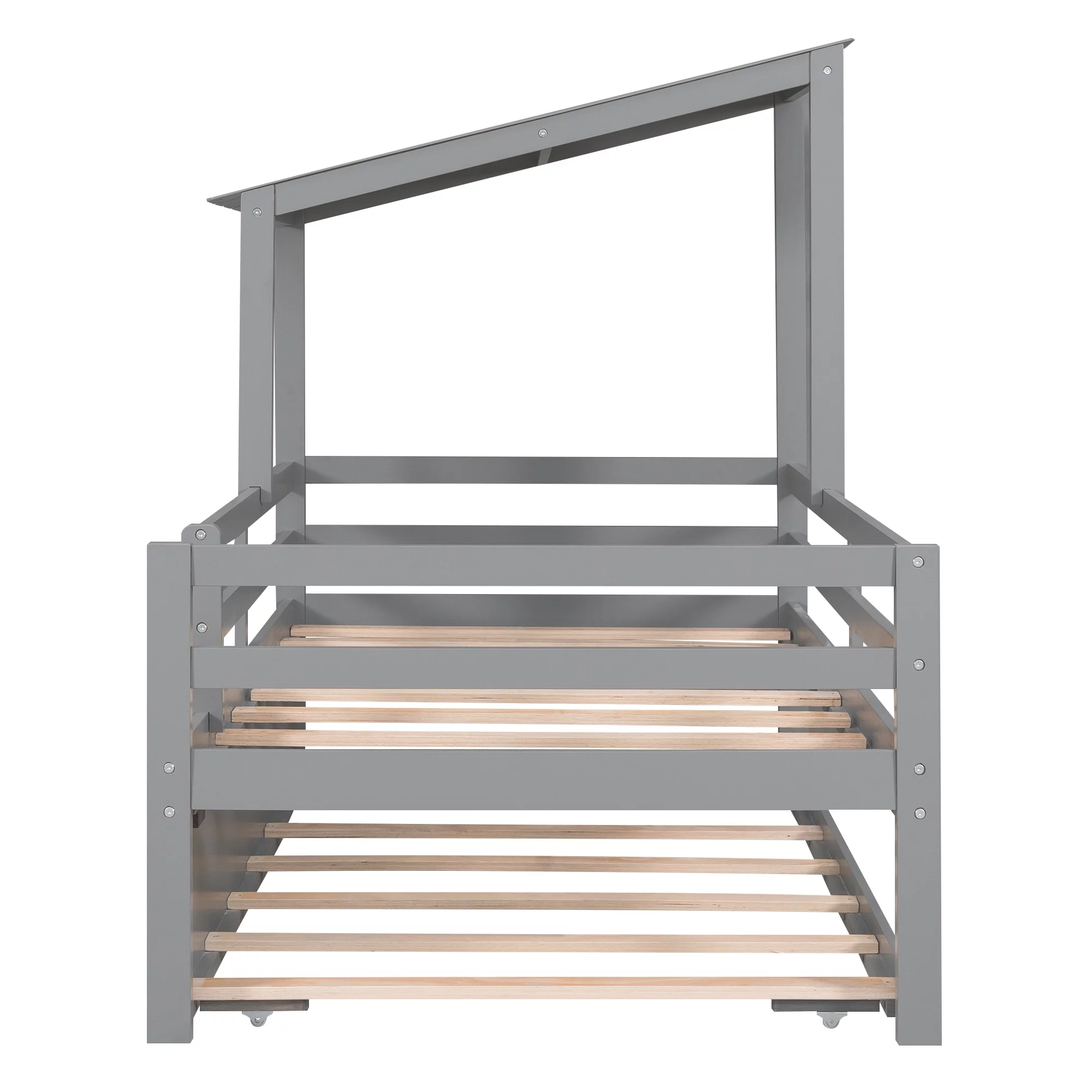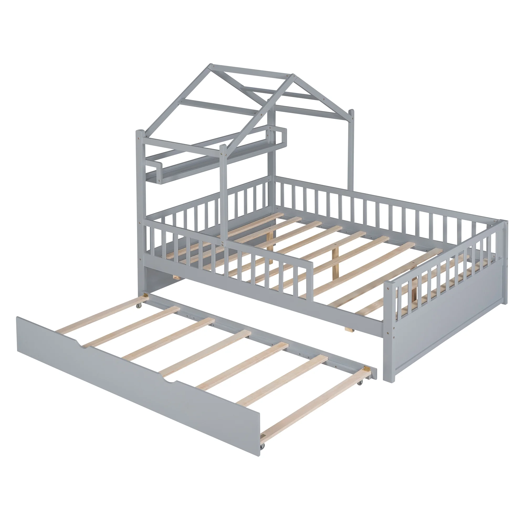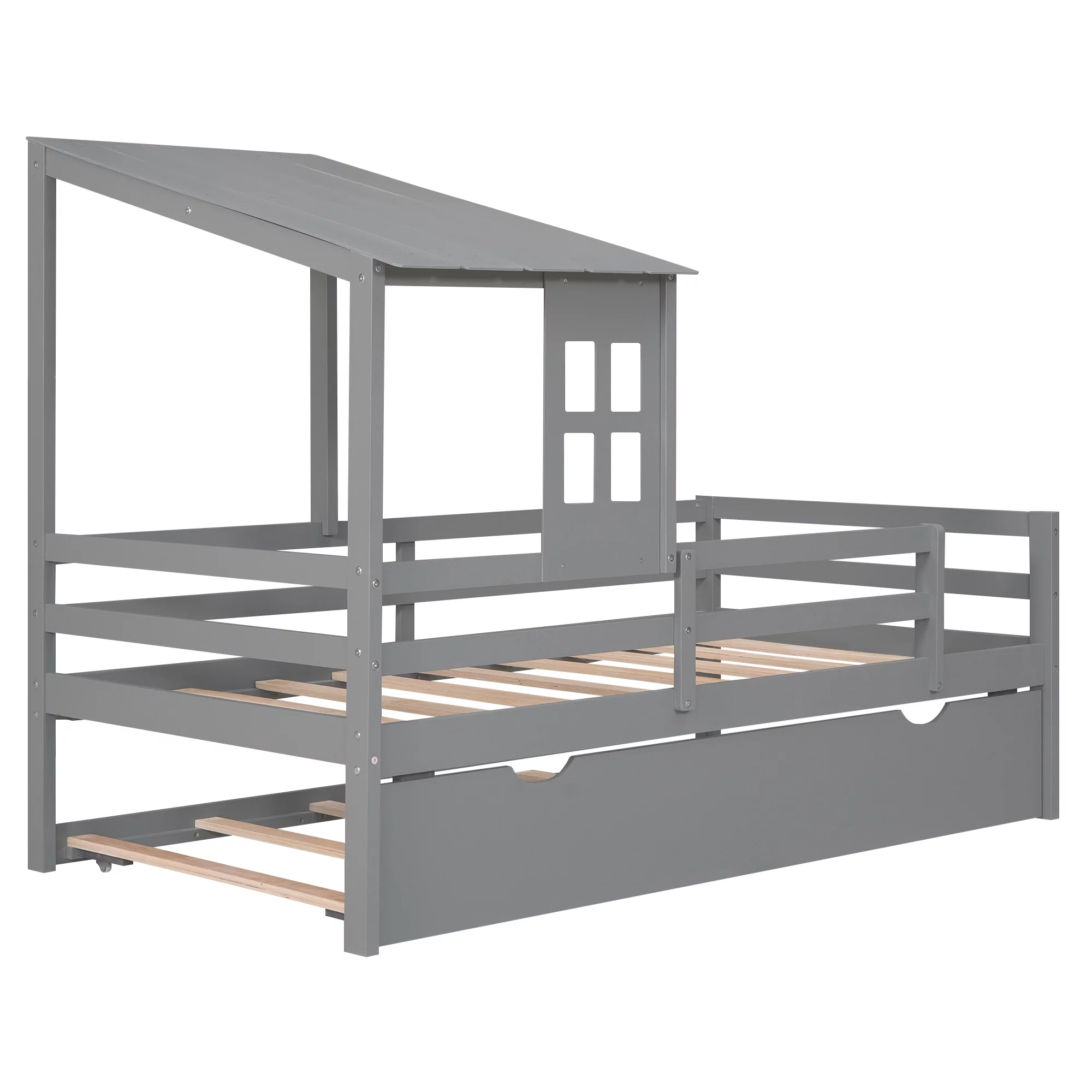 Euroco Wood House Platform Bed with Roof and Trundle for Kids Bedroom, Semi-Close House Bed with Roof and Window, Gray