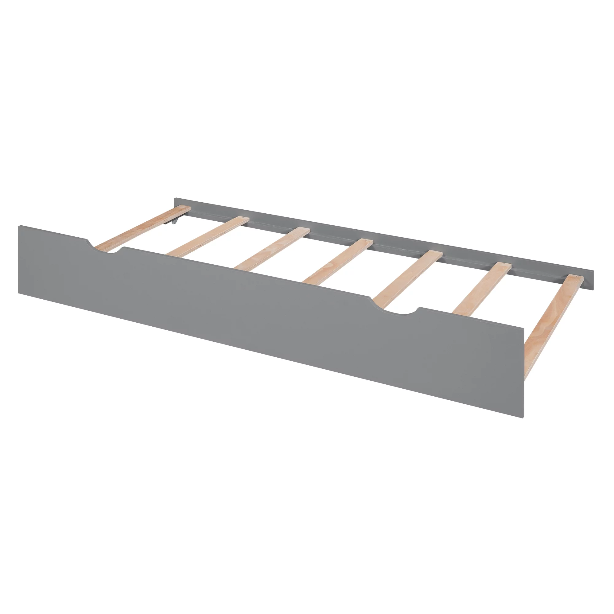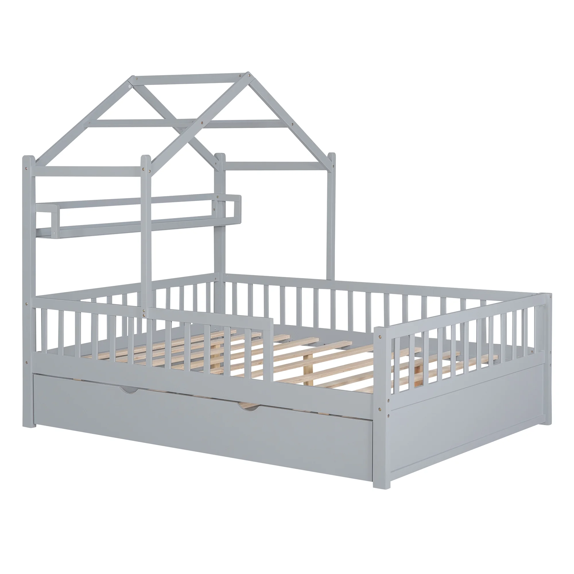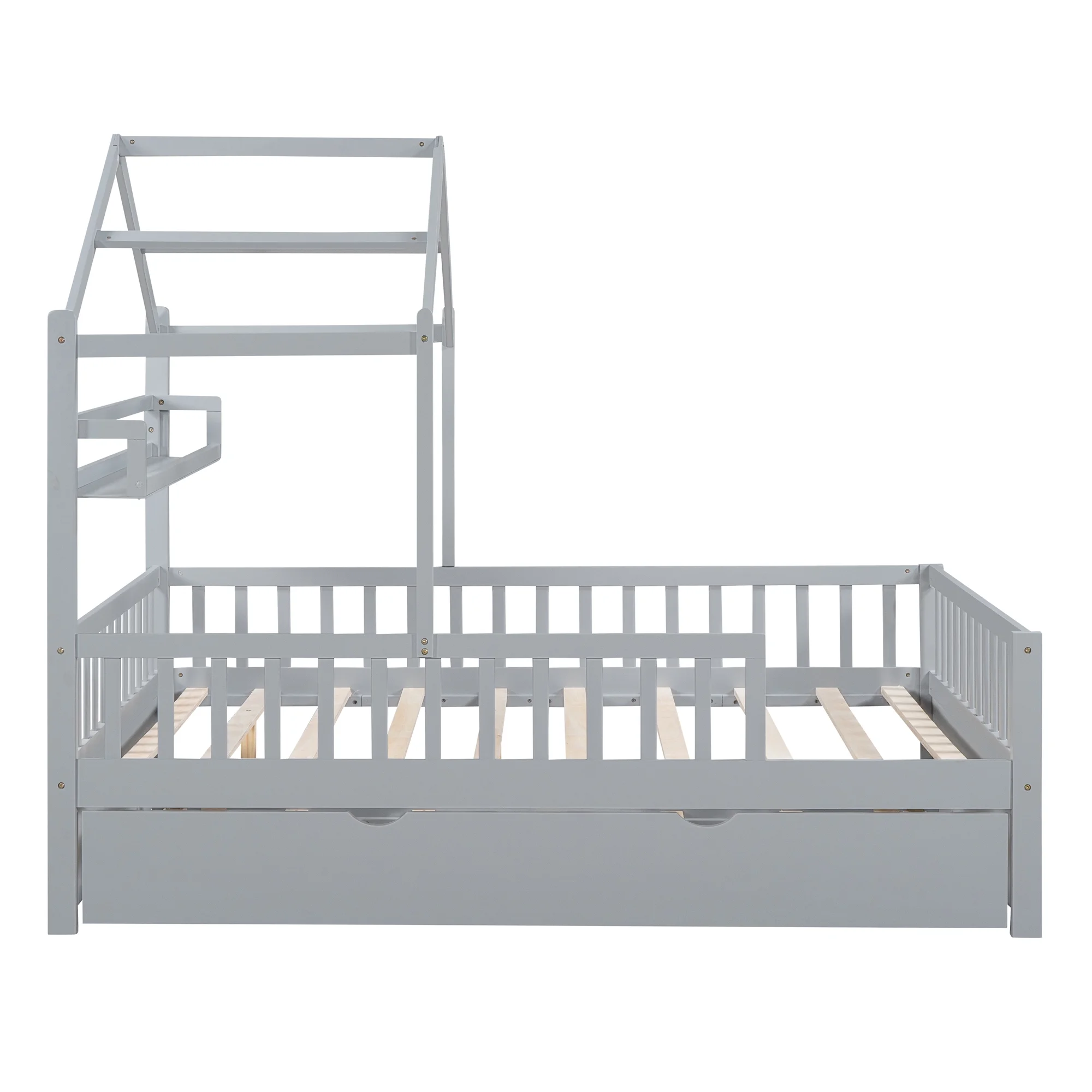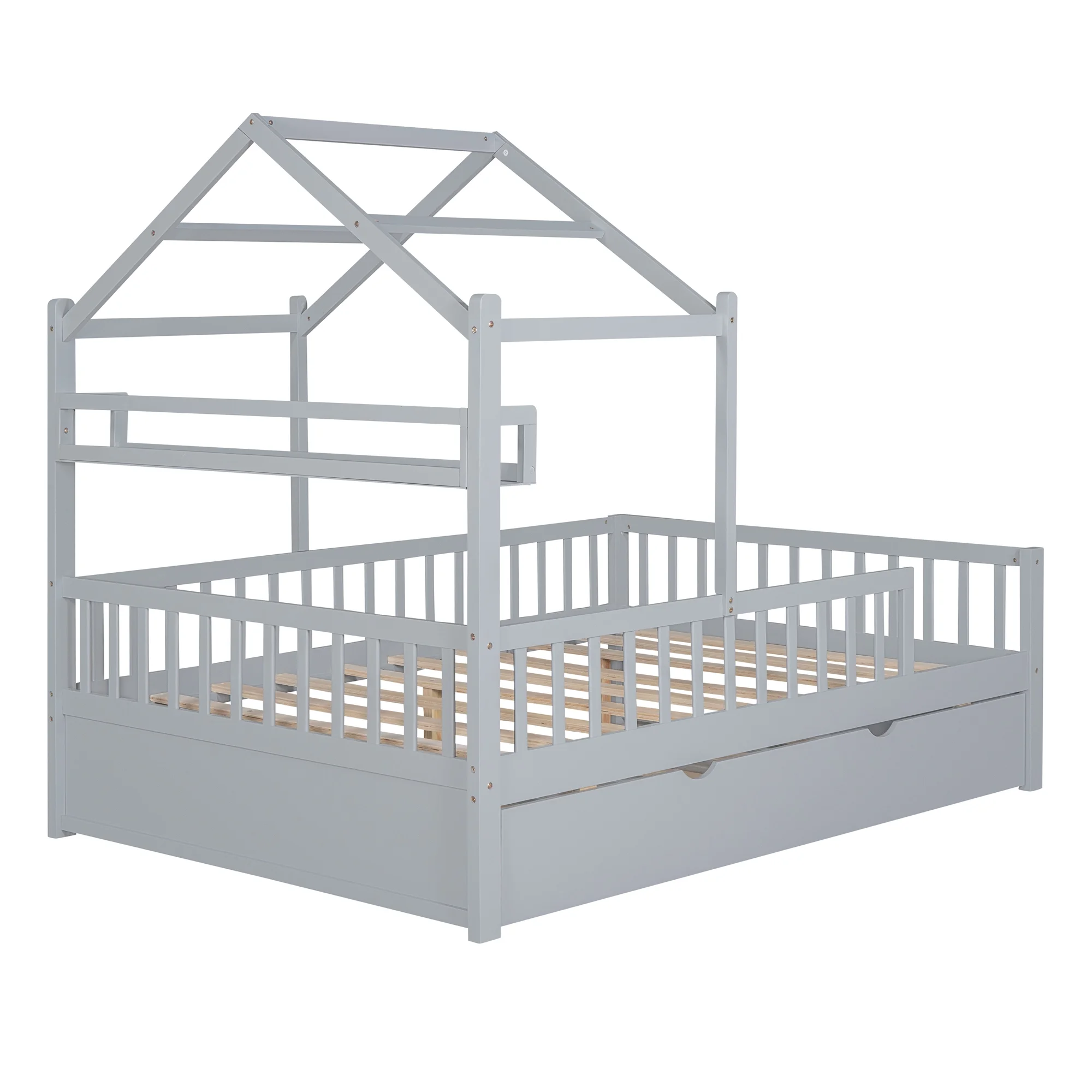Euroco Wood House Platform Bed with Roof and Trundle for Kids Bedroom, Semi-Close House Bed with Roof and Window, Gray
