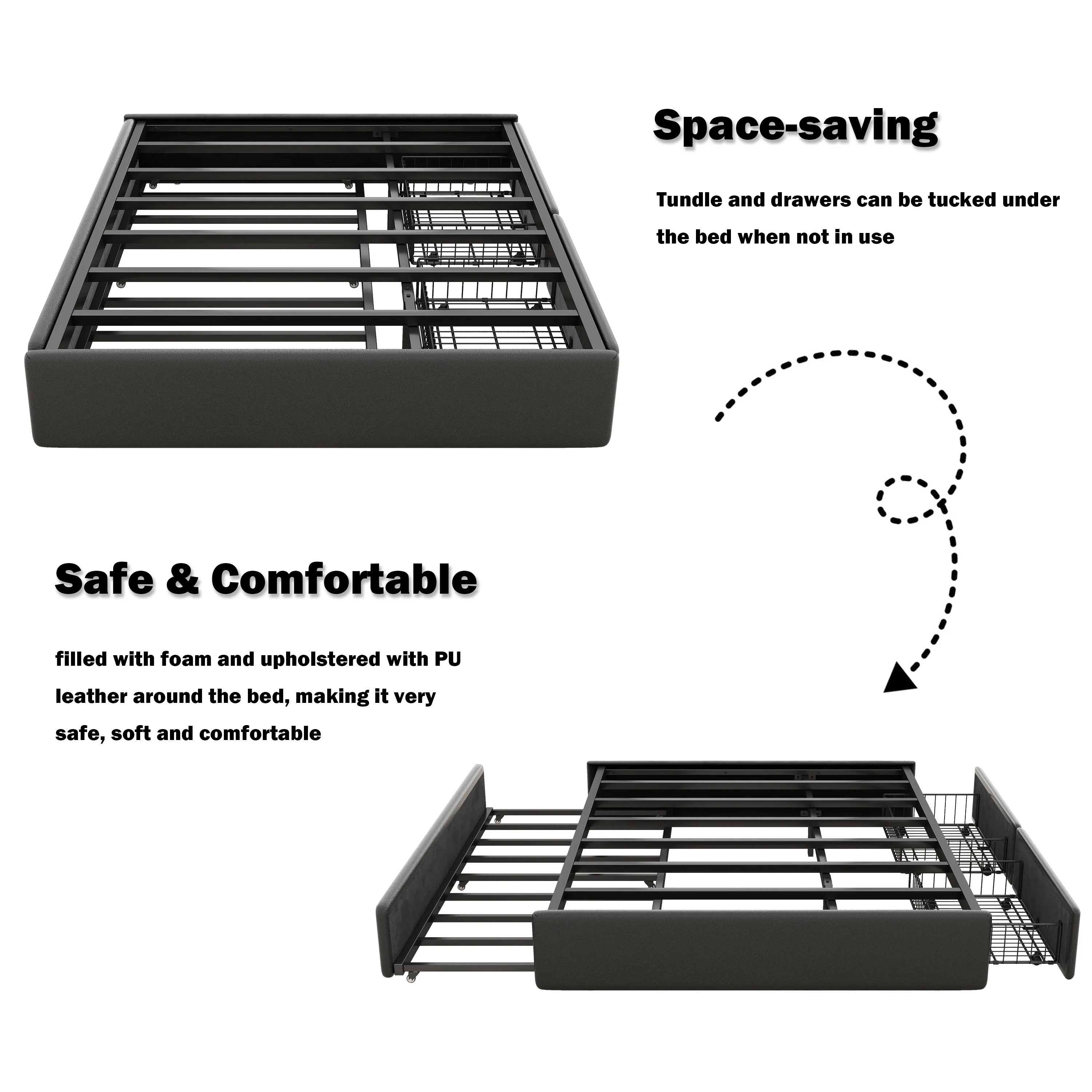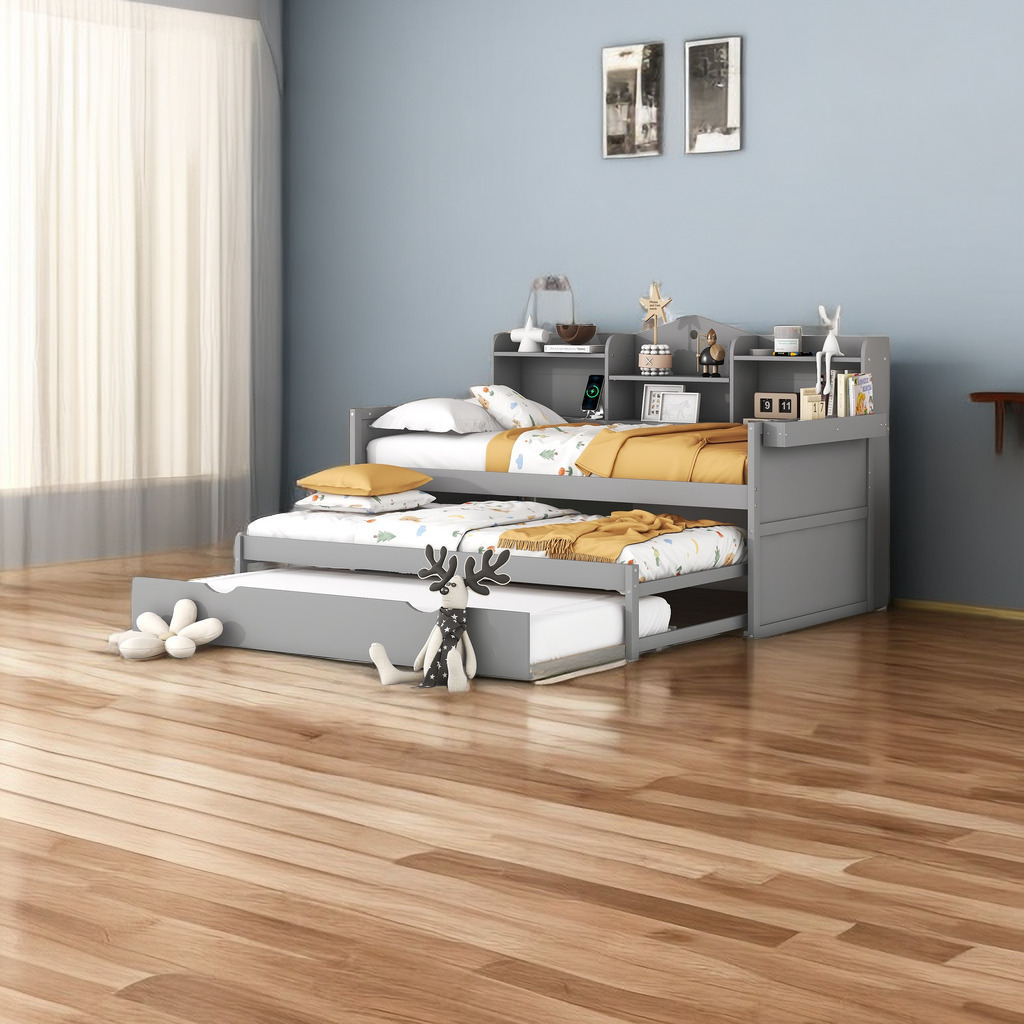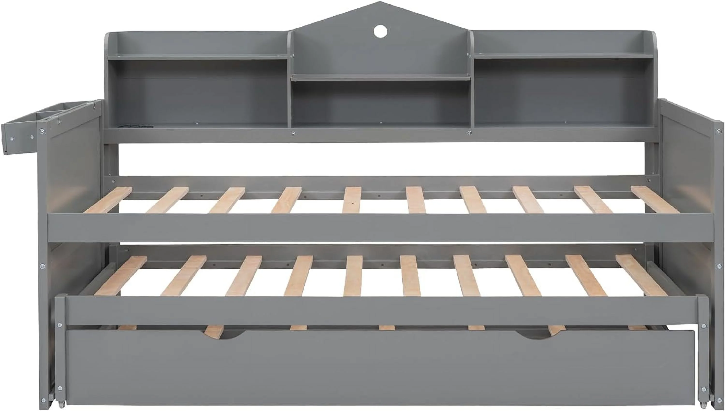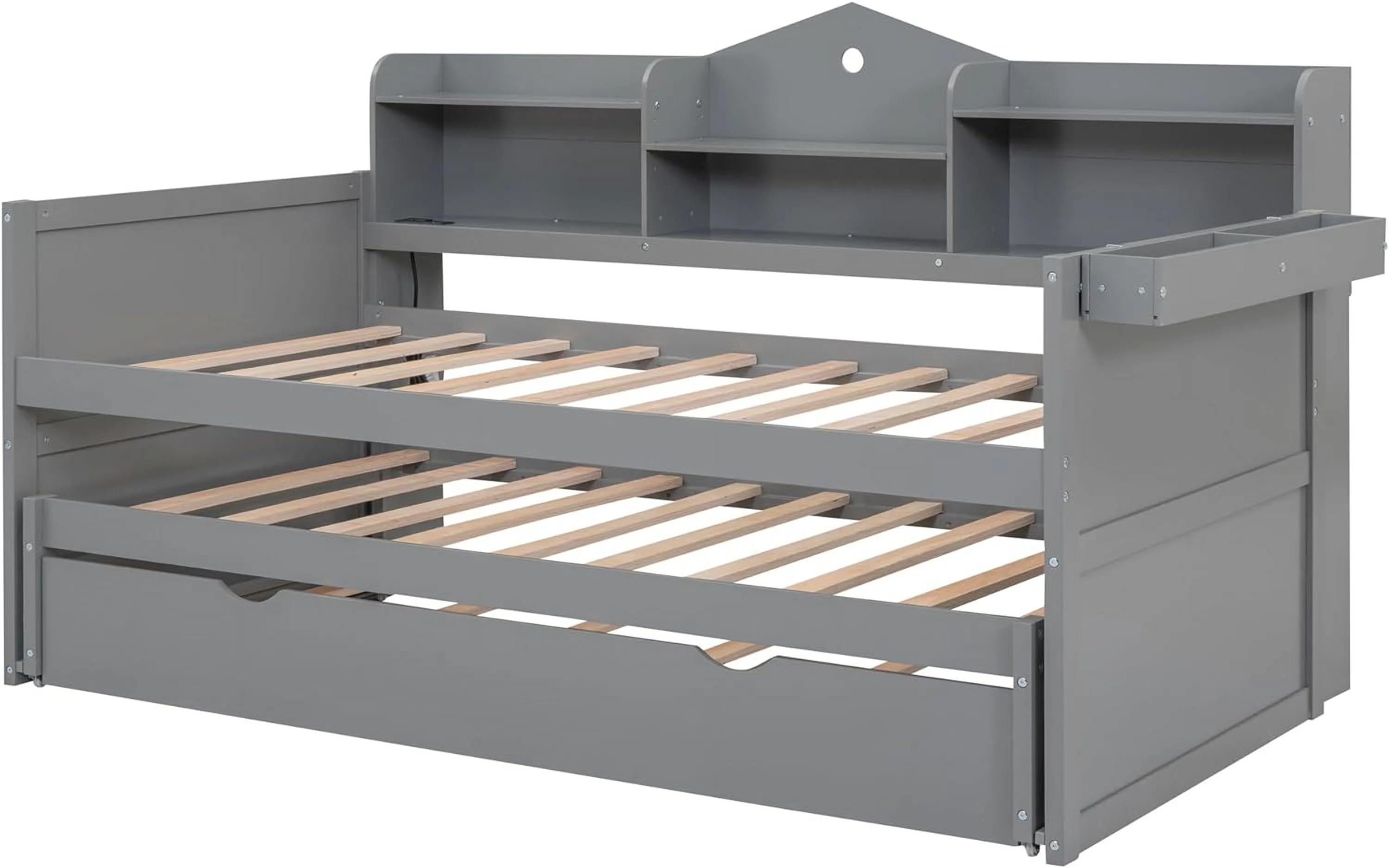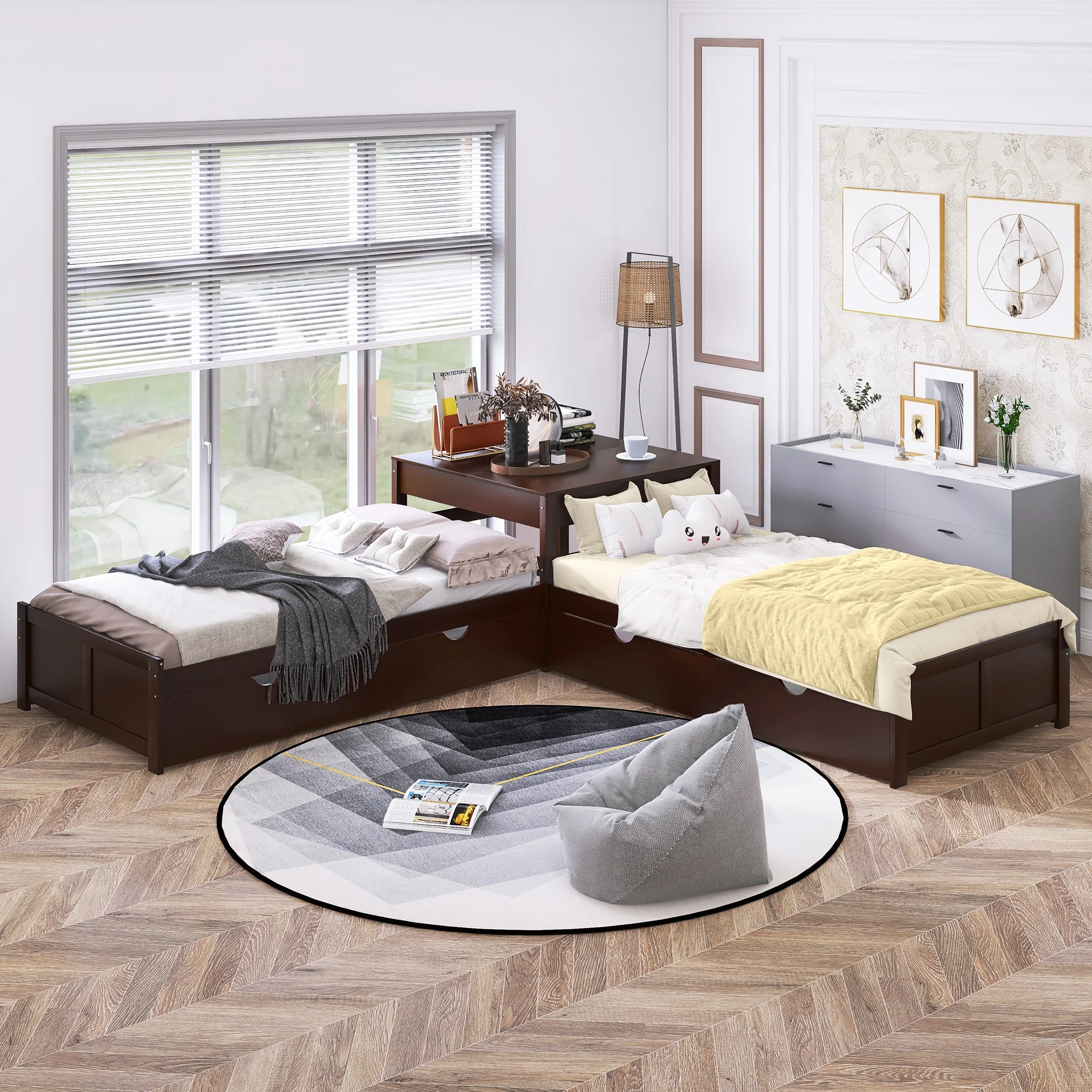 L Shaped Platform Bed with Two Trundles, Wooden Twin Corner Bed with Built-in Square Table for Kids Teens Adults
