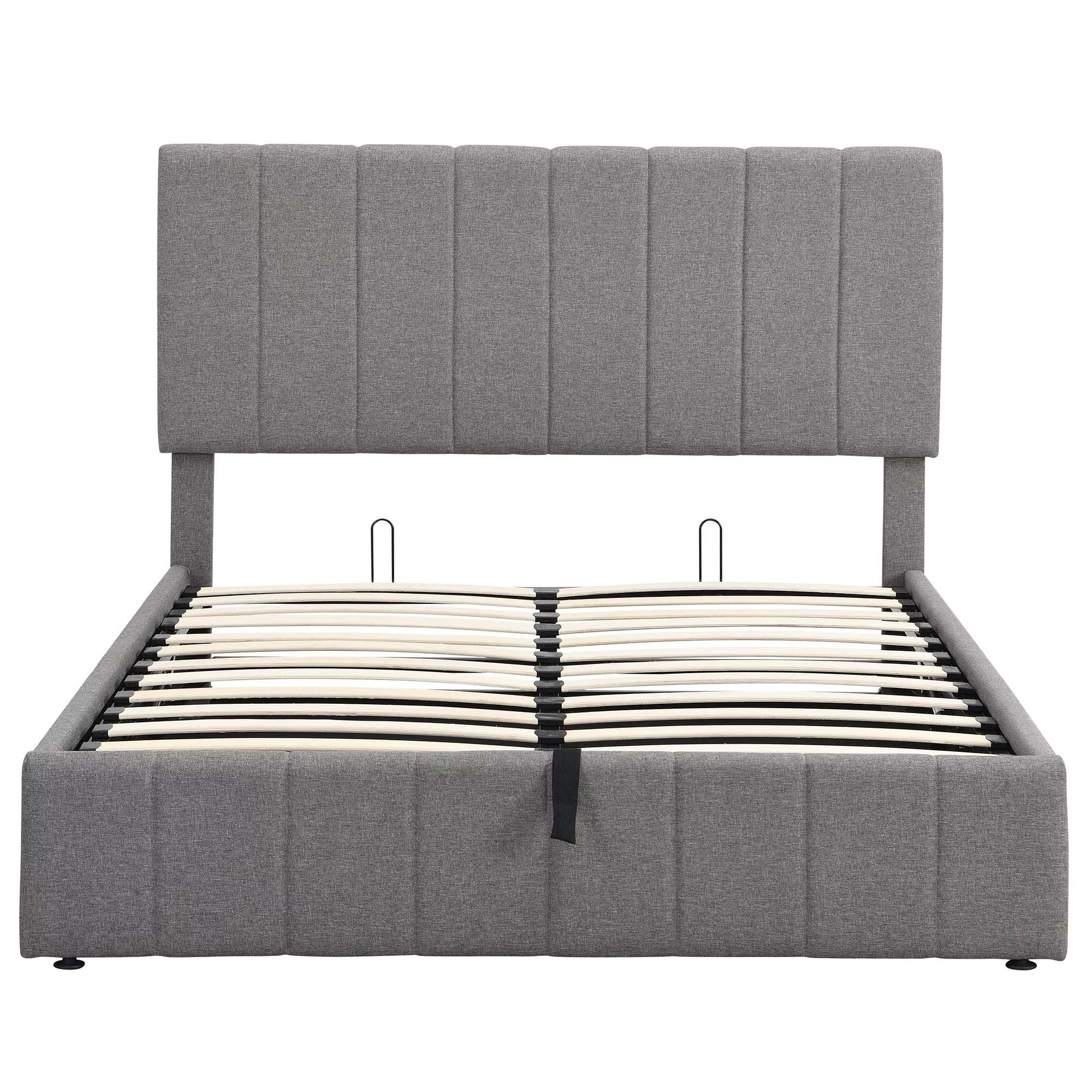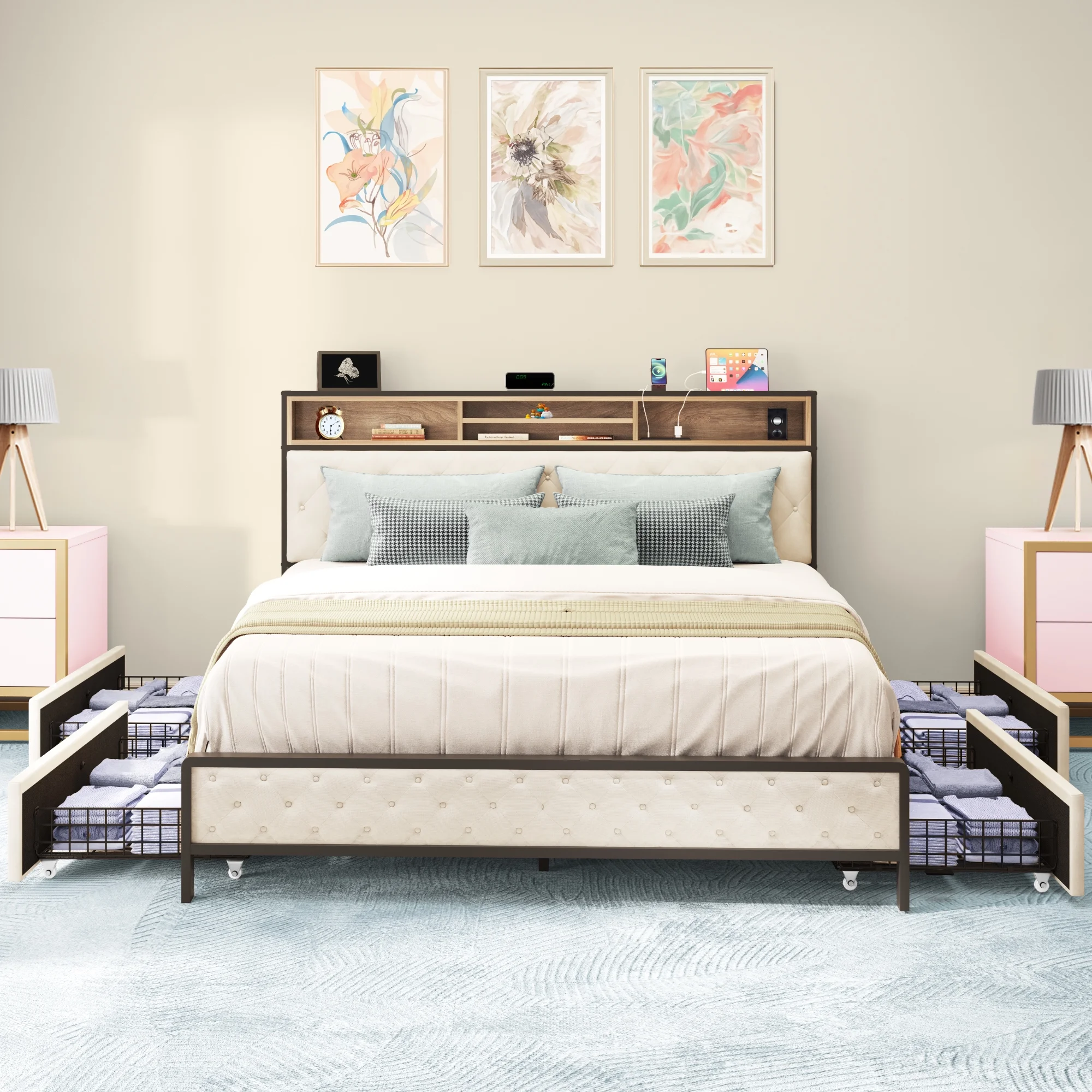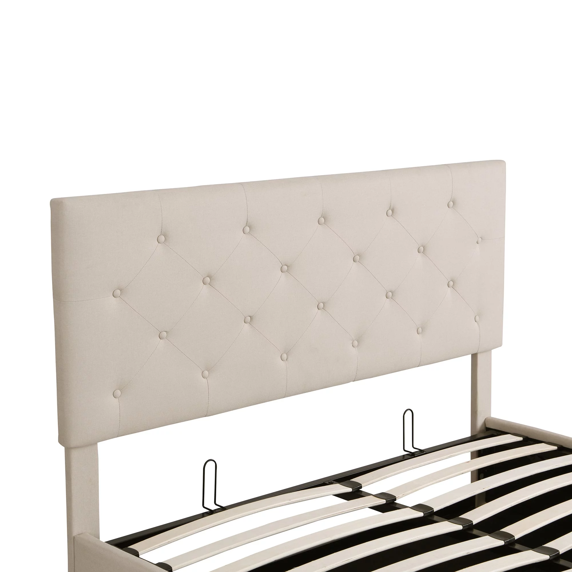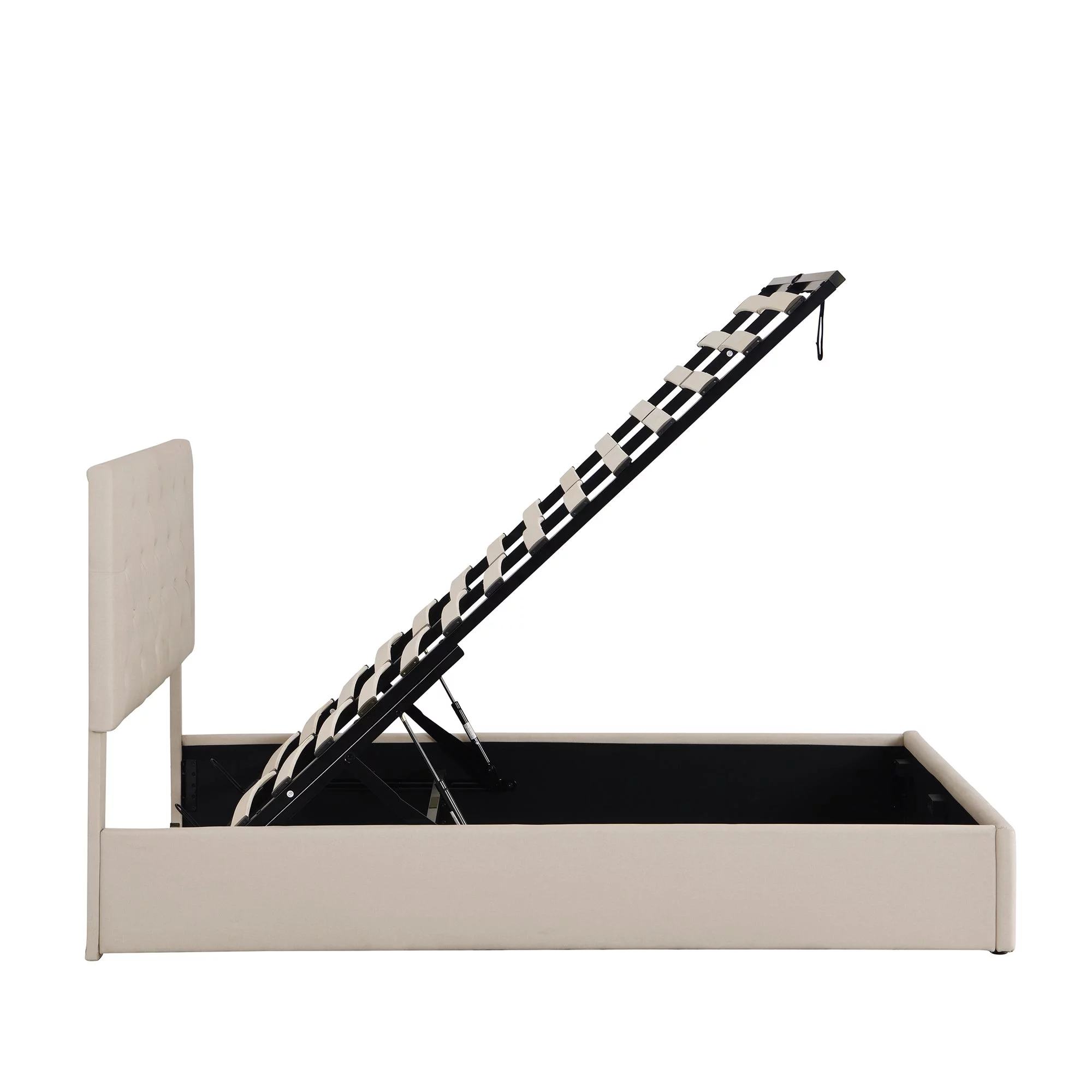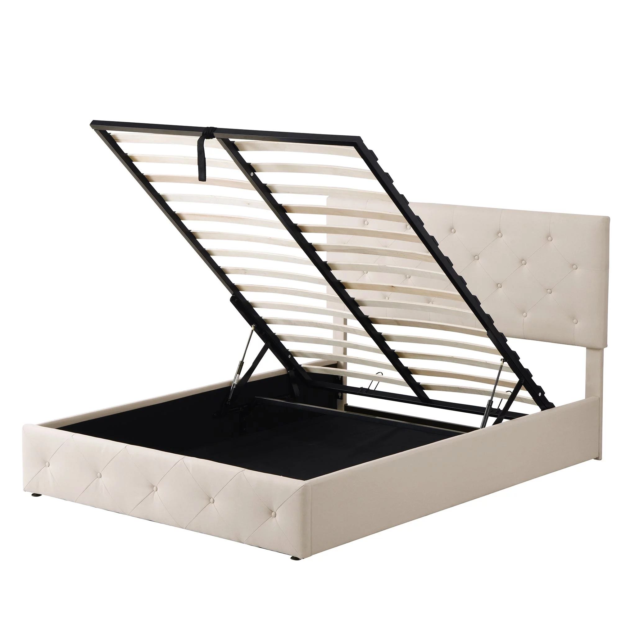 Regal Restful Retreat - Beige Upholstered Platform Bed with Hydraulic Storage