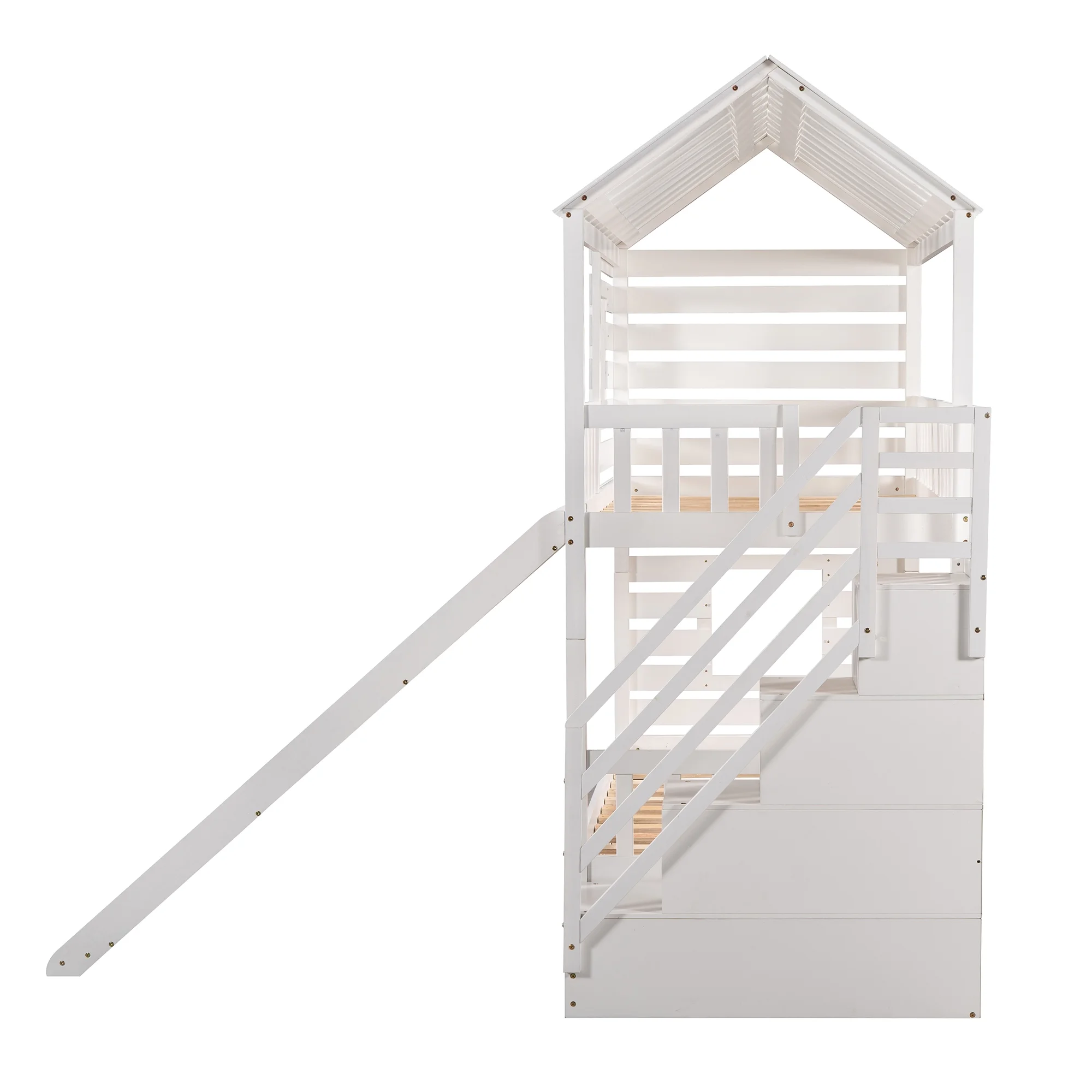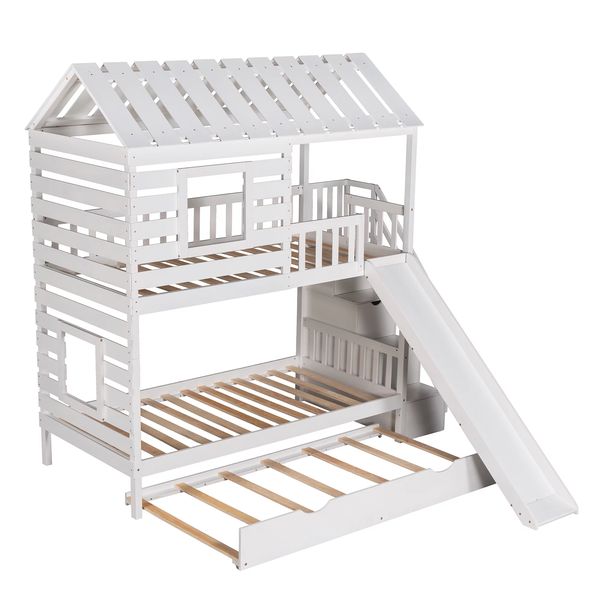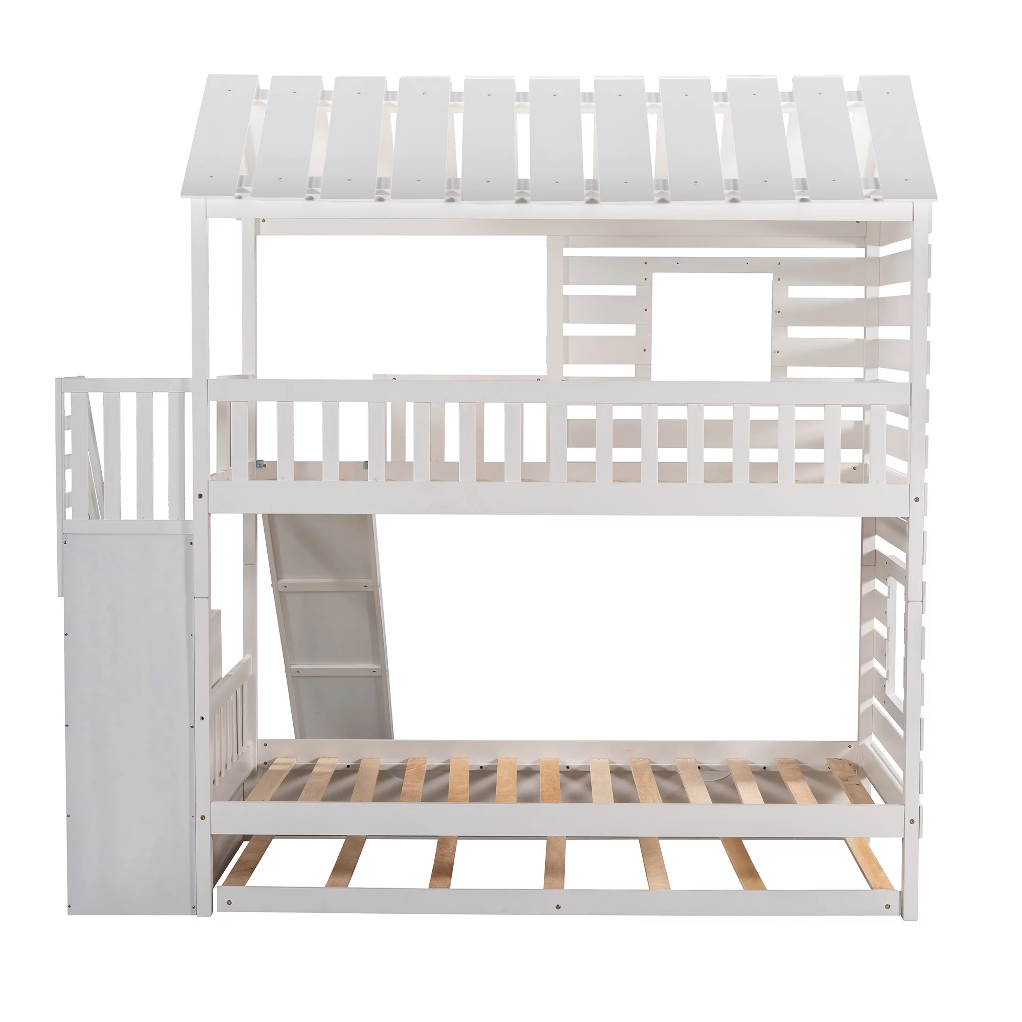 LANTRO JS Twin over Twin House Bunk Bed with Trundle and Slide, Storage Staircase,Roof and Window Design, White