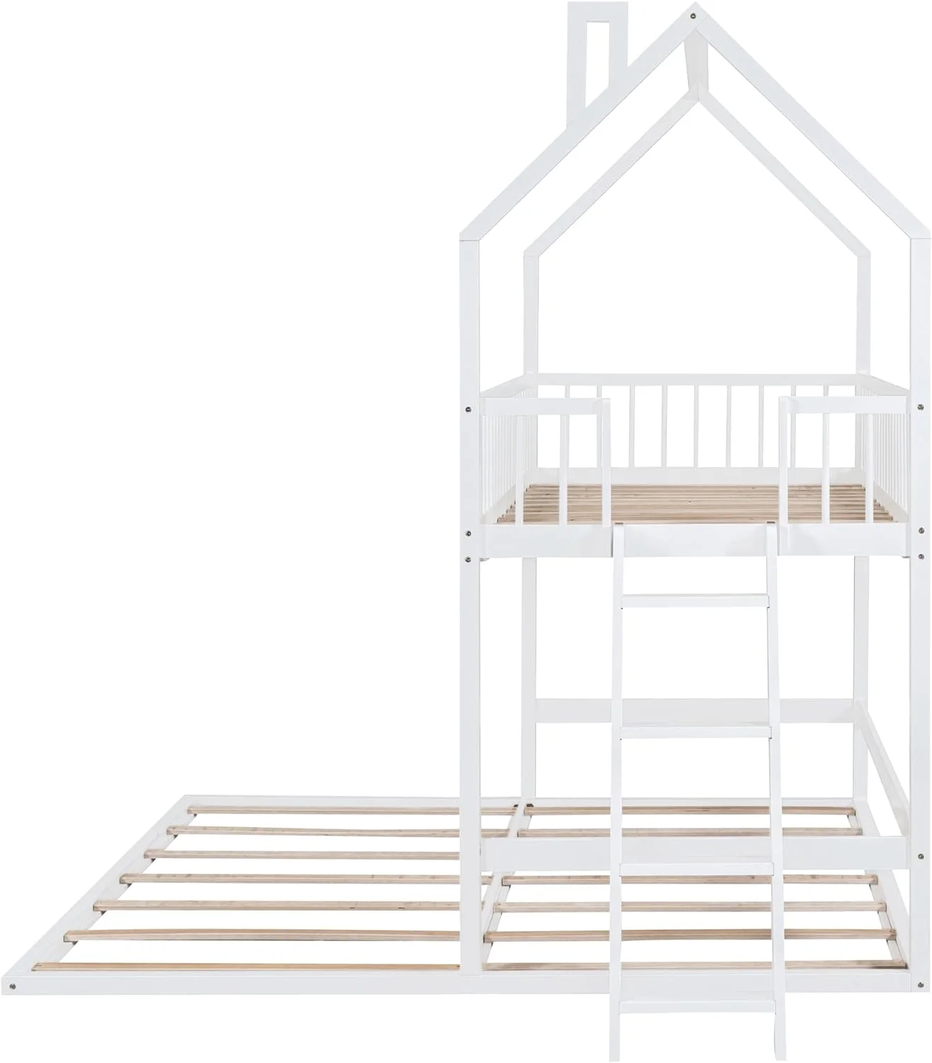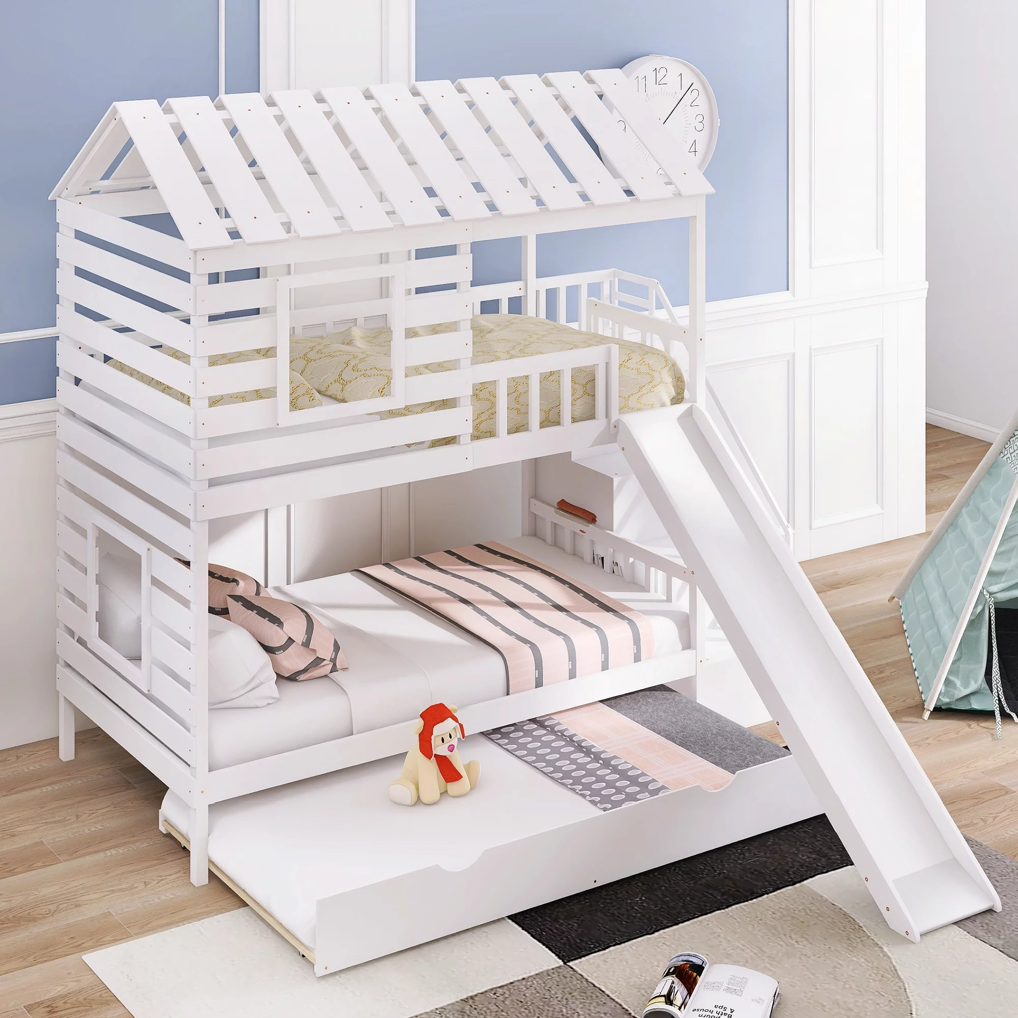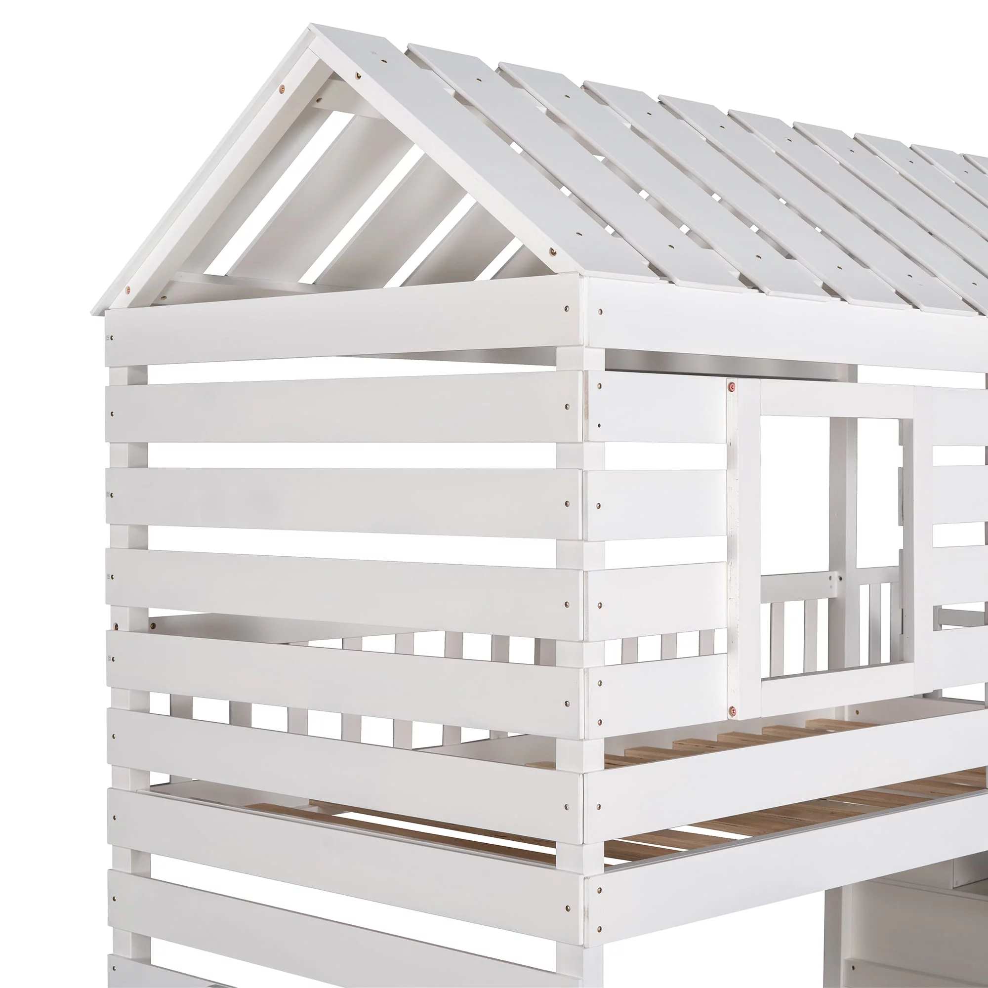 LANTRO JS Twin over Twin House Bunk Bed with Trundle and Slide, Storage Staircase,Roof and Window Design, White