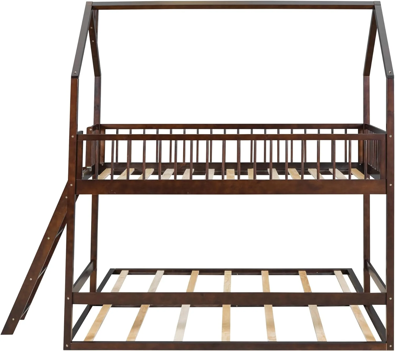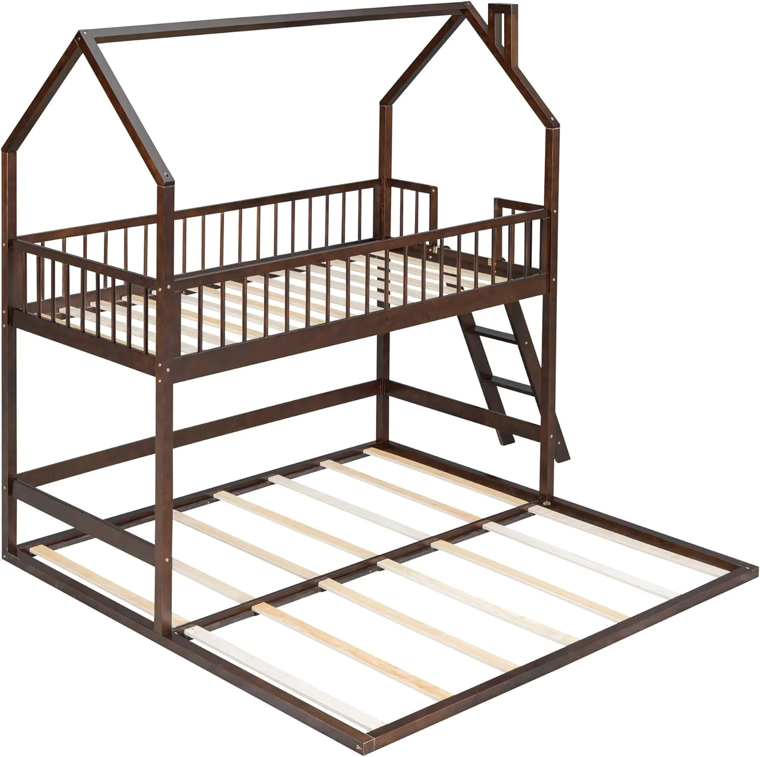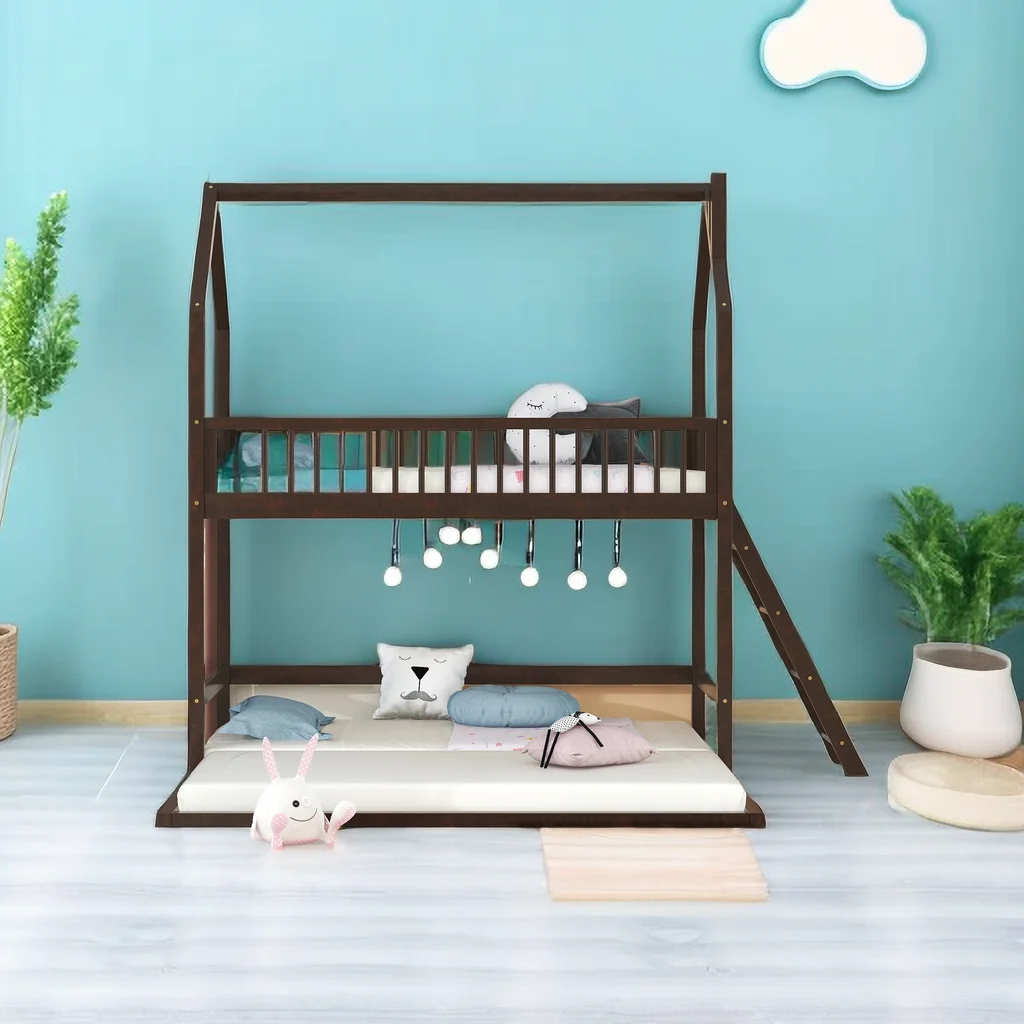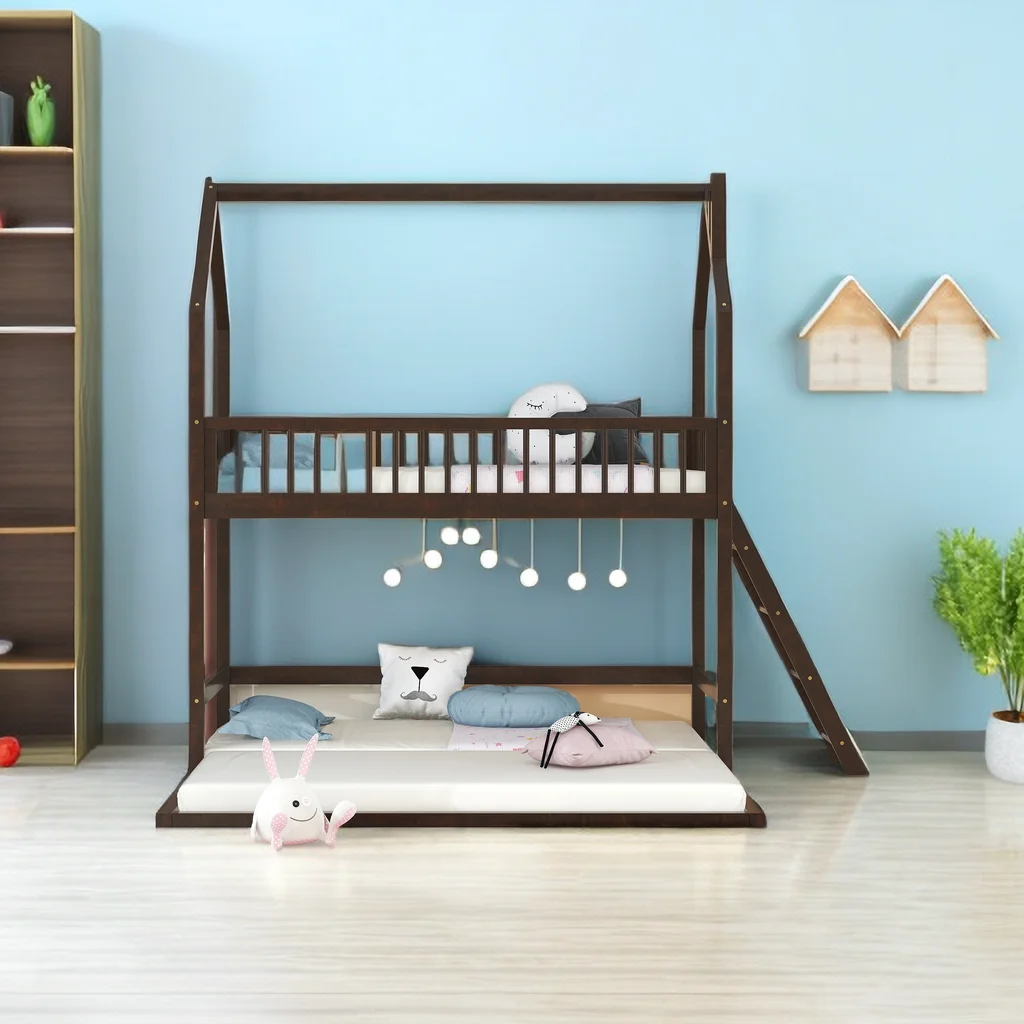 Twin Over Twin House Bunk Bed with Extending Trundle and Ladder, Wooden Bunk Bed Frame for Kids Teens Girls Boys