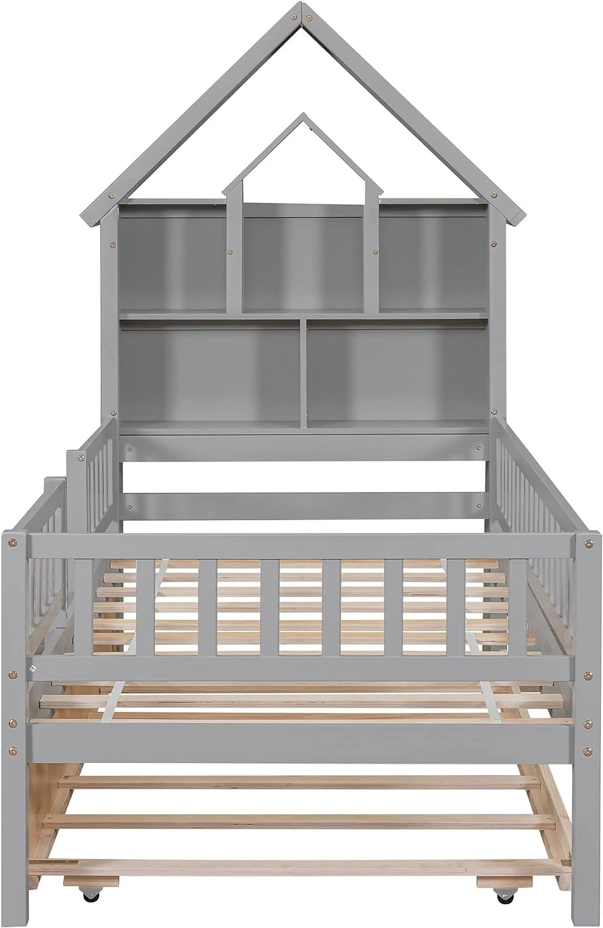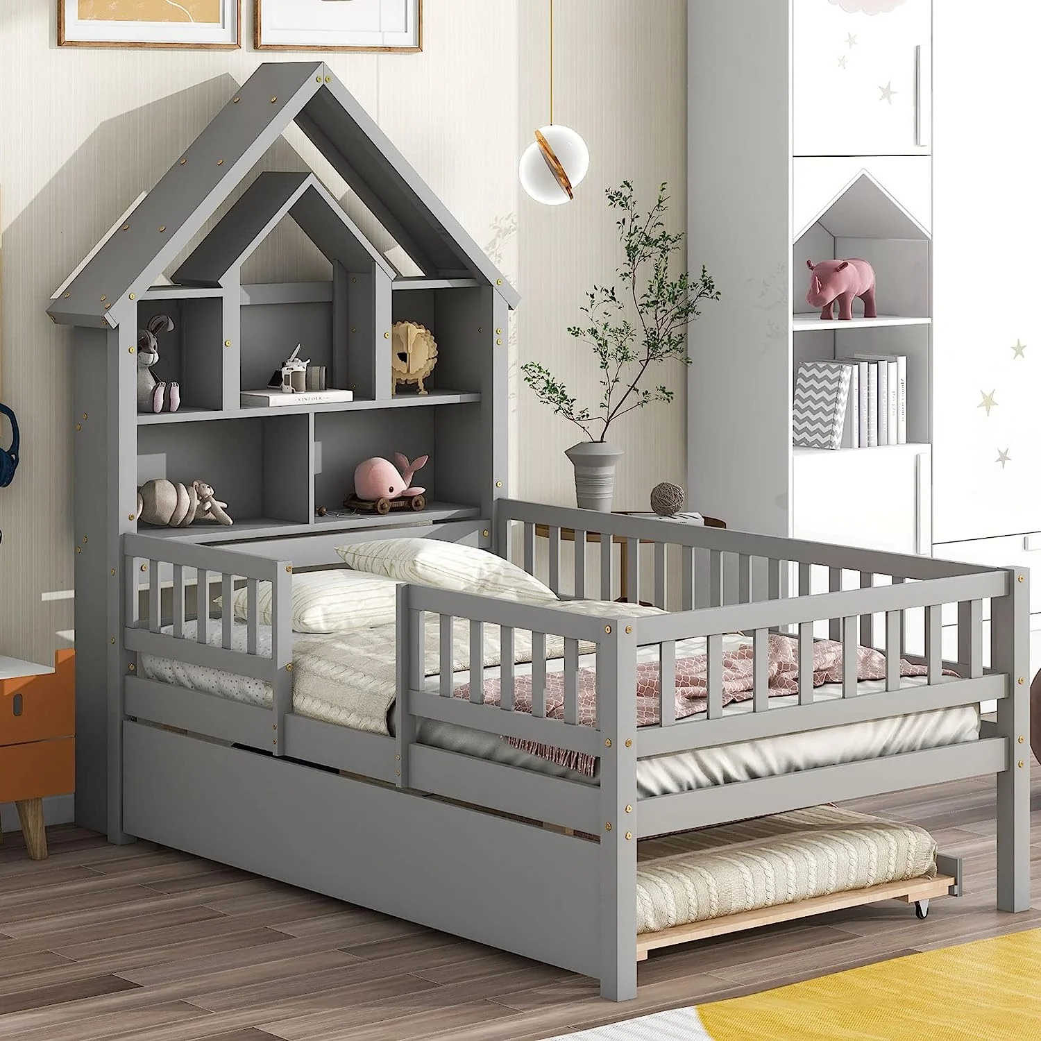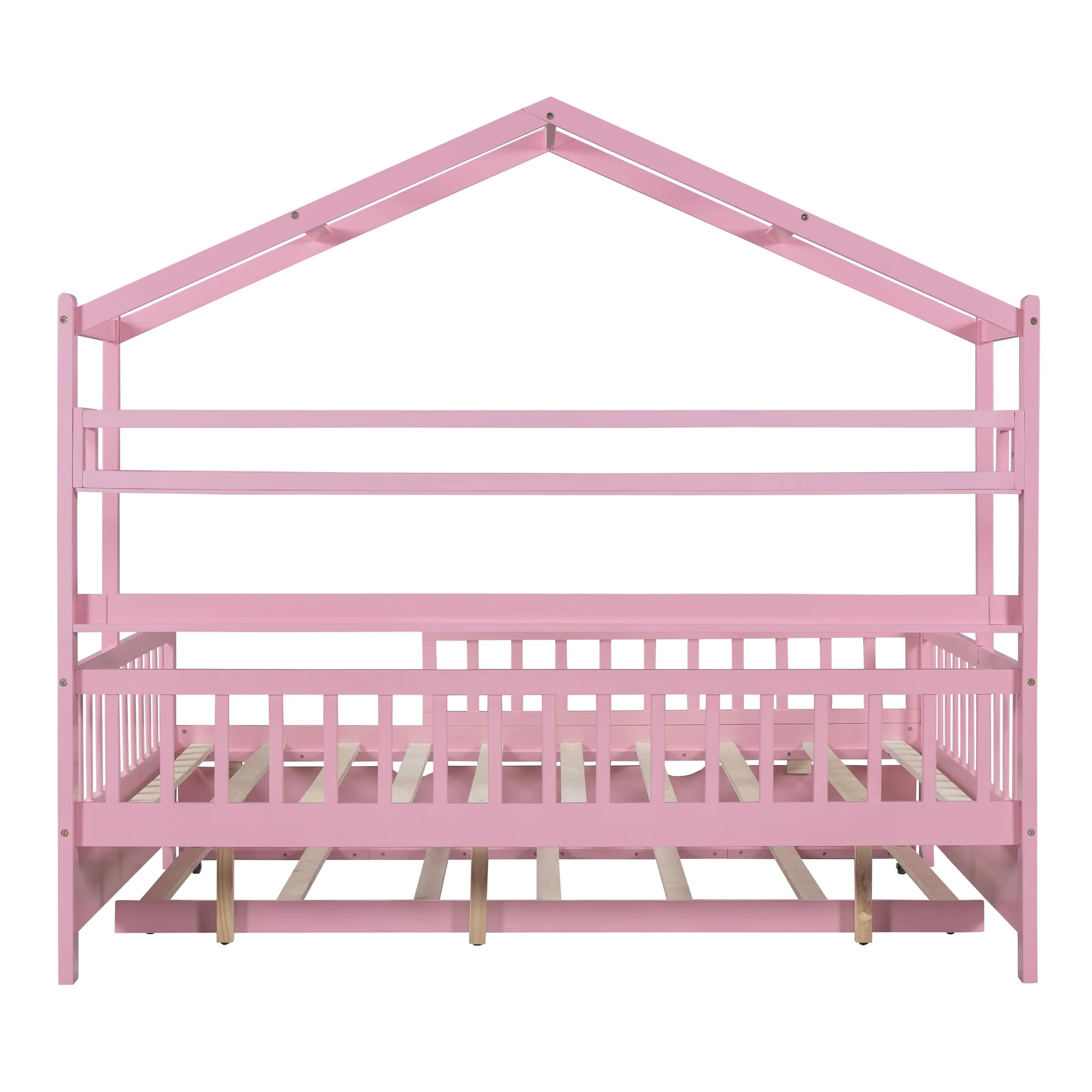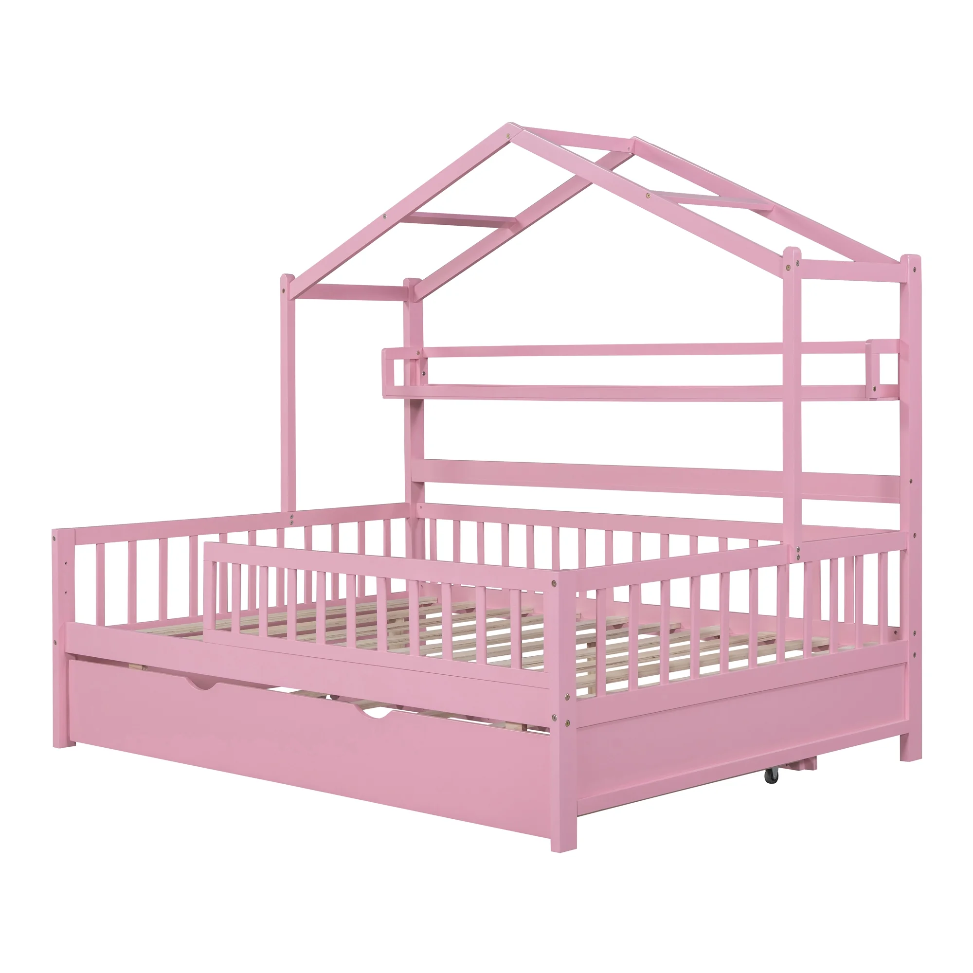 Full Size House Bed with Twin Size Trundle - Wooden Kids Bed with Shelf, Ideal for a Cozy and Imaginative Bedroom-Pink