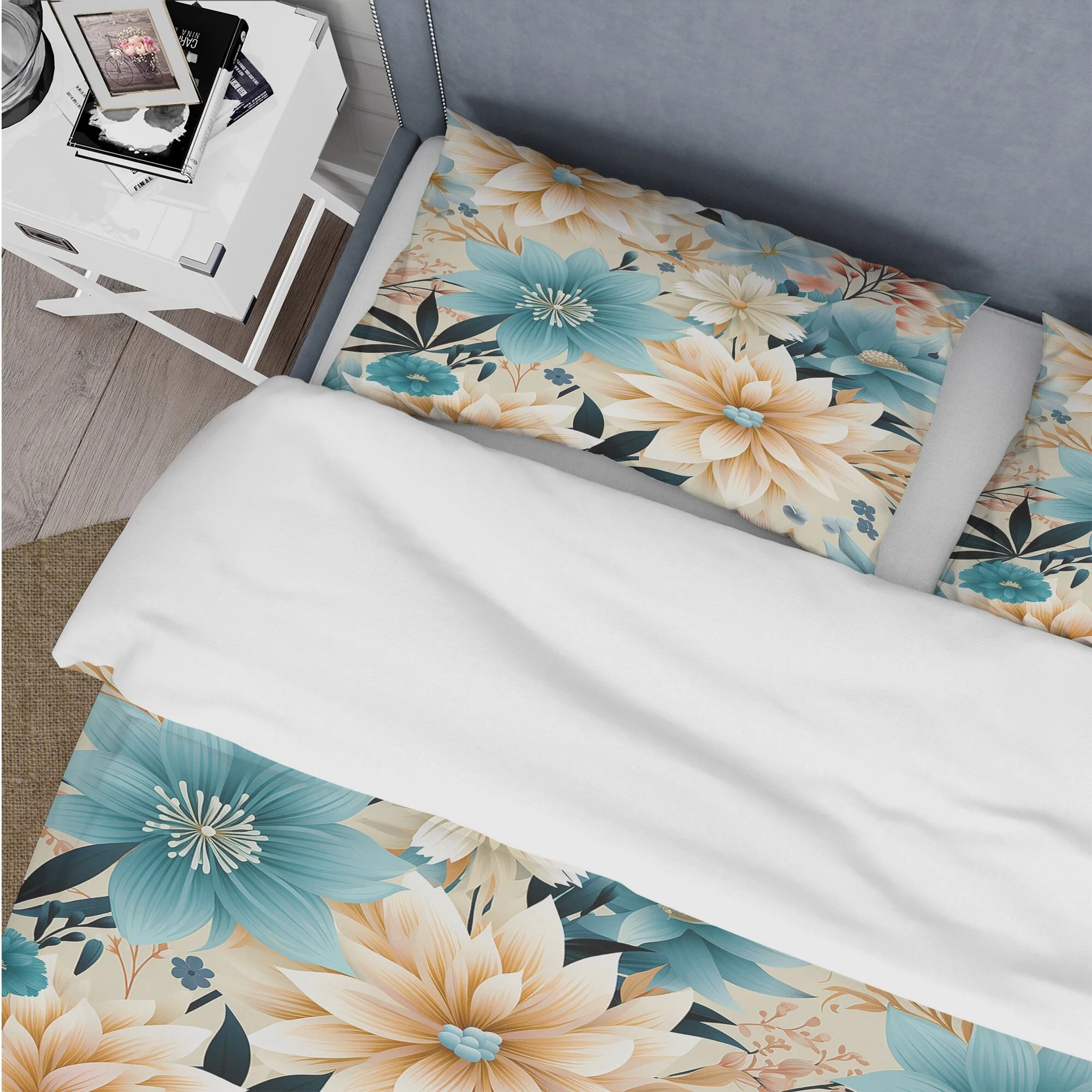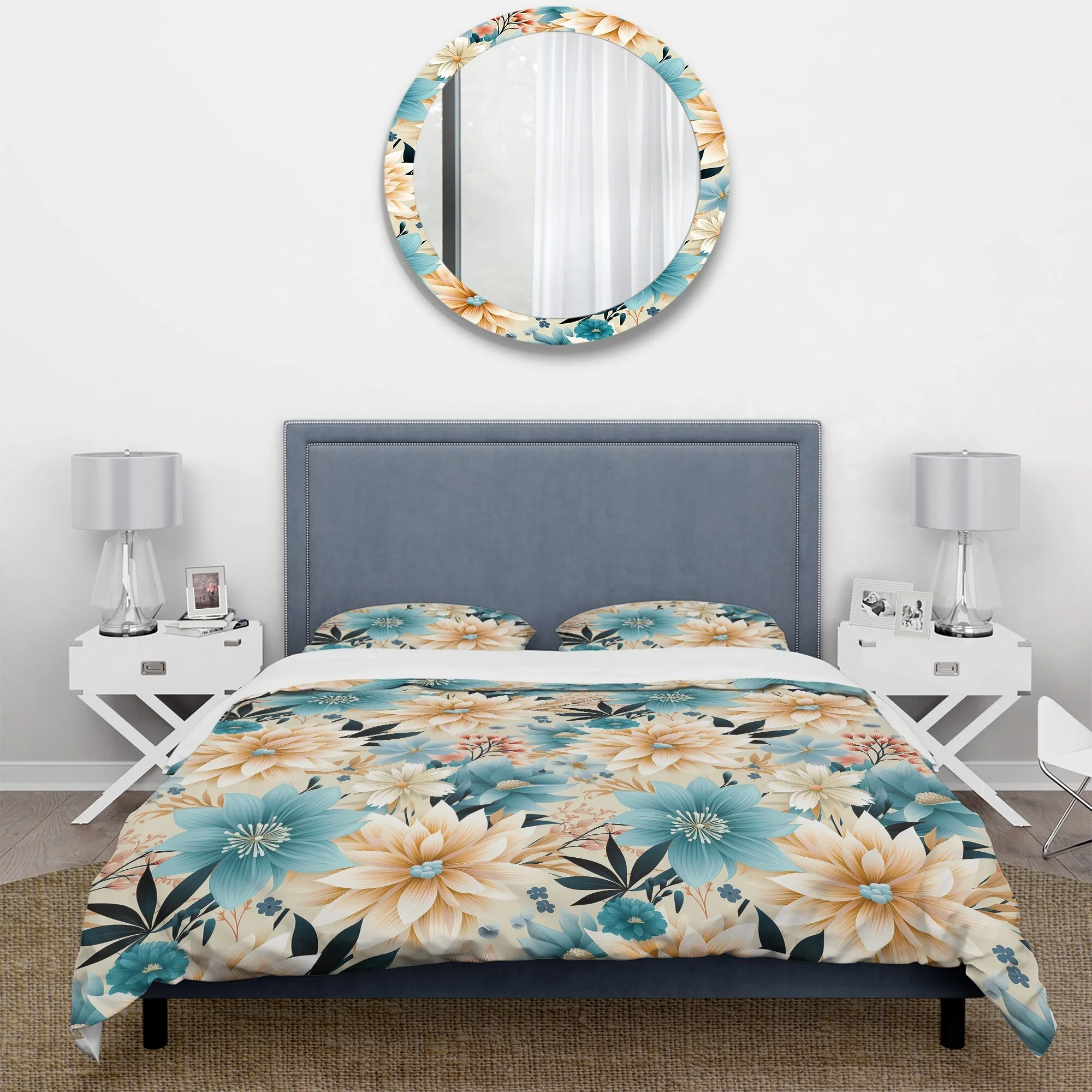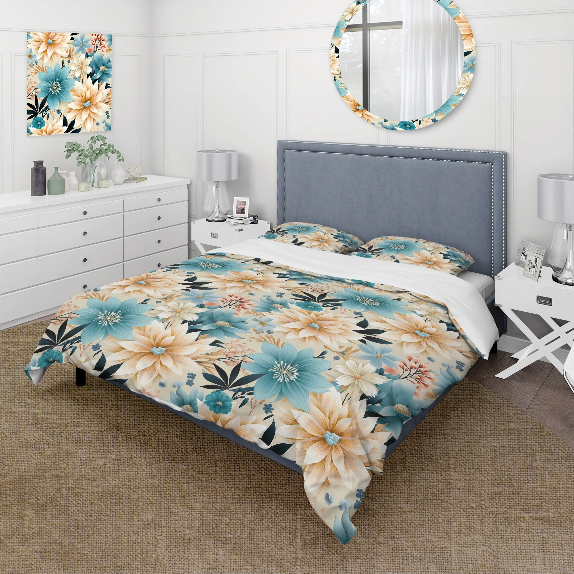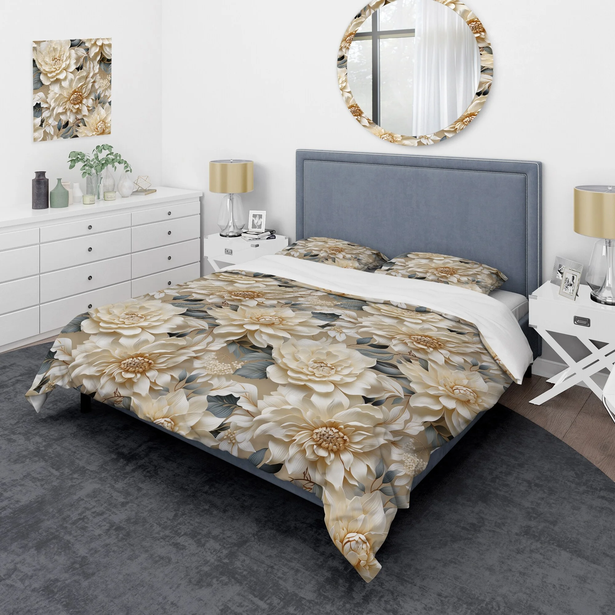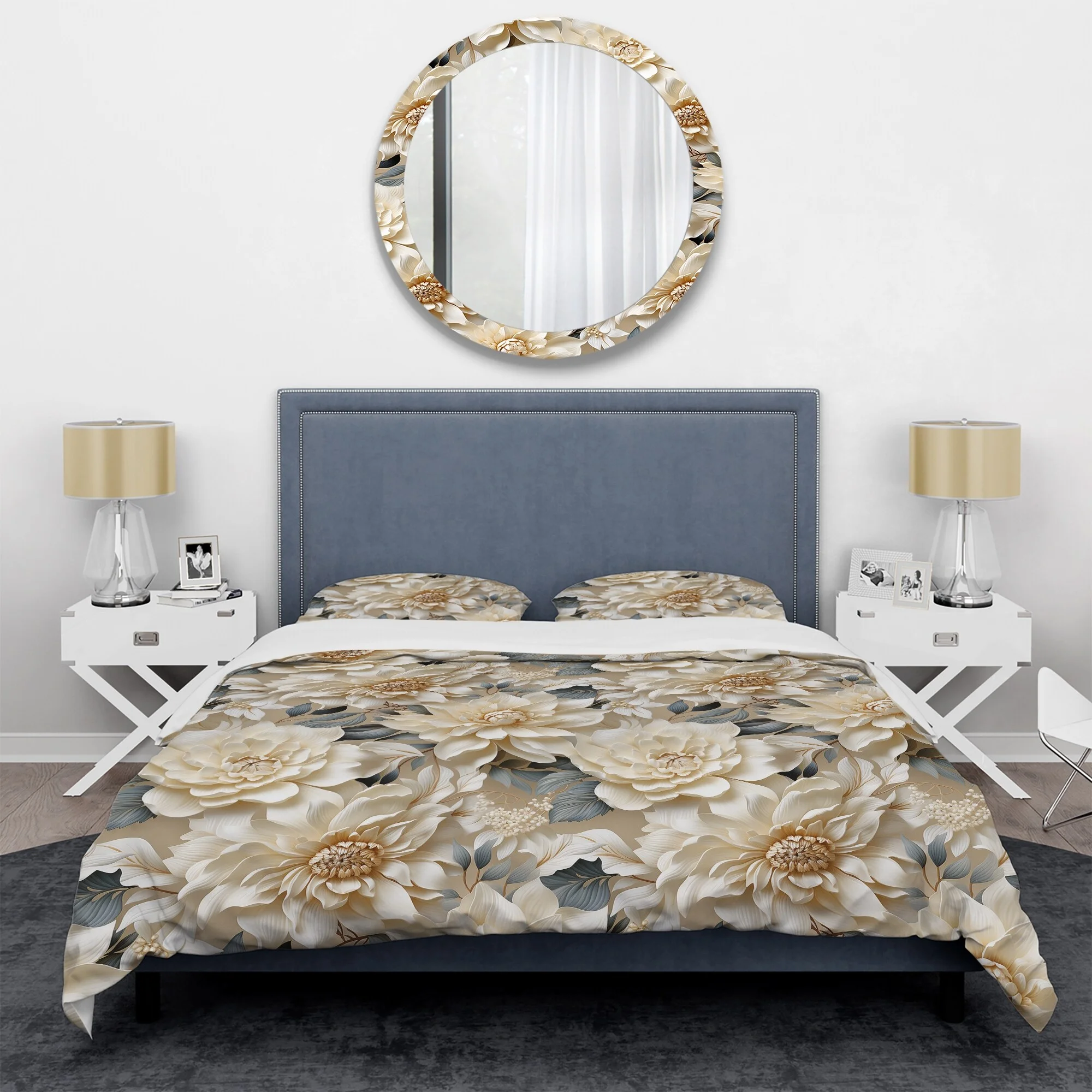 Designart "Chrysanthemum Mandala Serenity V" White Floral Bedding Covert Set - Cottage Bed Set With 1 Sham