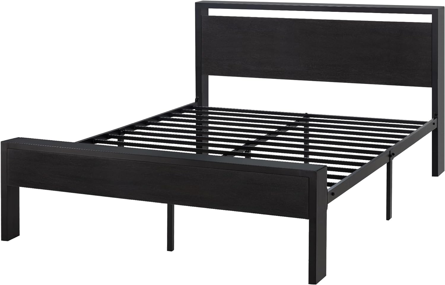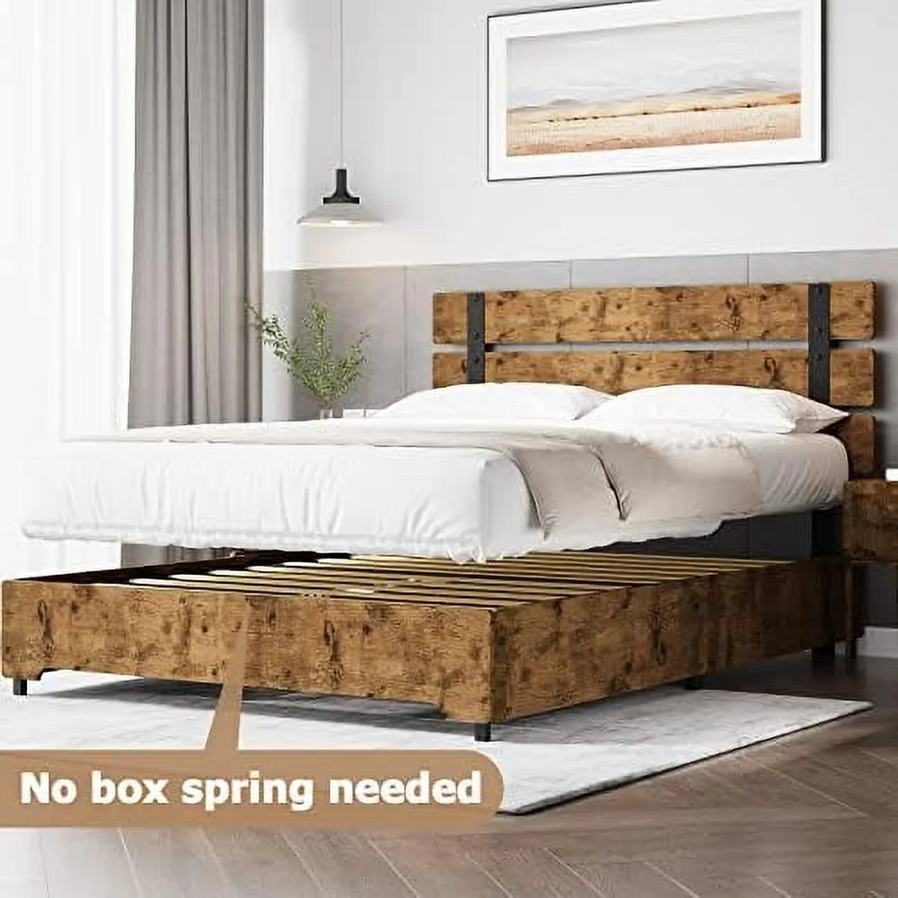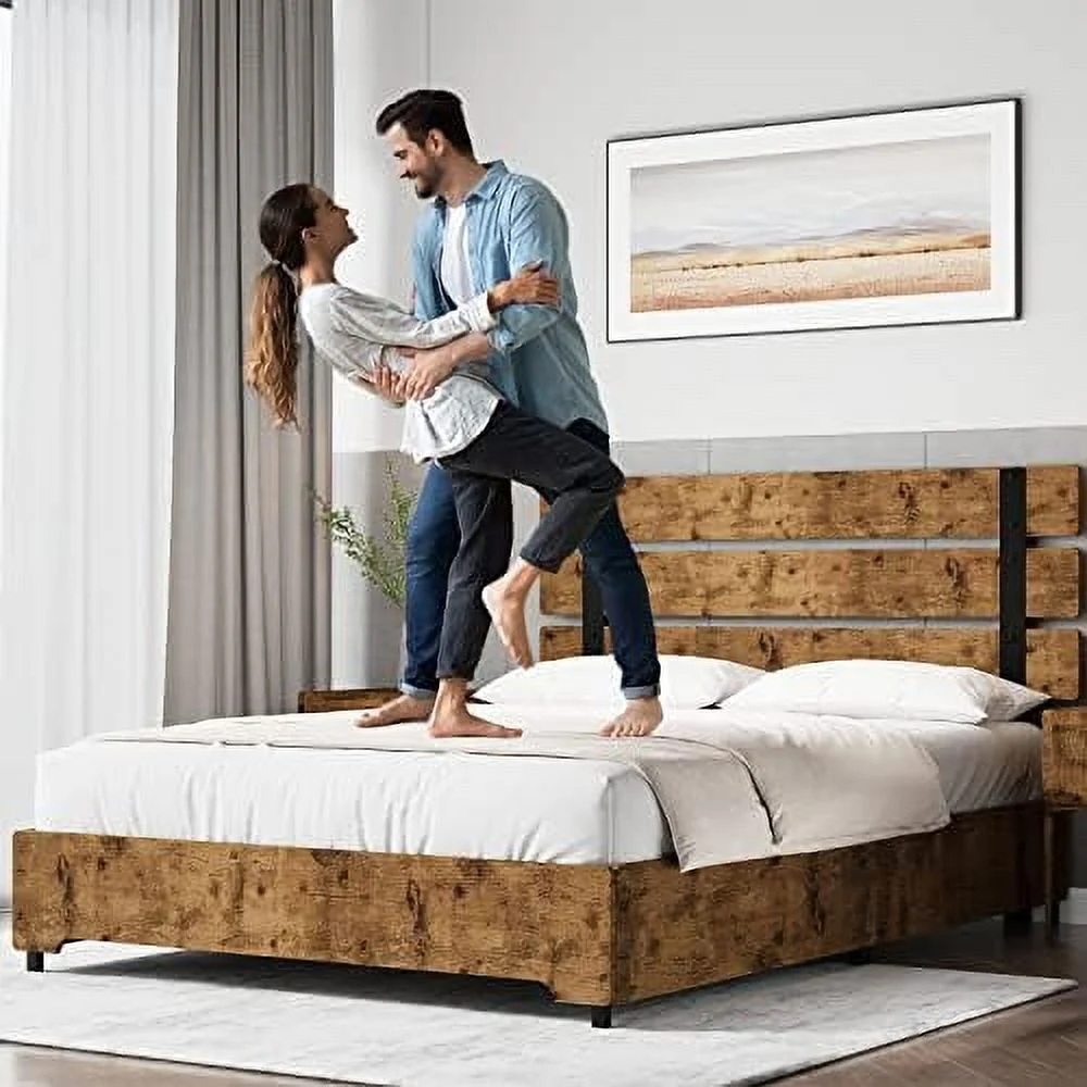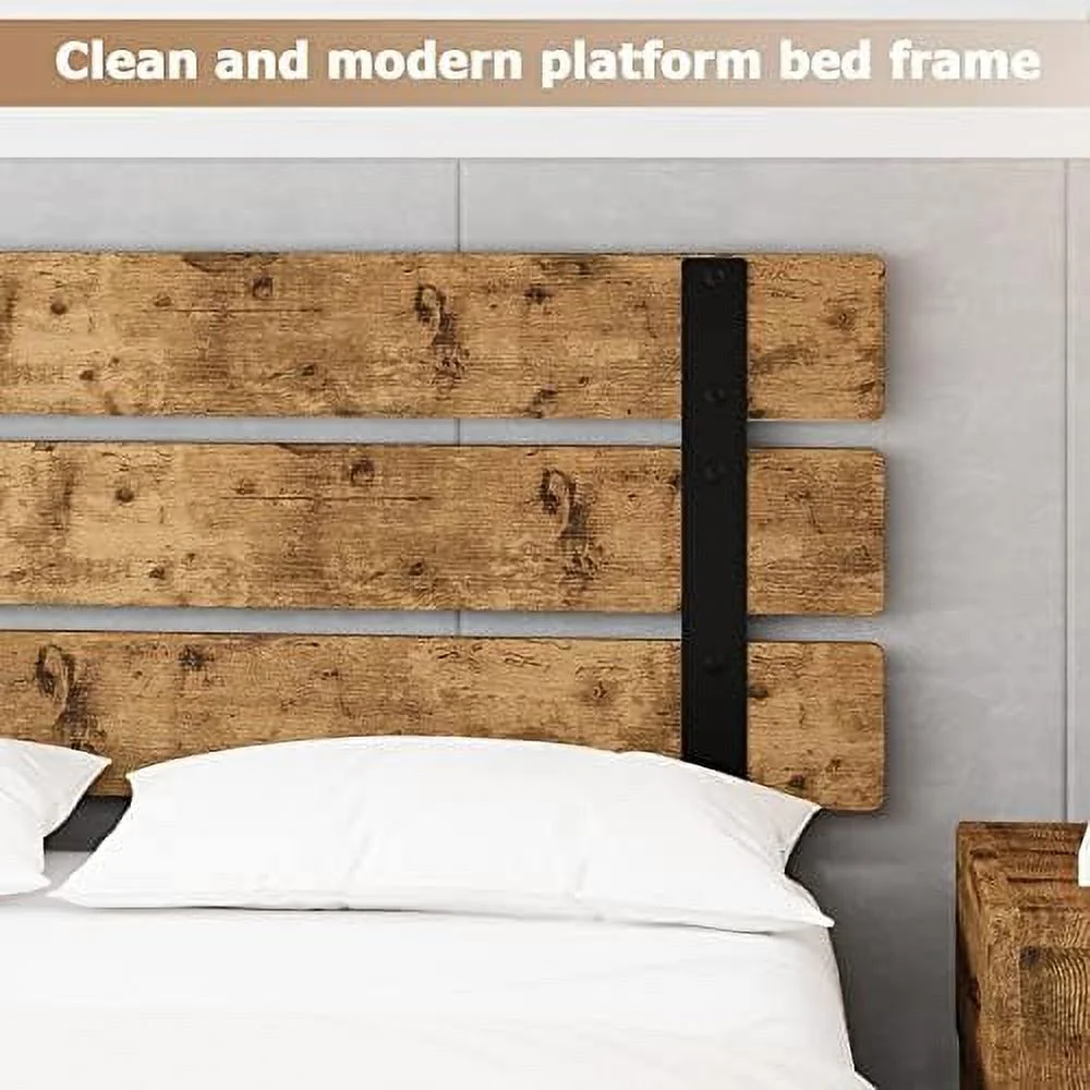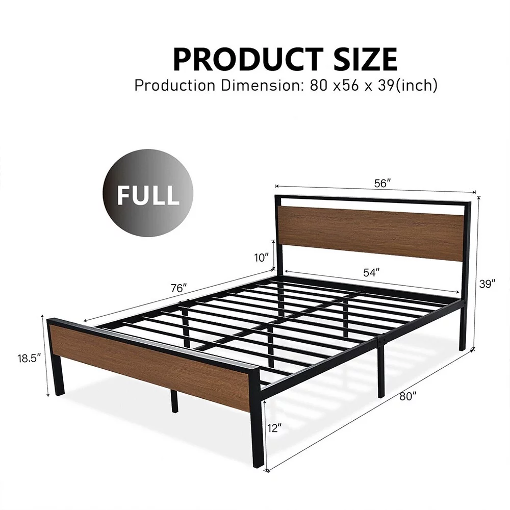 Full Metal Platform Bed Frame with Wooden Headboard Footboard, Walnut