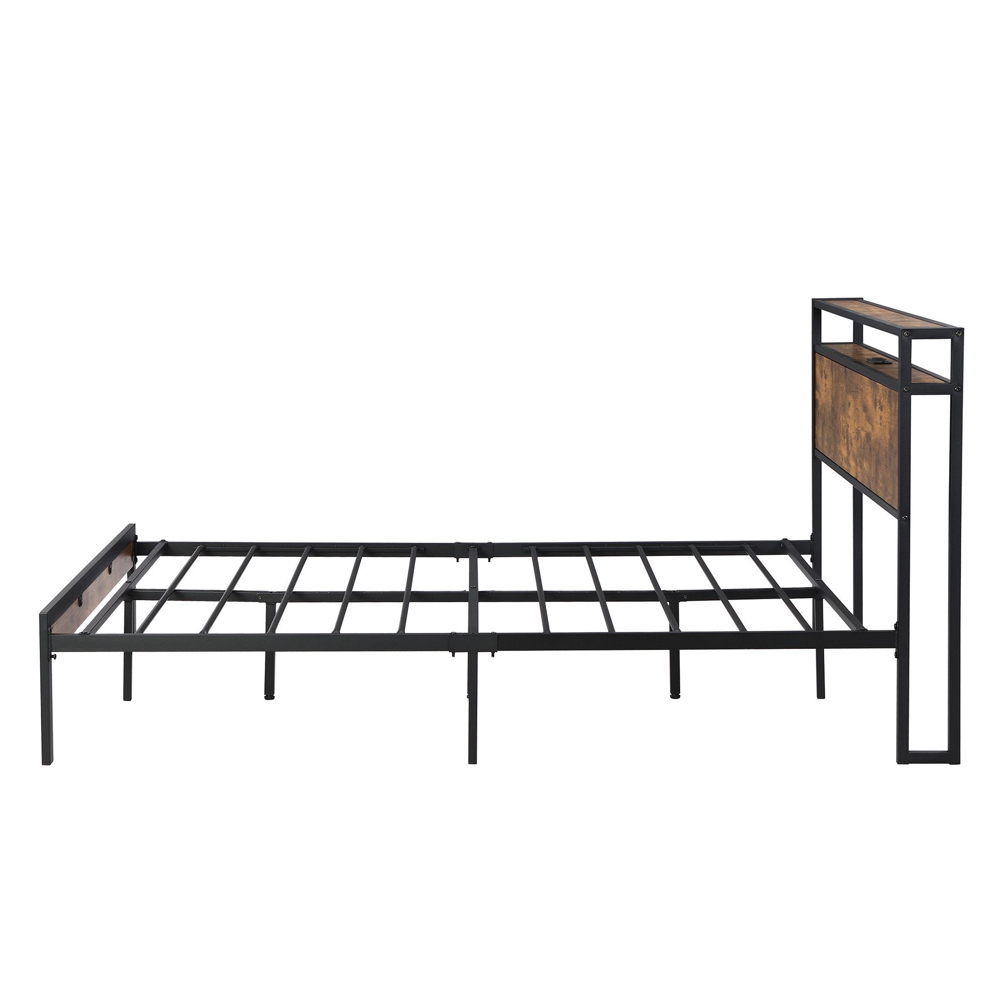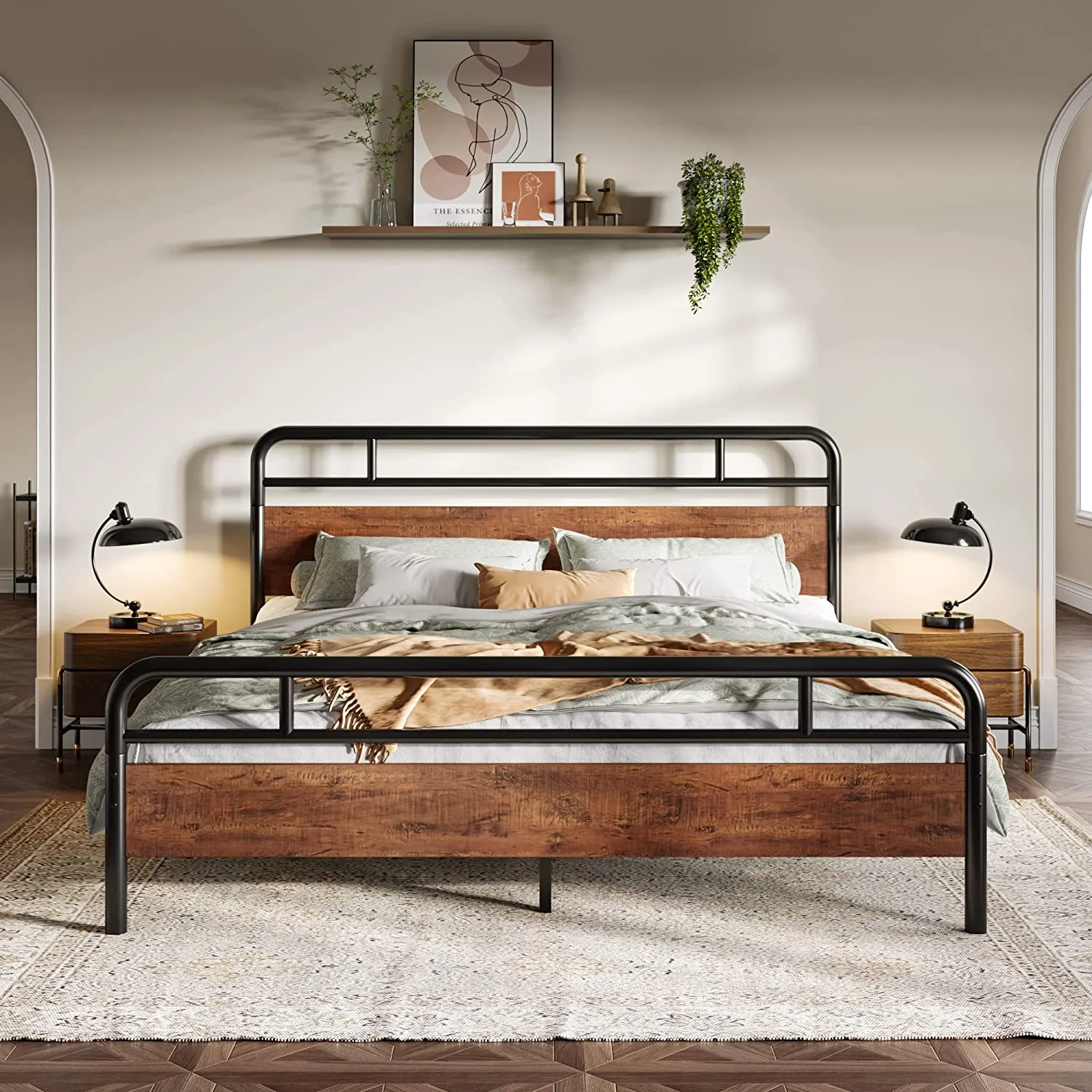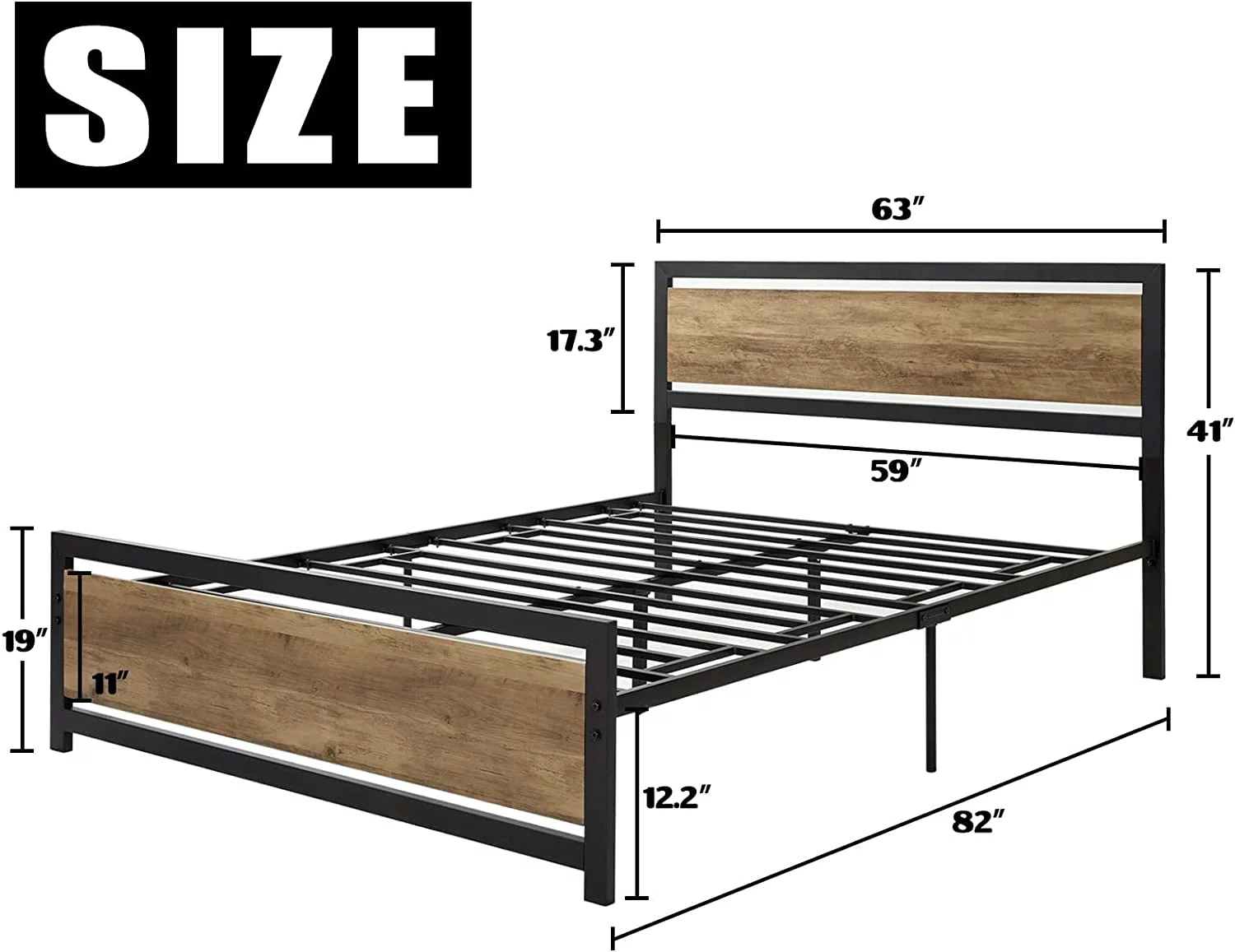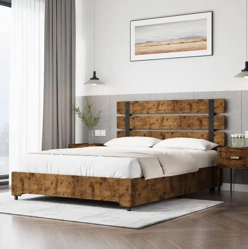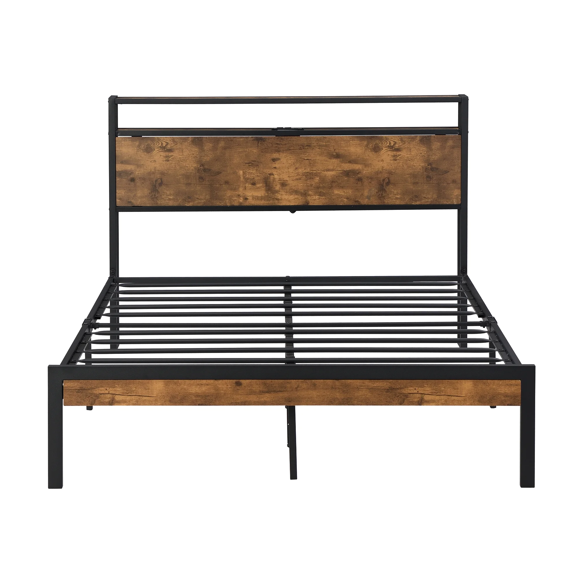 Full Metal Platform Bed Frame with Wooden Headboard Footboard, Walnut