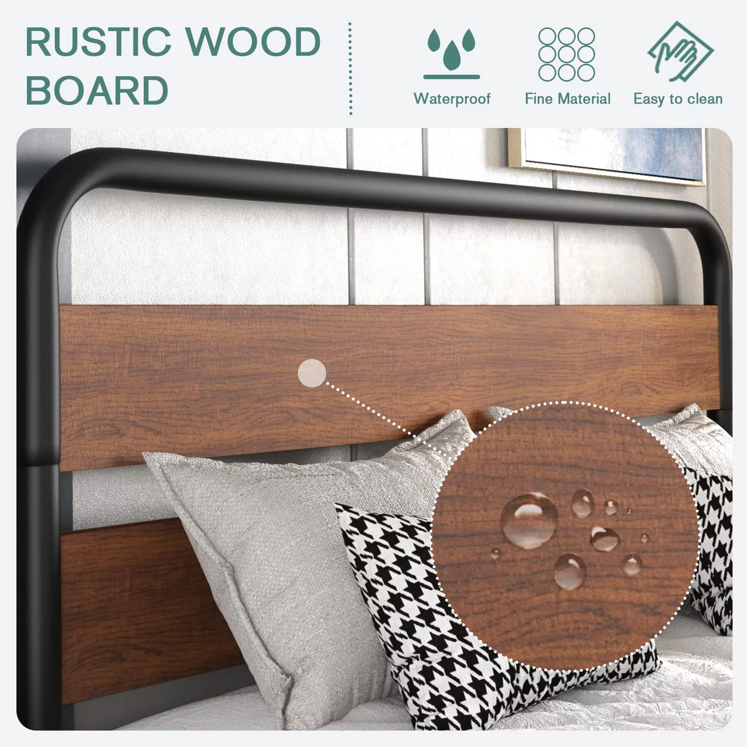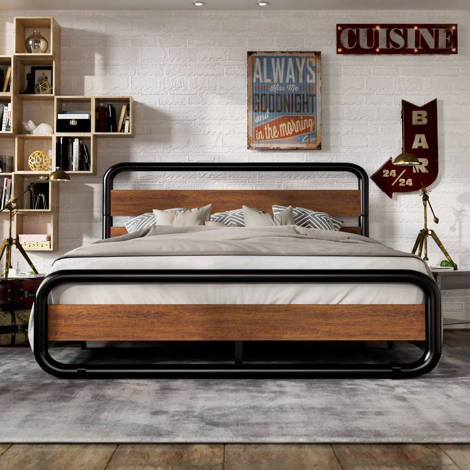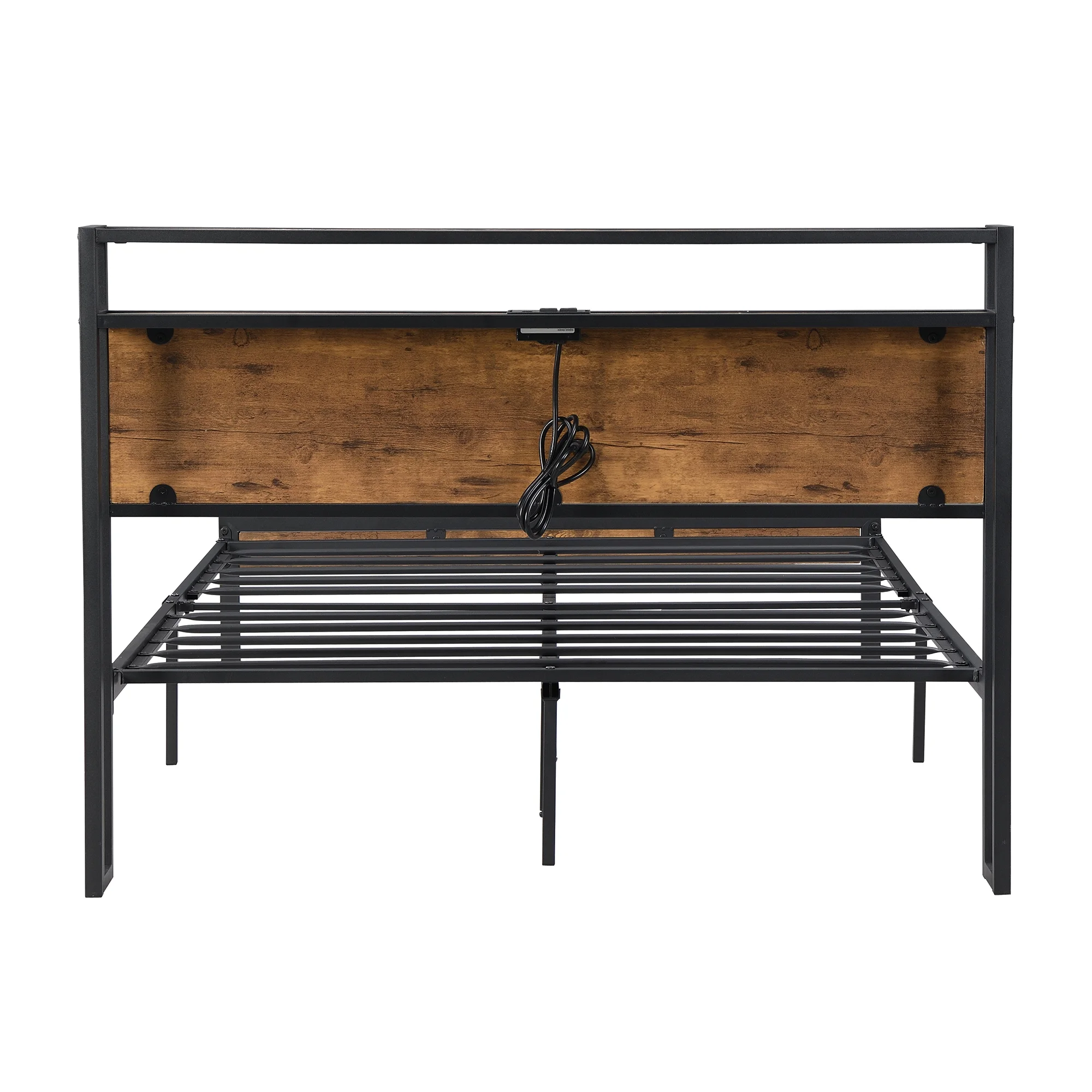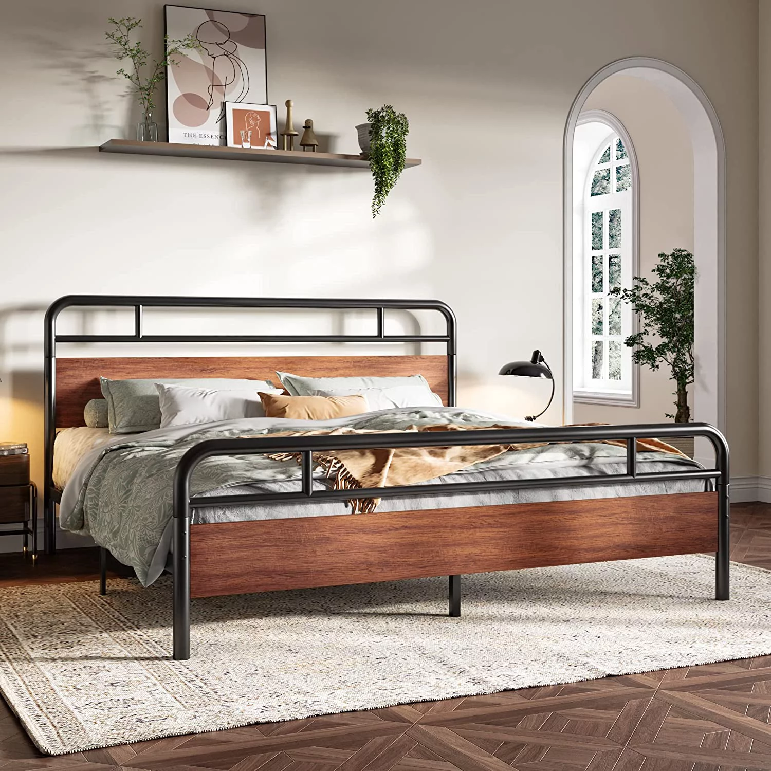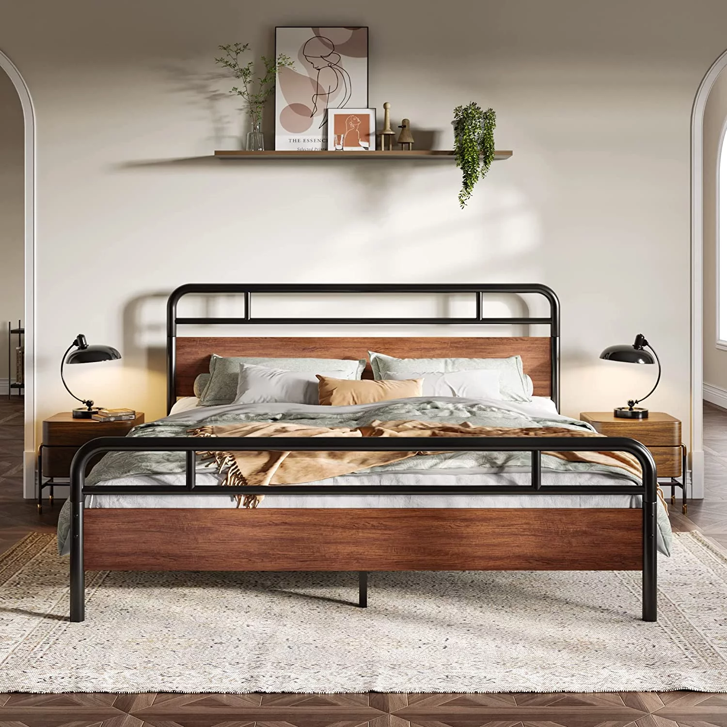 Full Metal Platform Bed Frame with Wooden Headboard Footboard, Walnut