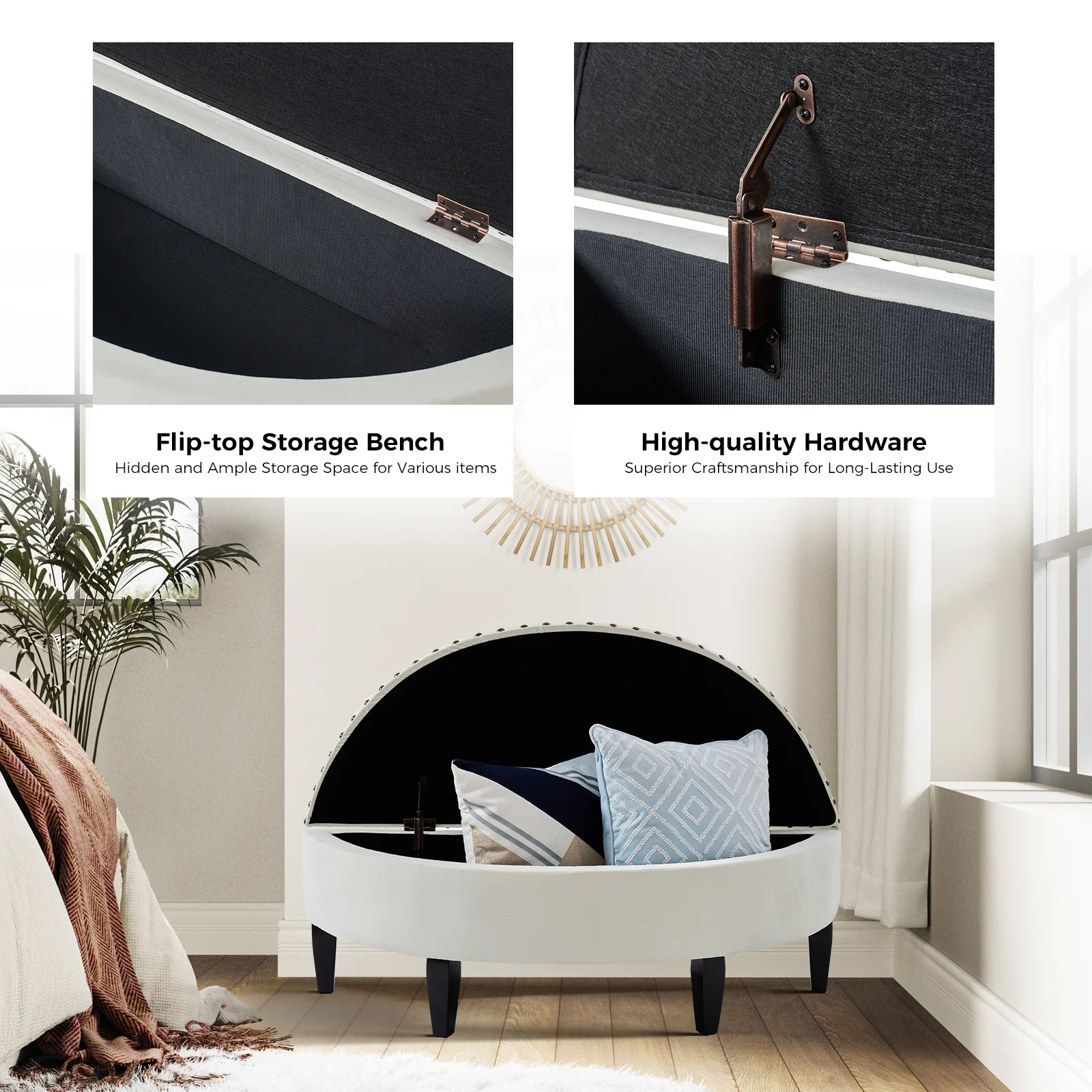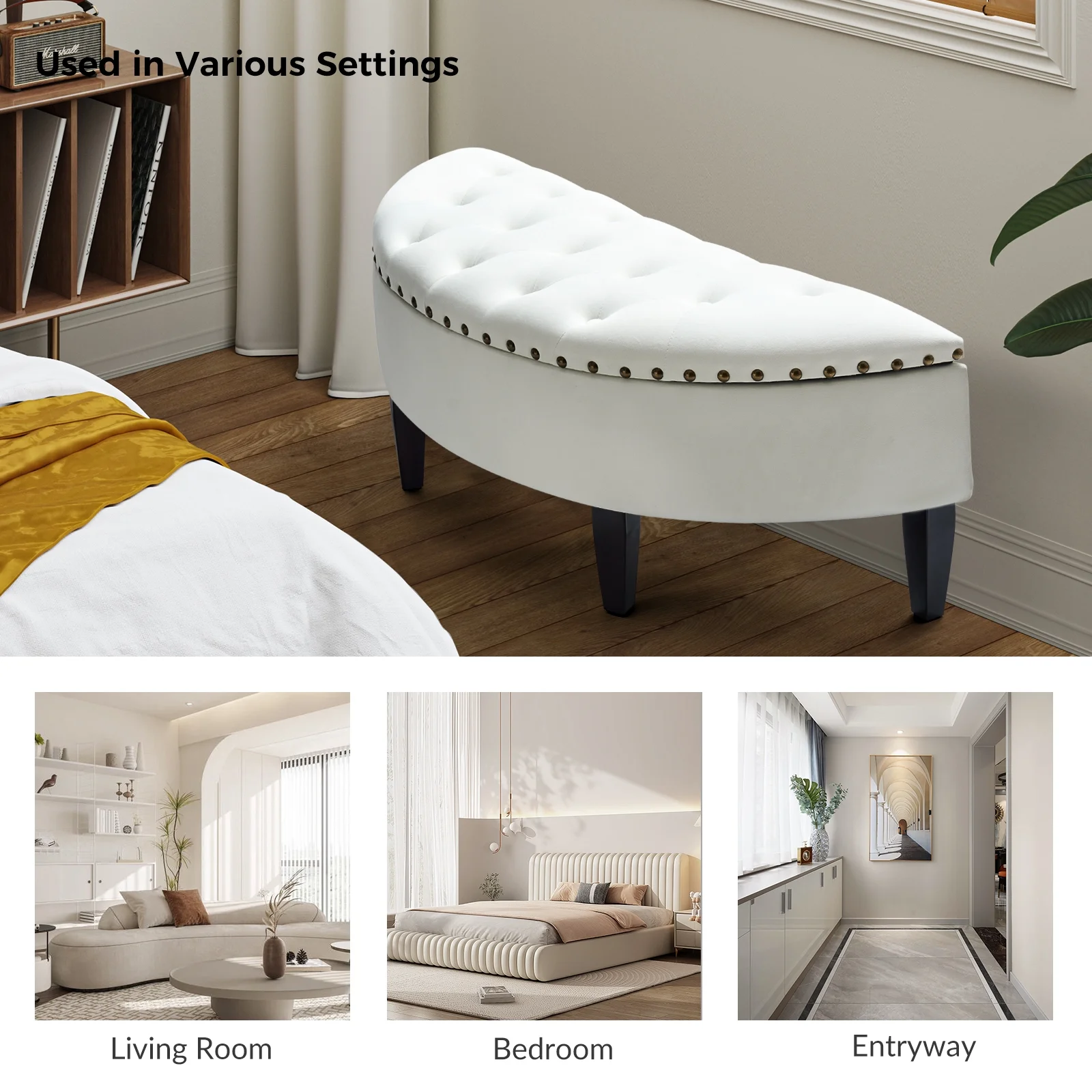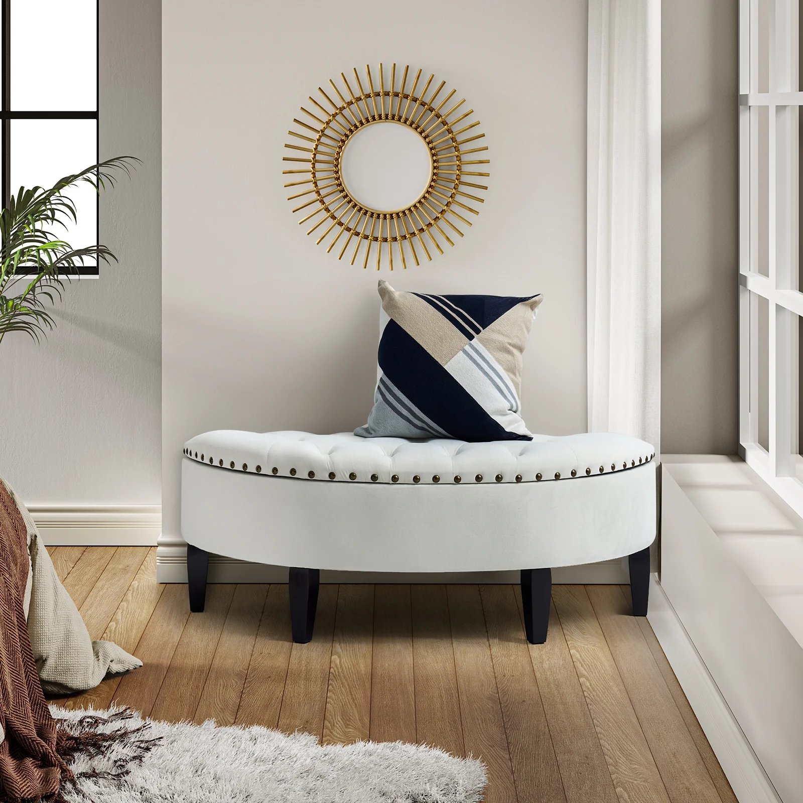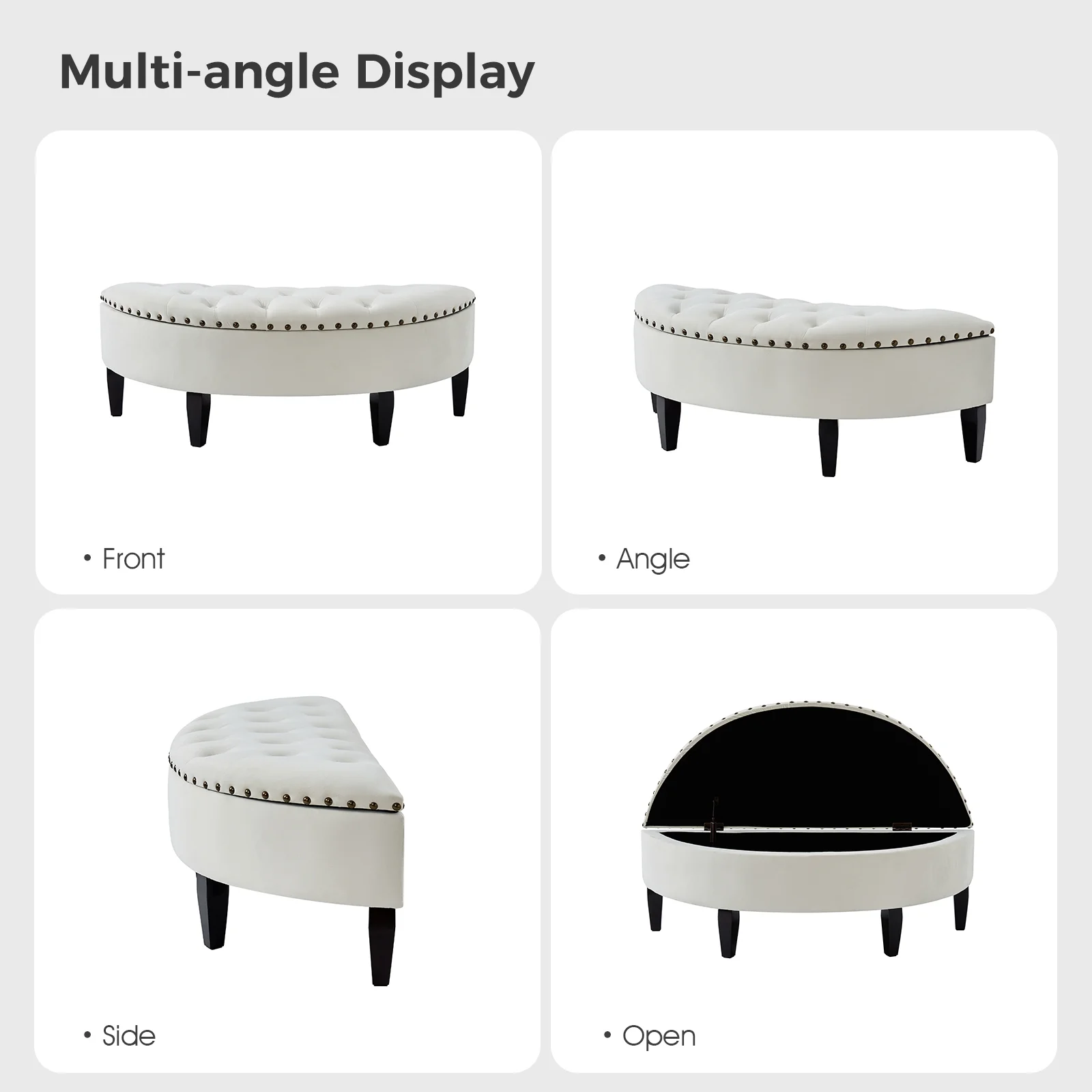 43" Wide Storage Bench Ottoman Upholstered Half Circle Bed Foot Stool with Tufted&Nail Home Bedroom in Ivory