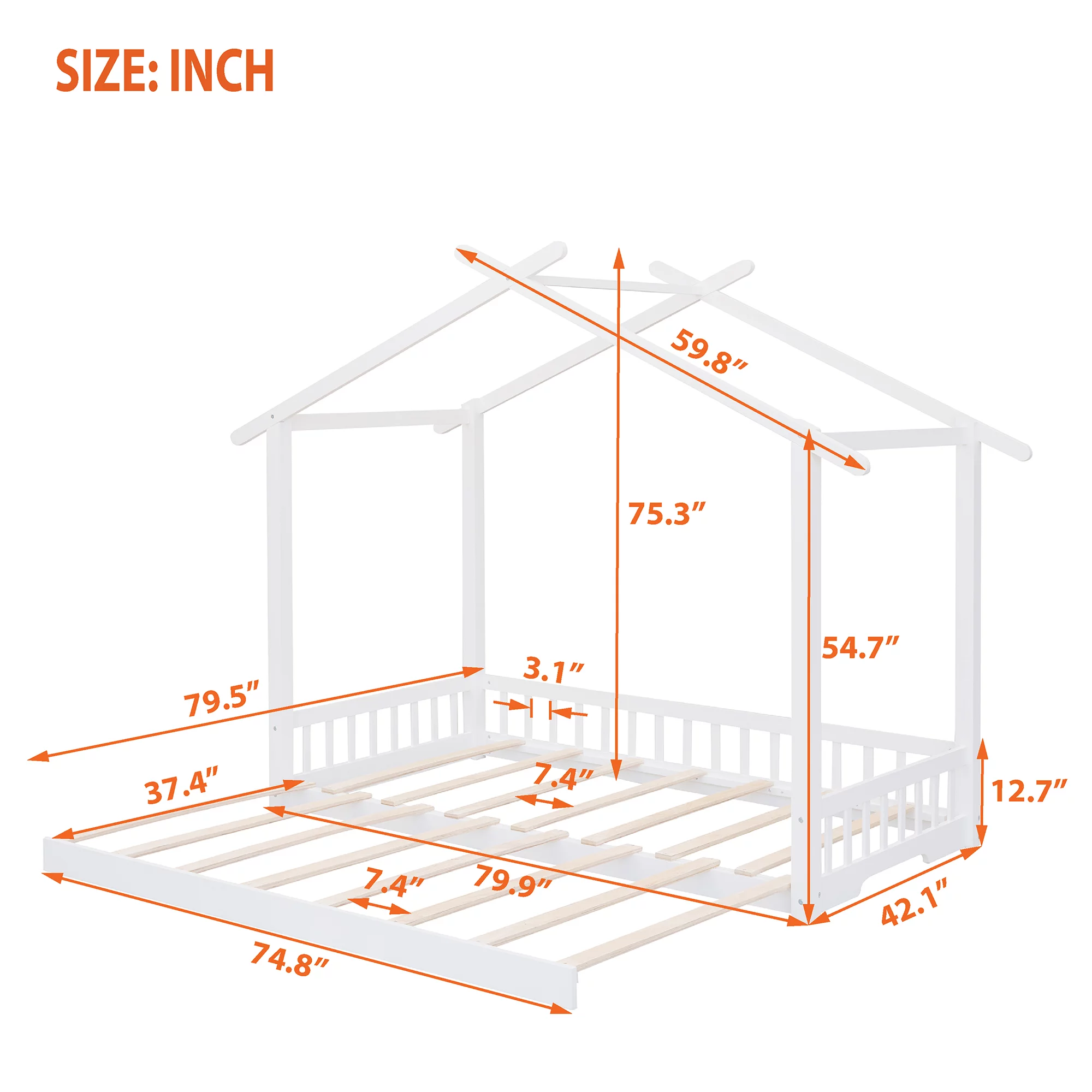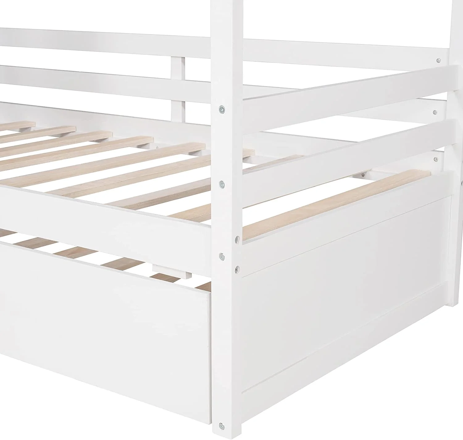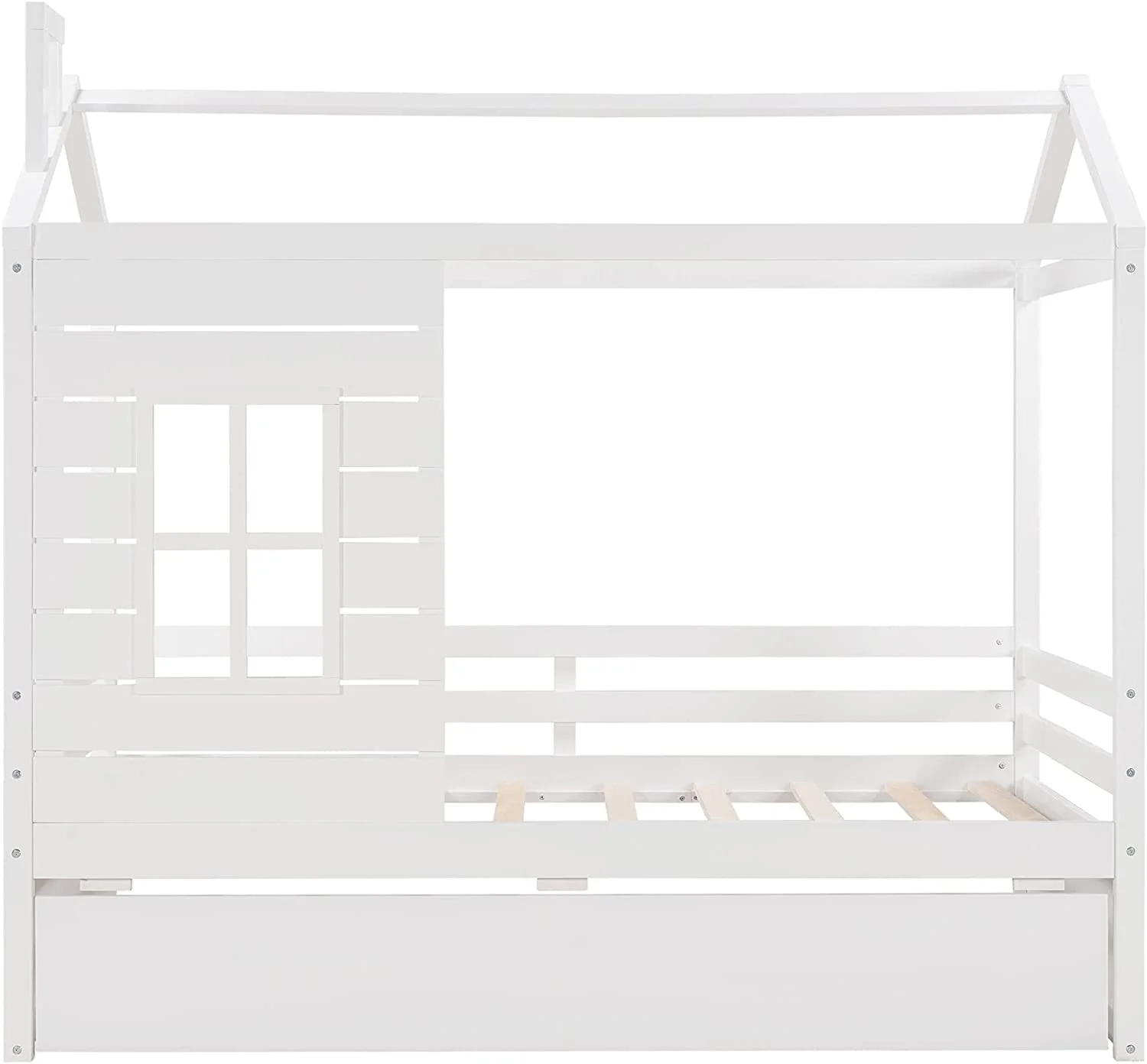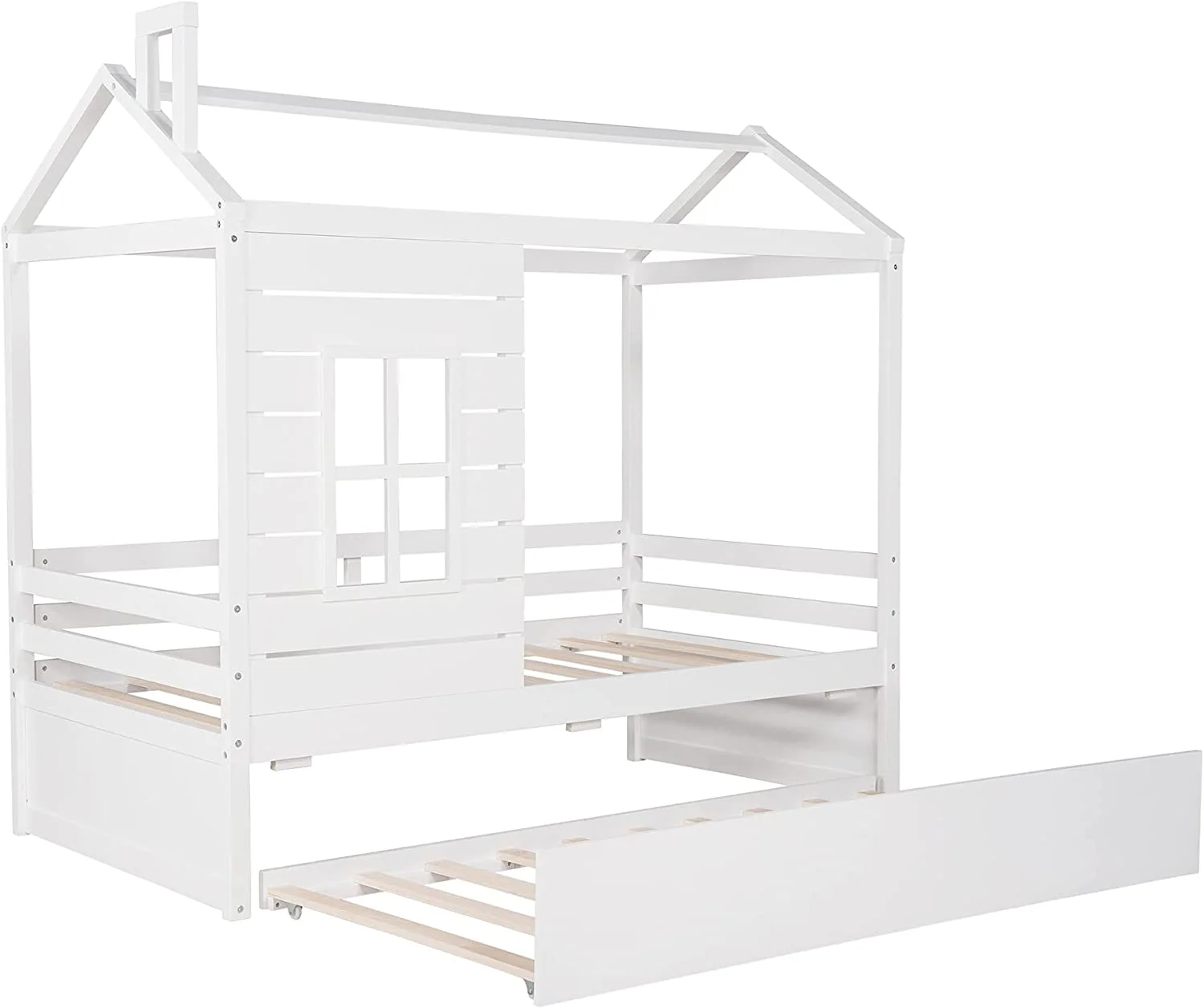 House Bed Wood Bed With Trundle, Bed With Trundle, For Kids Teens Girls Boys (White)