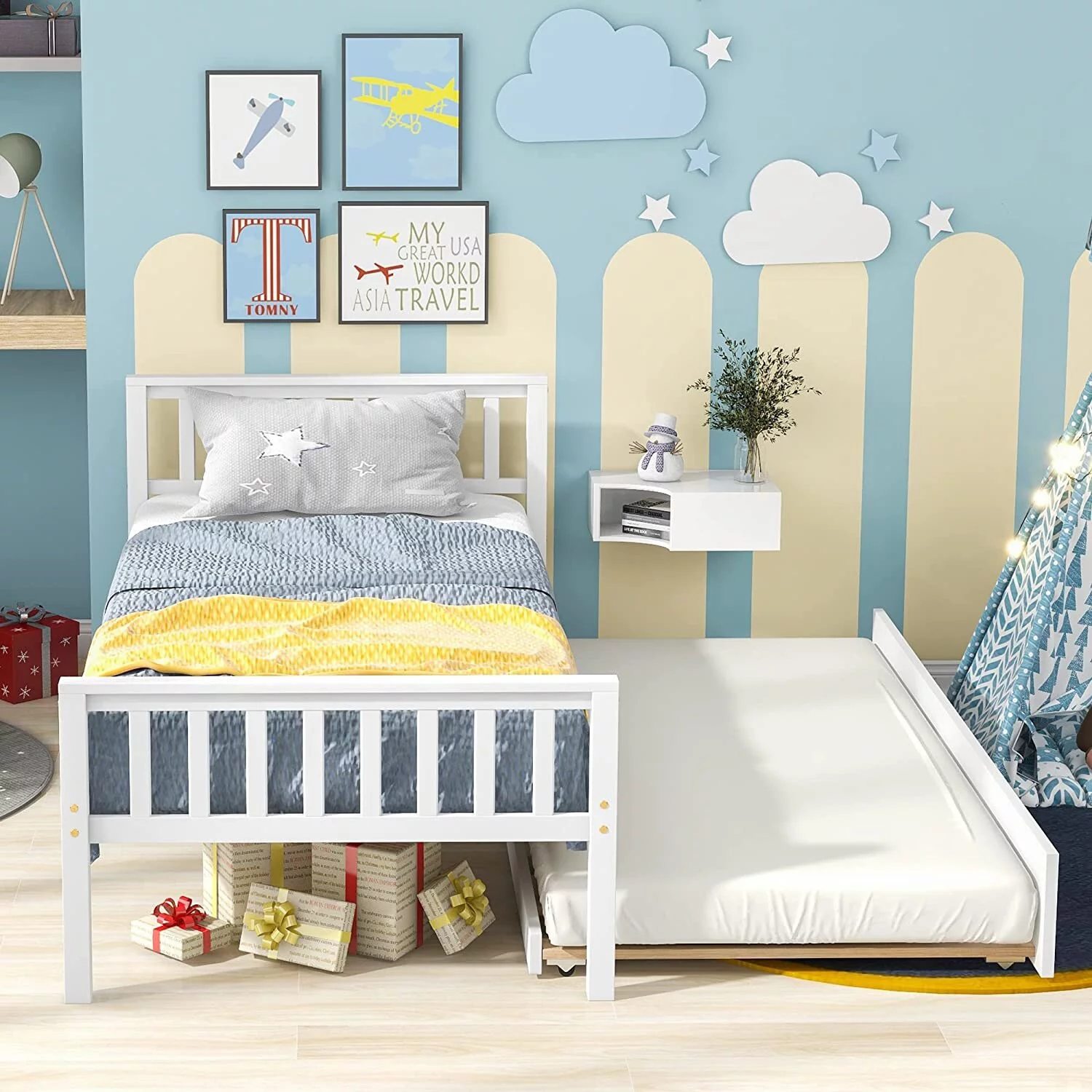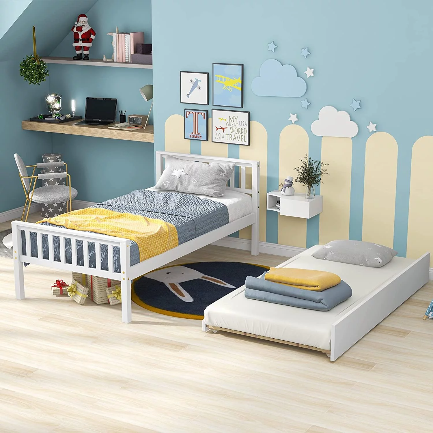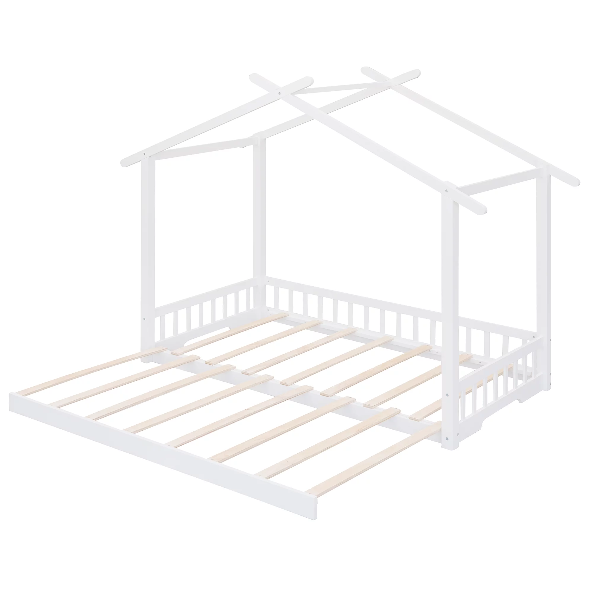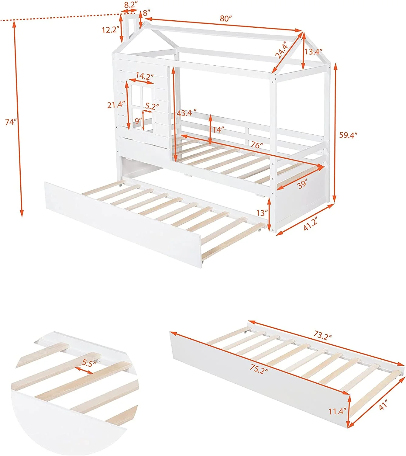 House Bed Wood Bed With Trundle, Bed With Trundle, For Kids Teens Girls Boys (White)