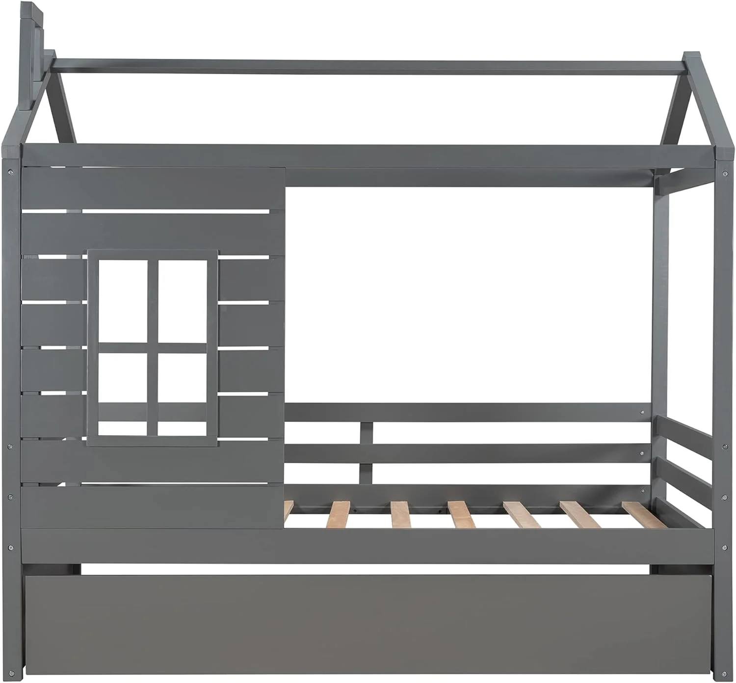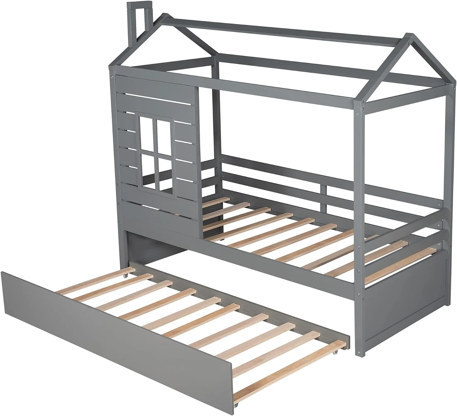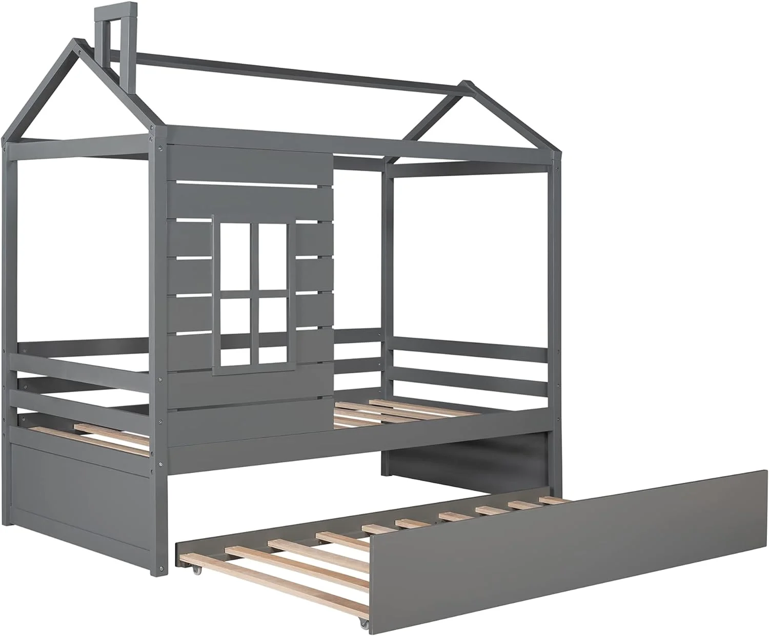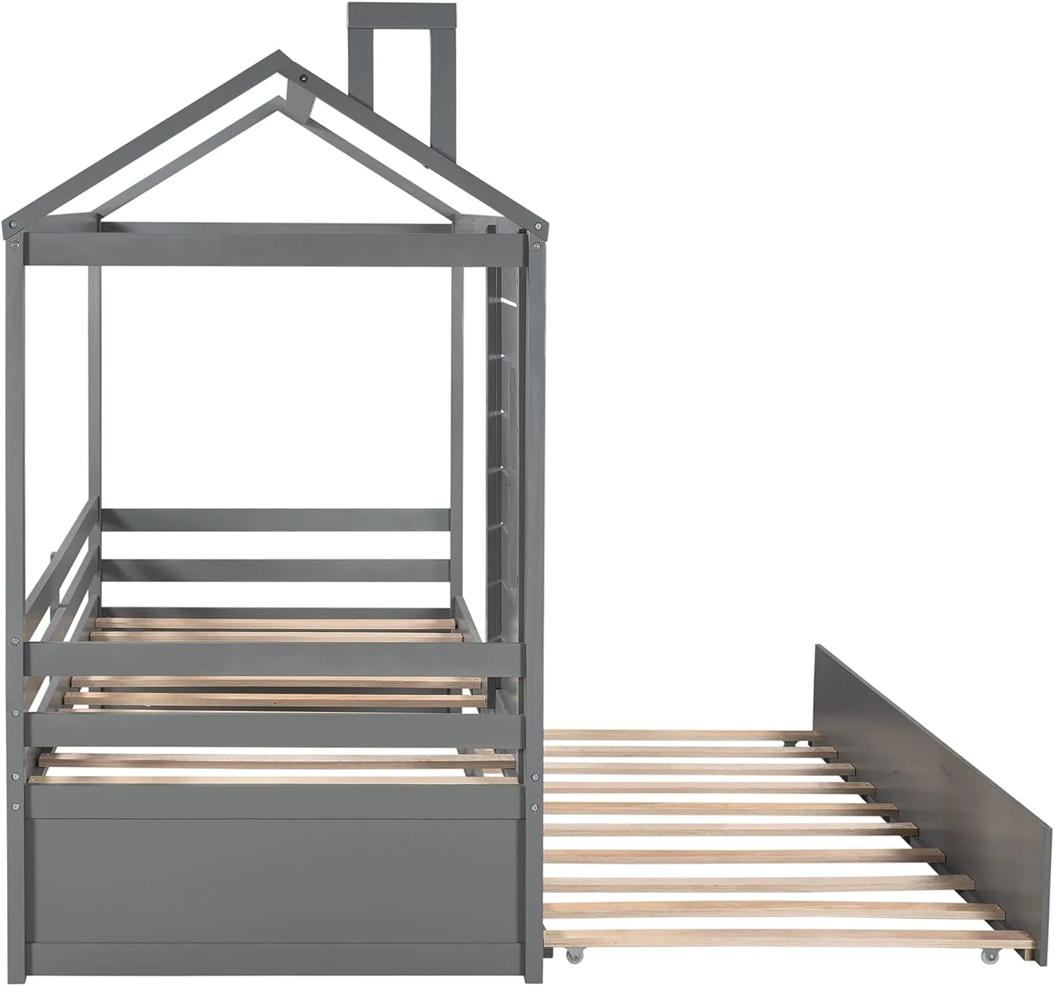 House Bed Wood Bed With Trundle, Bed With Trundle, For Kids Teens Girls Boys (Gray)