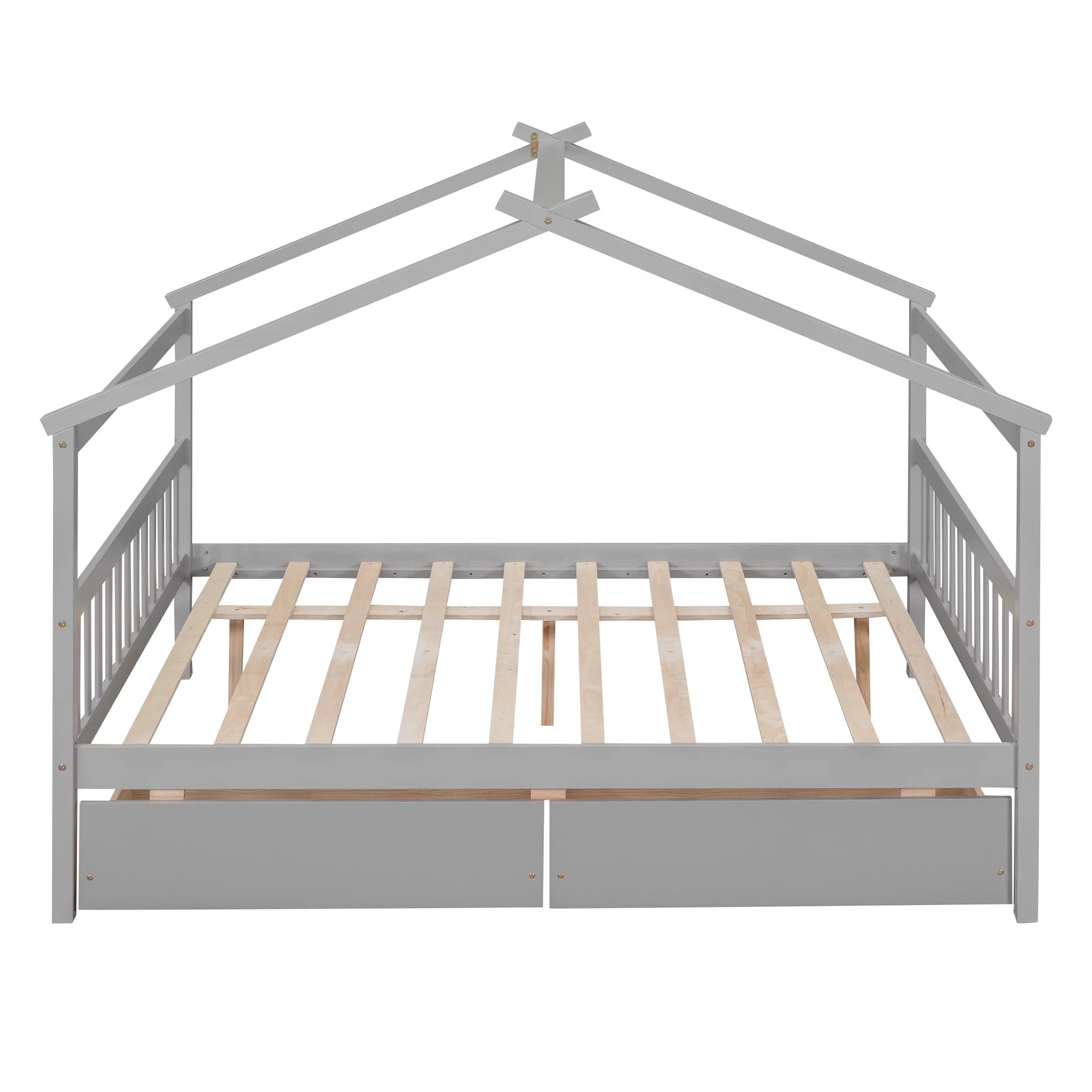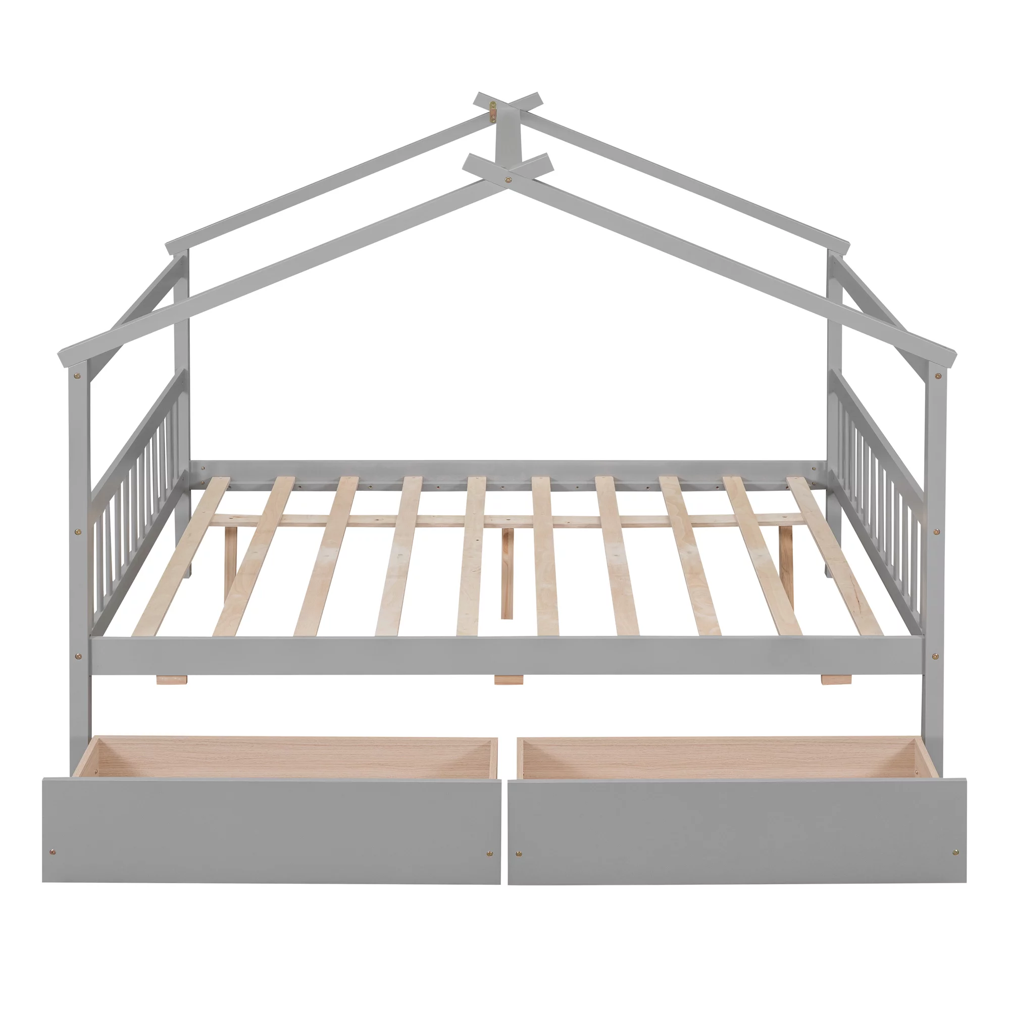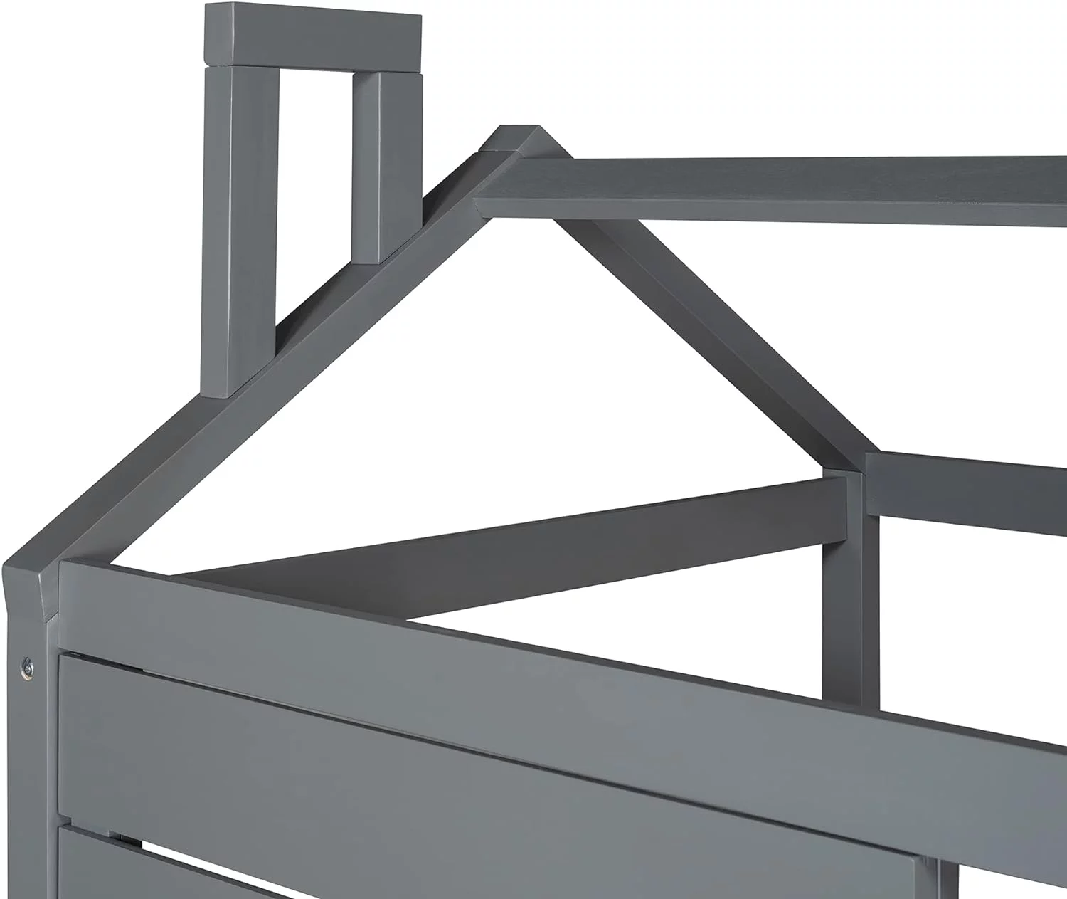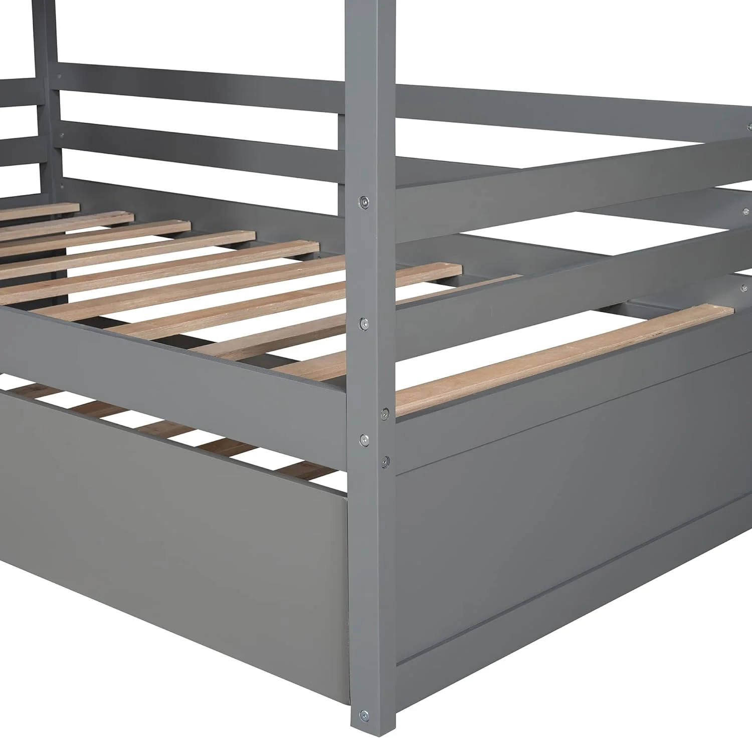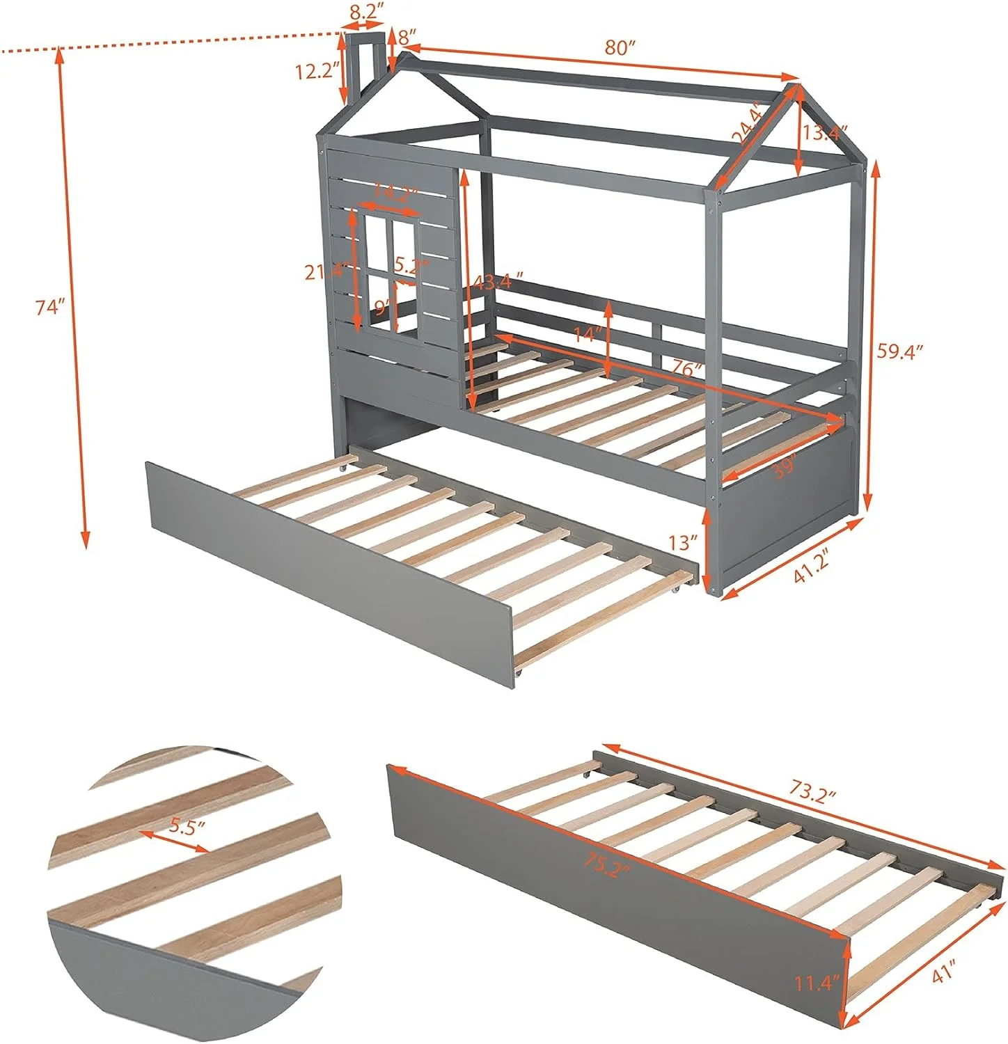 House Bed Wood Bed With Trundle, Bed With Trundle, For Kids Teens Girls Boys (Gray)