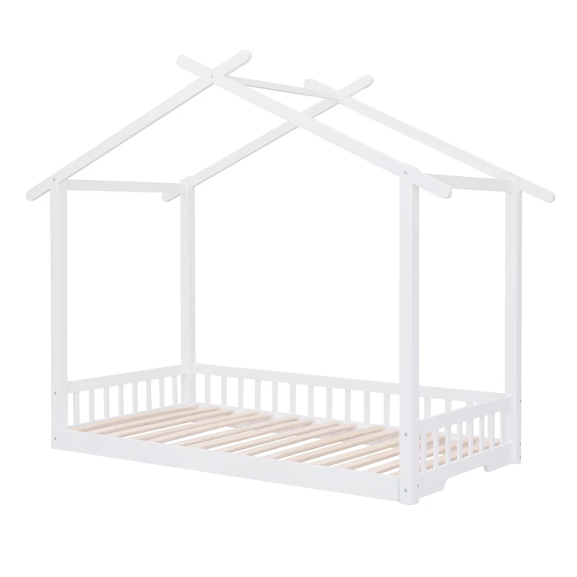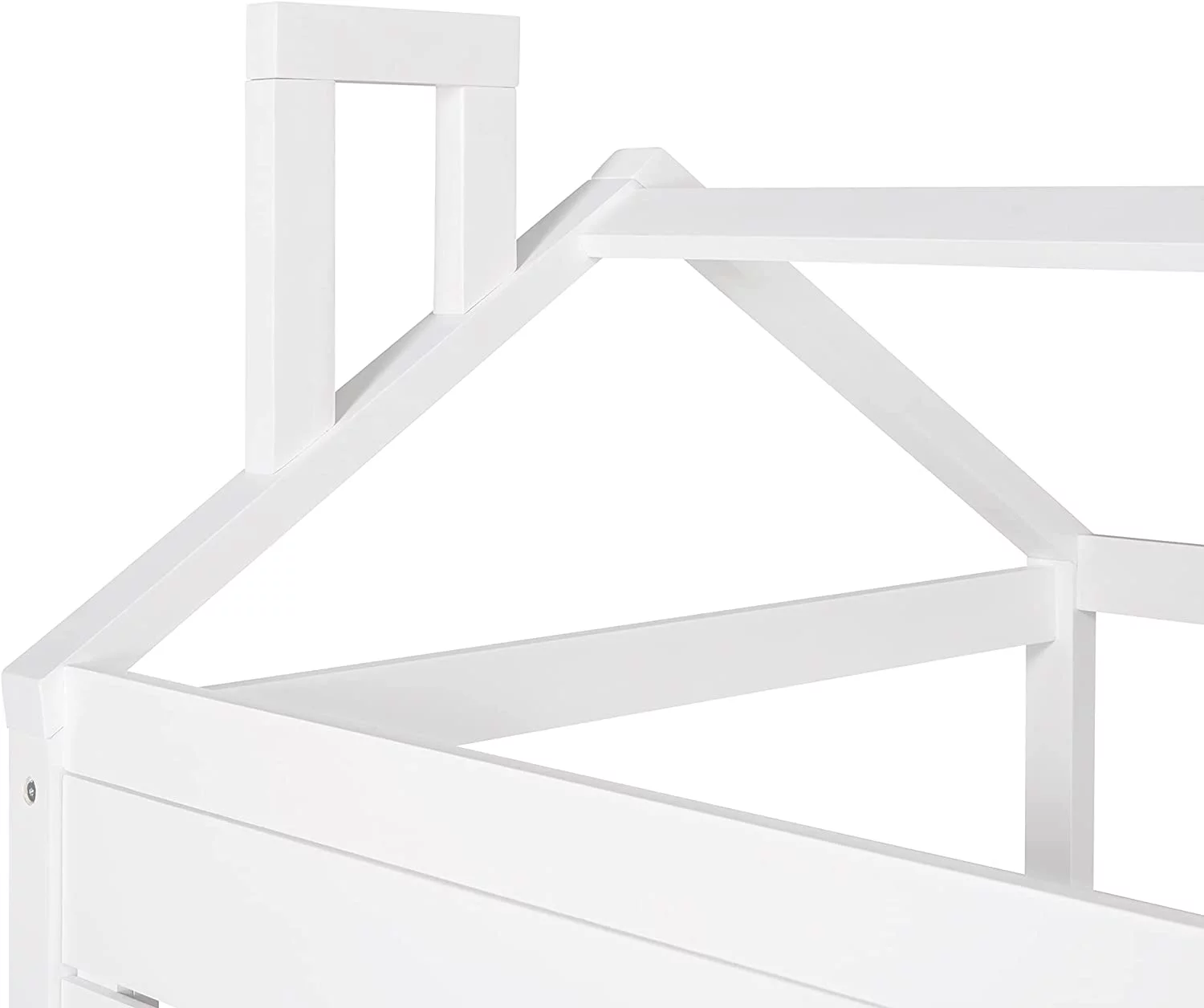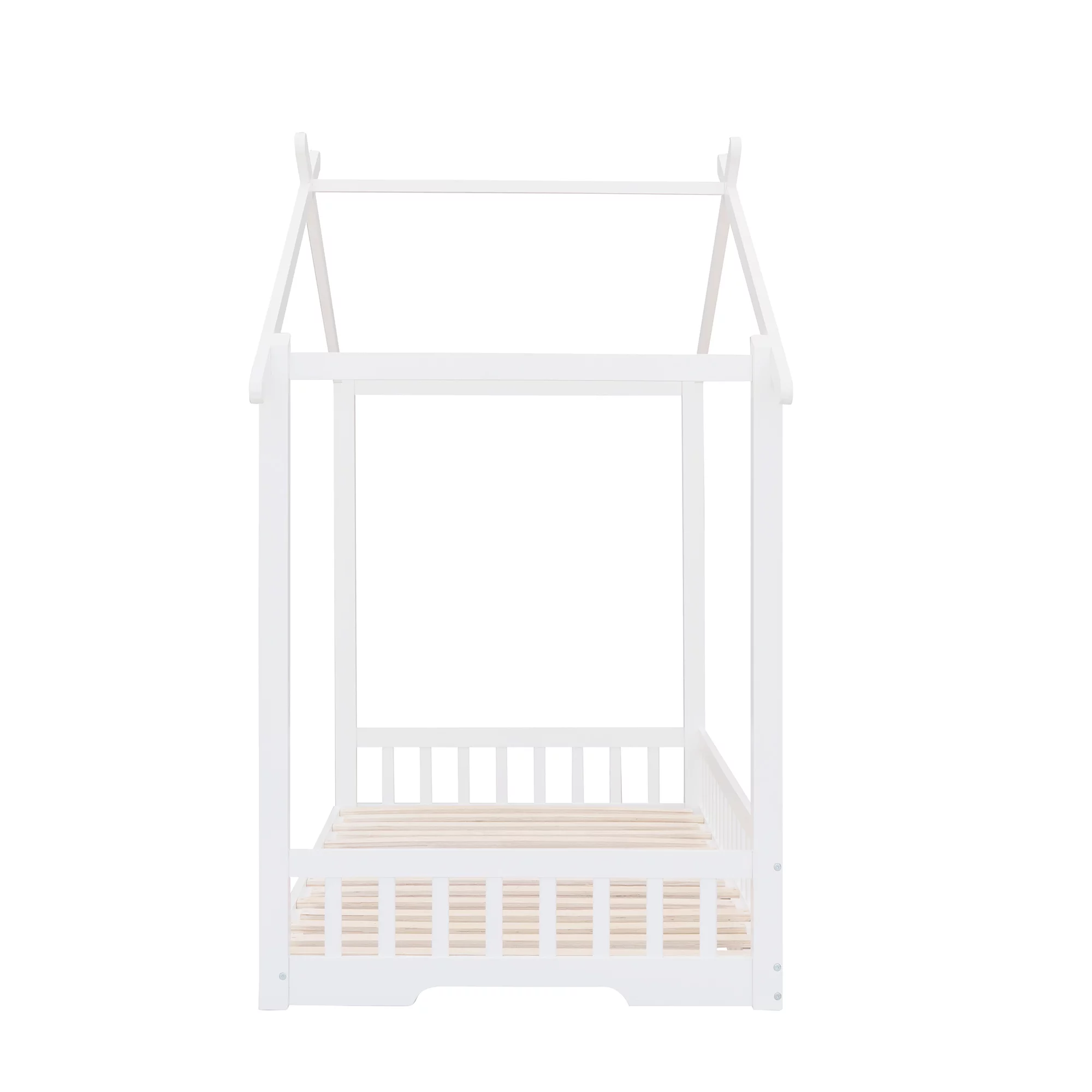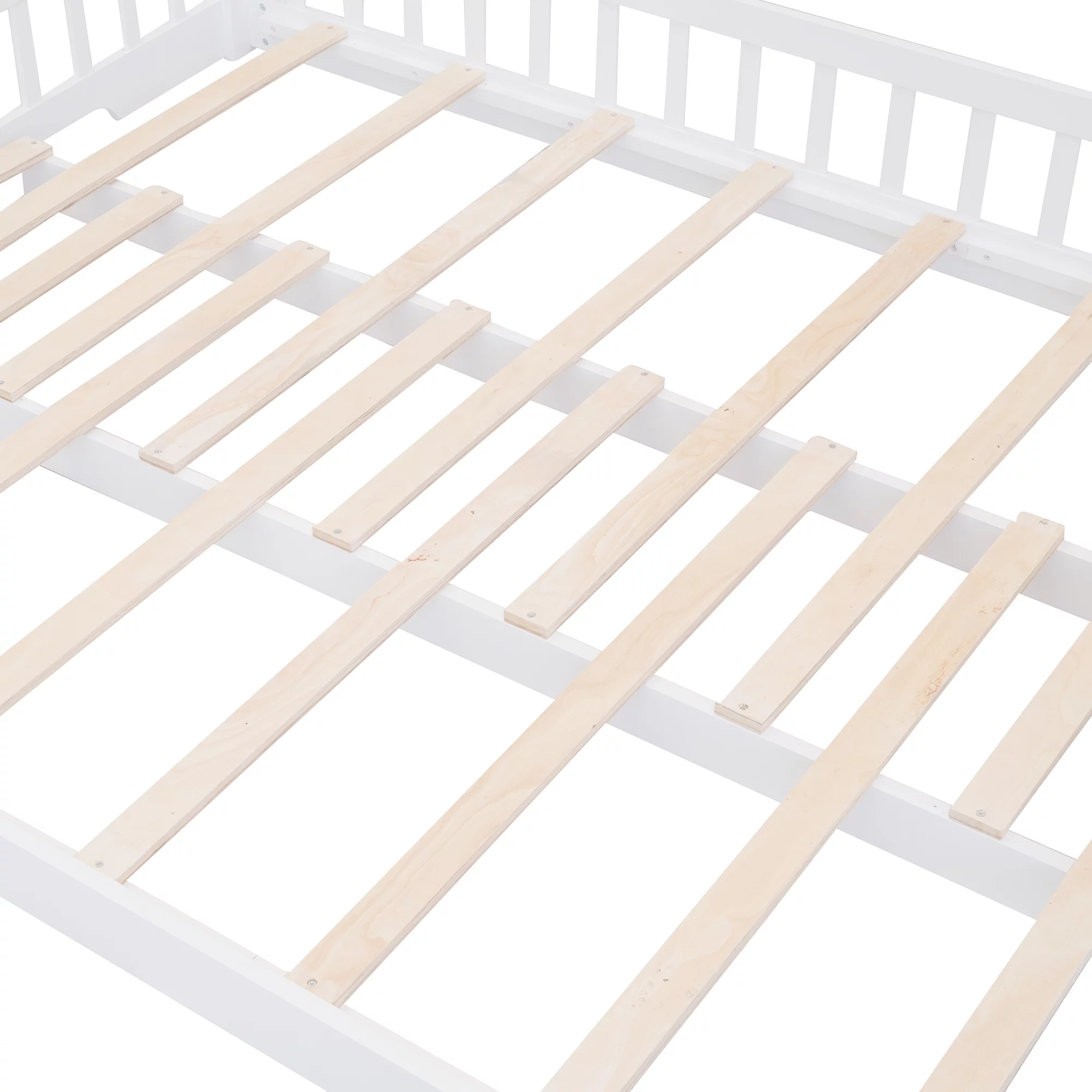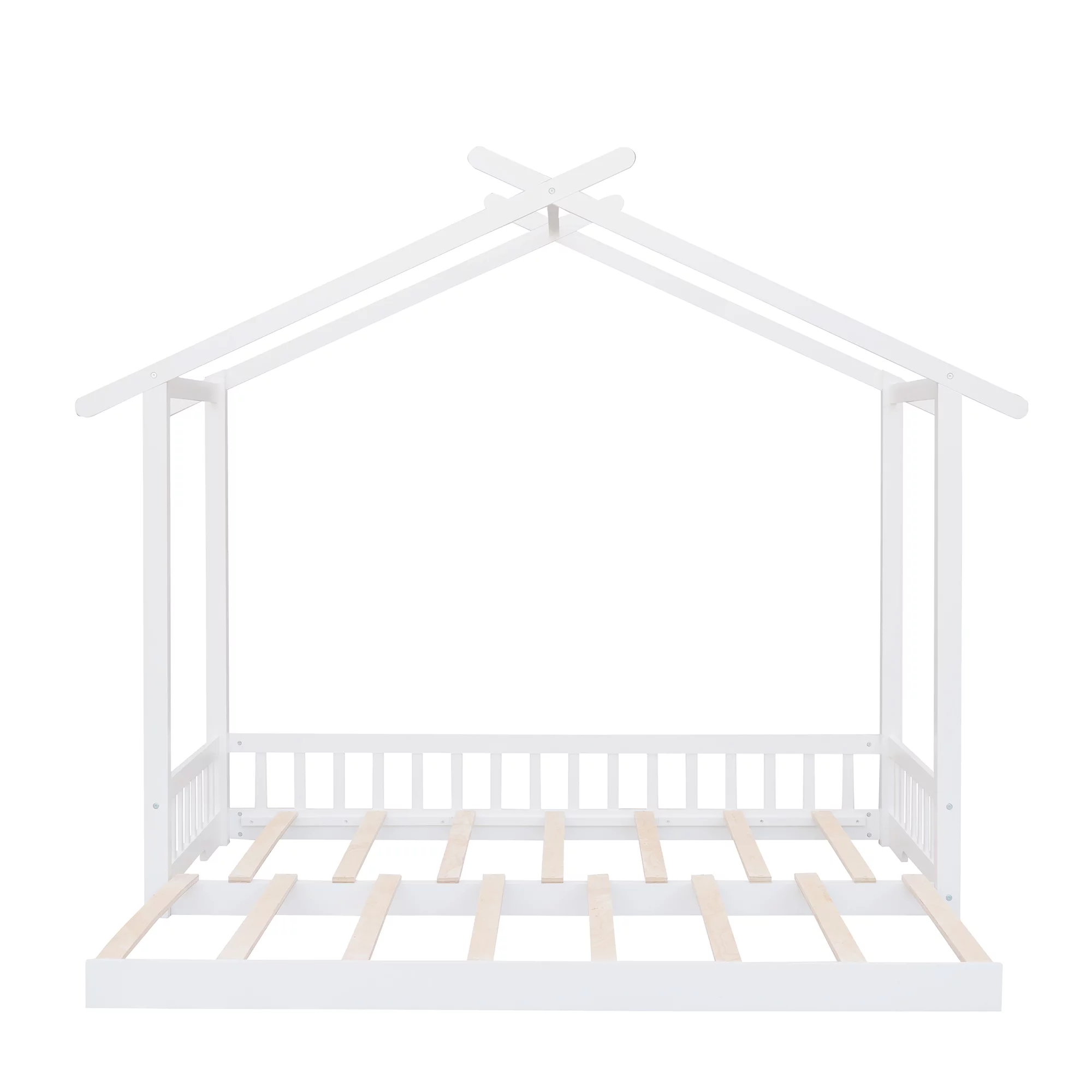 Gewnee Twin Size House Bed with Trundle,Wooden Floor Bed with Roof and Fence for Kids & Toddlers,White