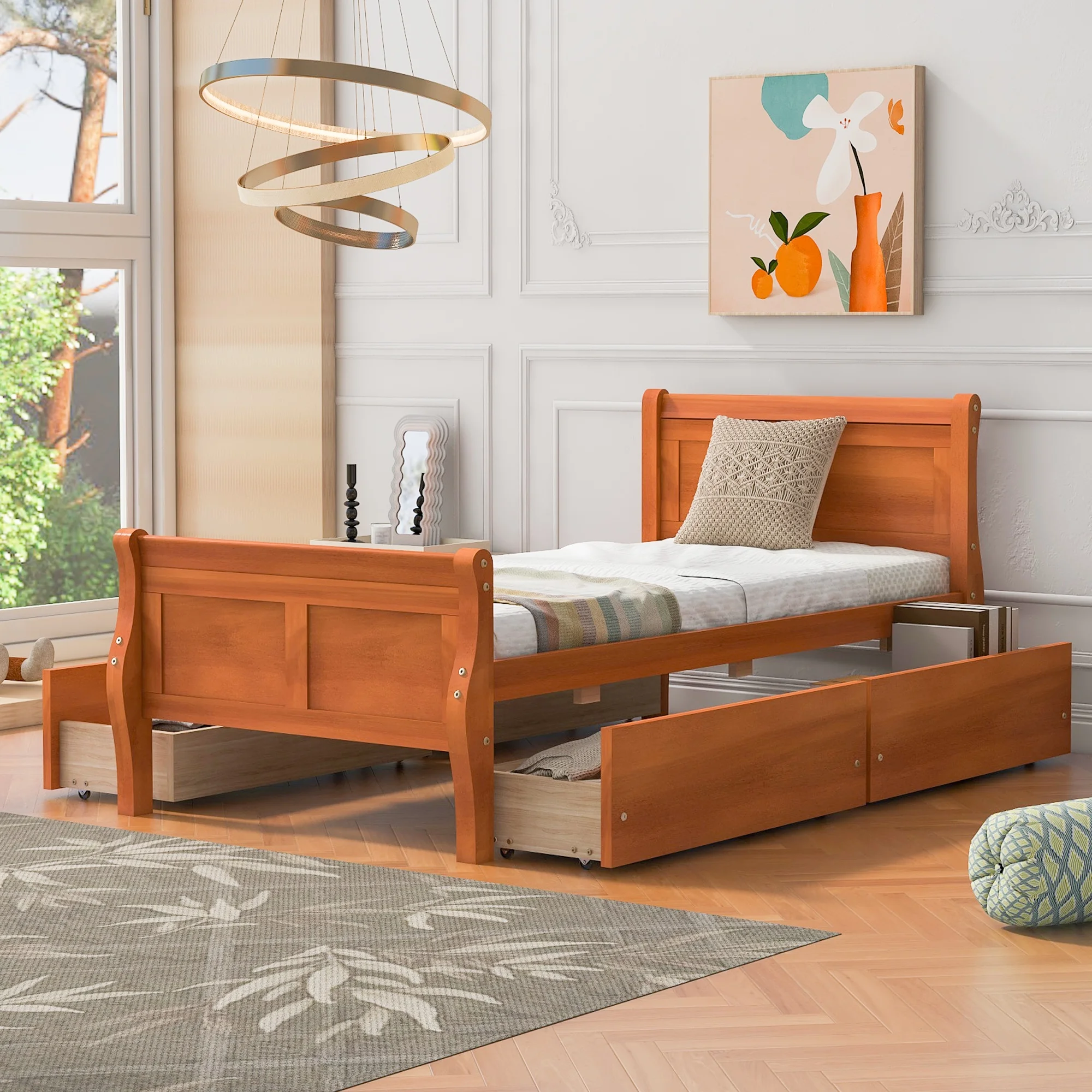 Twin Size Wood Platform Bed with 4 Drawers and Streamlined Headboard & Footboard, Oak