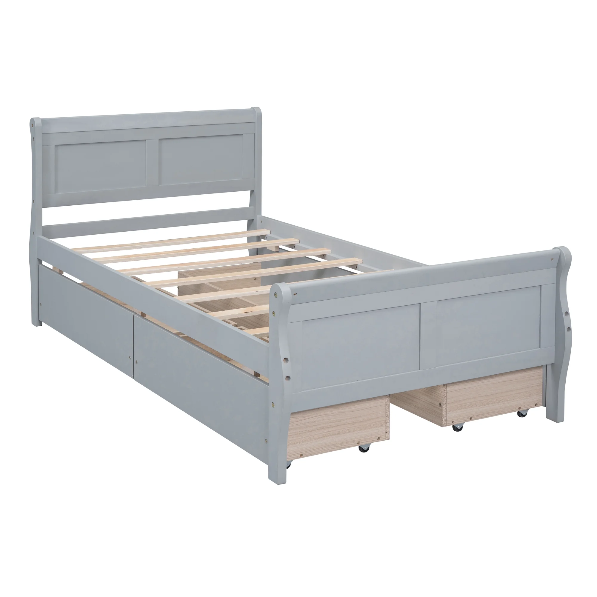 Twin Size Wood Platform Bed with 4 Drawers and Streamlined Headboard & Footboard, Gray