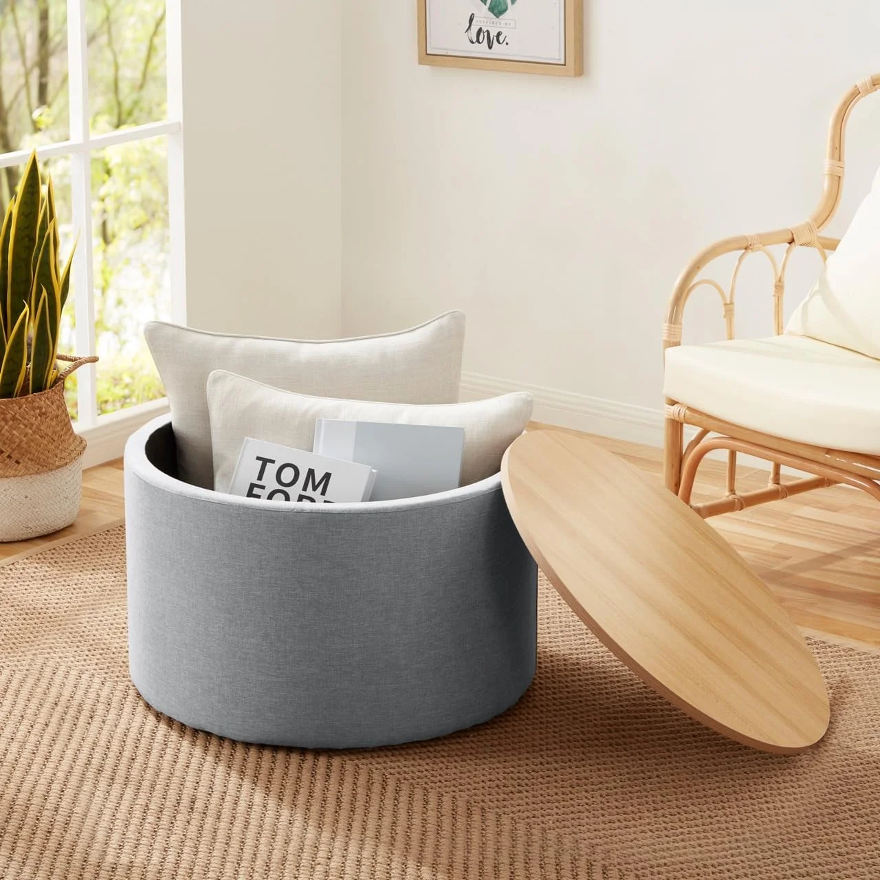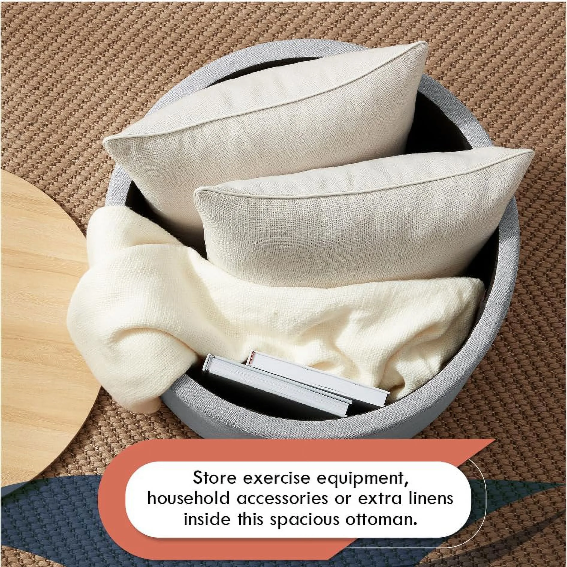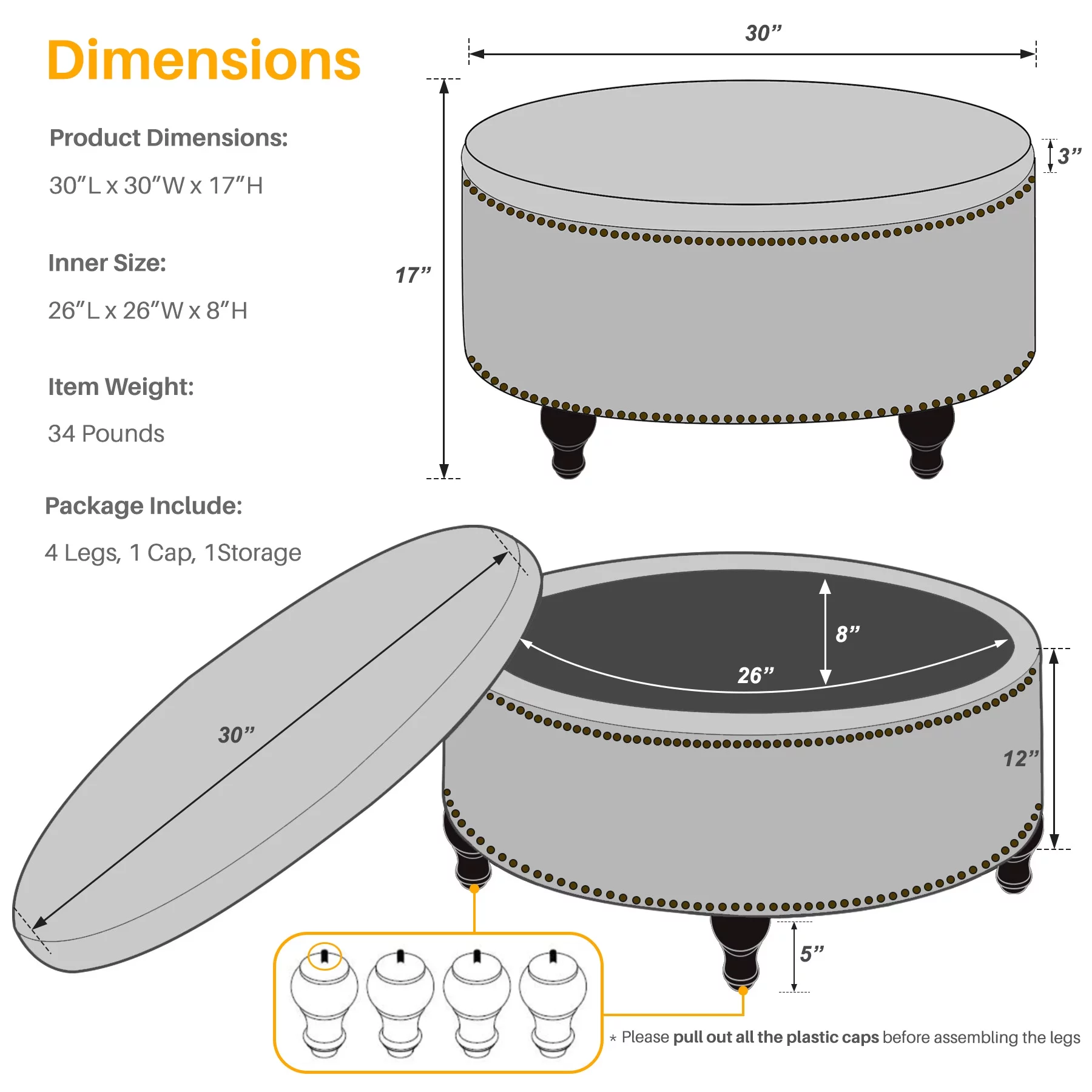 Upholstered 30" Round Storage Button Ottoman, Nail Head Tufted Seating, with Removable Lid Dark Grey
