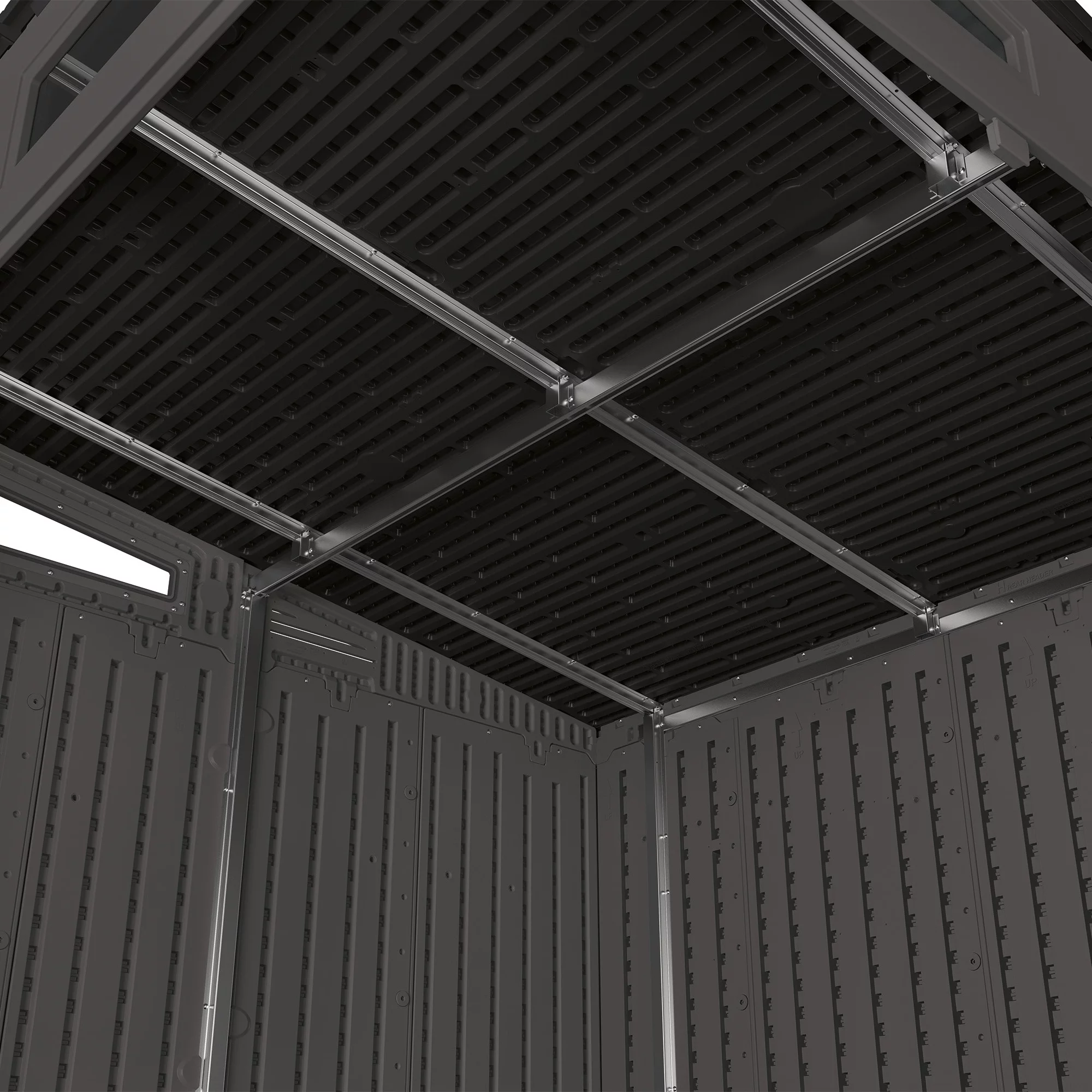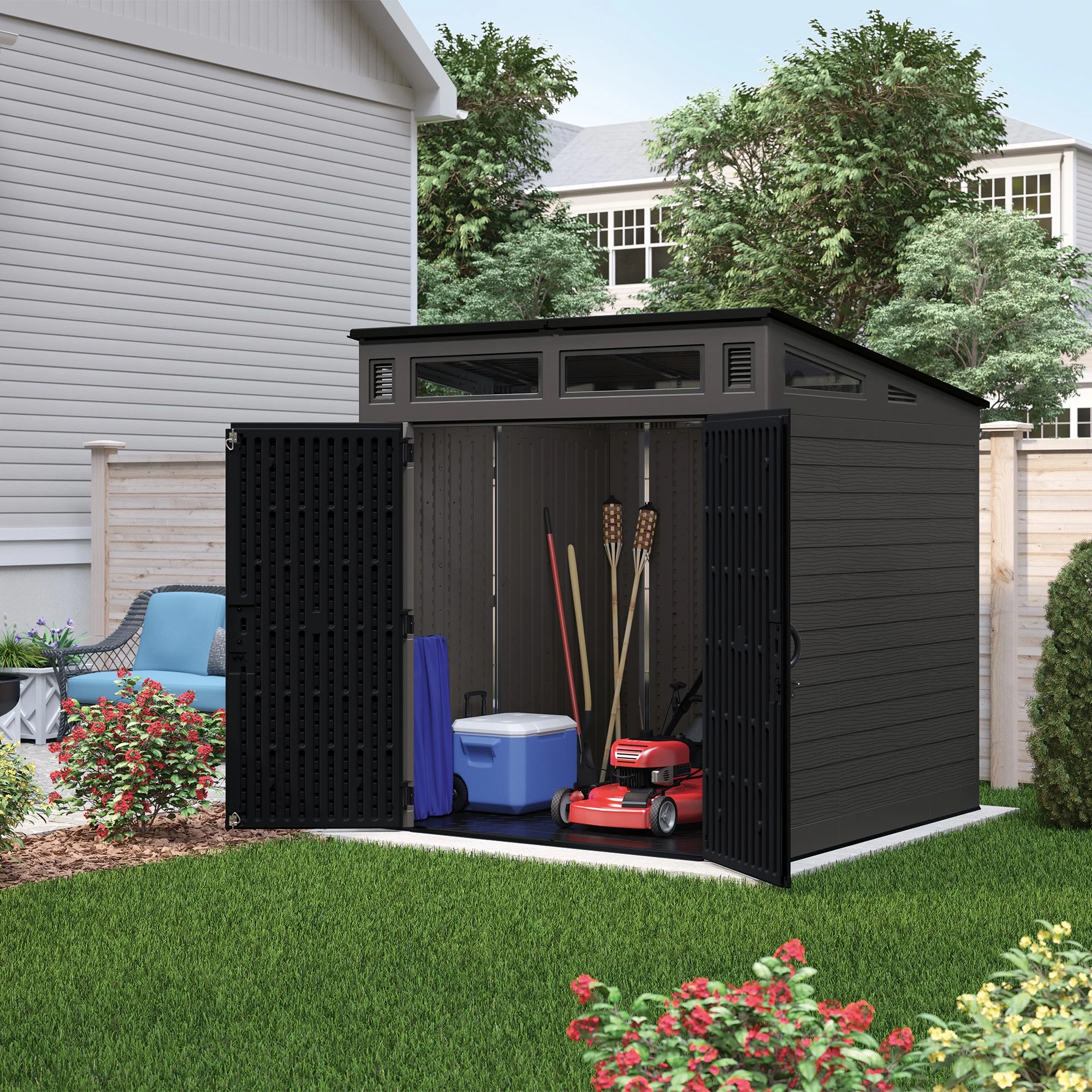 Suncast Resin Modernist Outdoor Storage Shed, Black and Gray, 86.5 in D x 89.5 in H x 87.5 in W