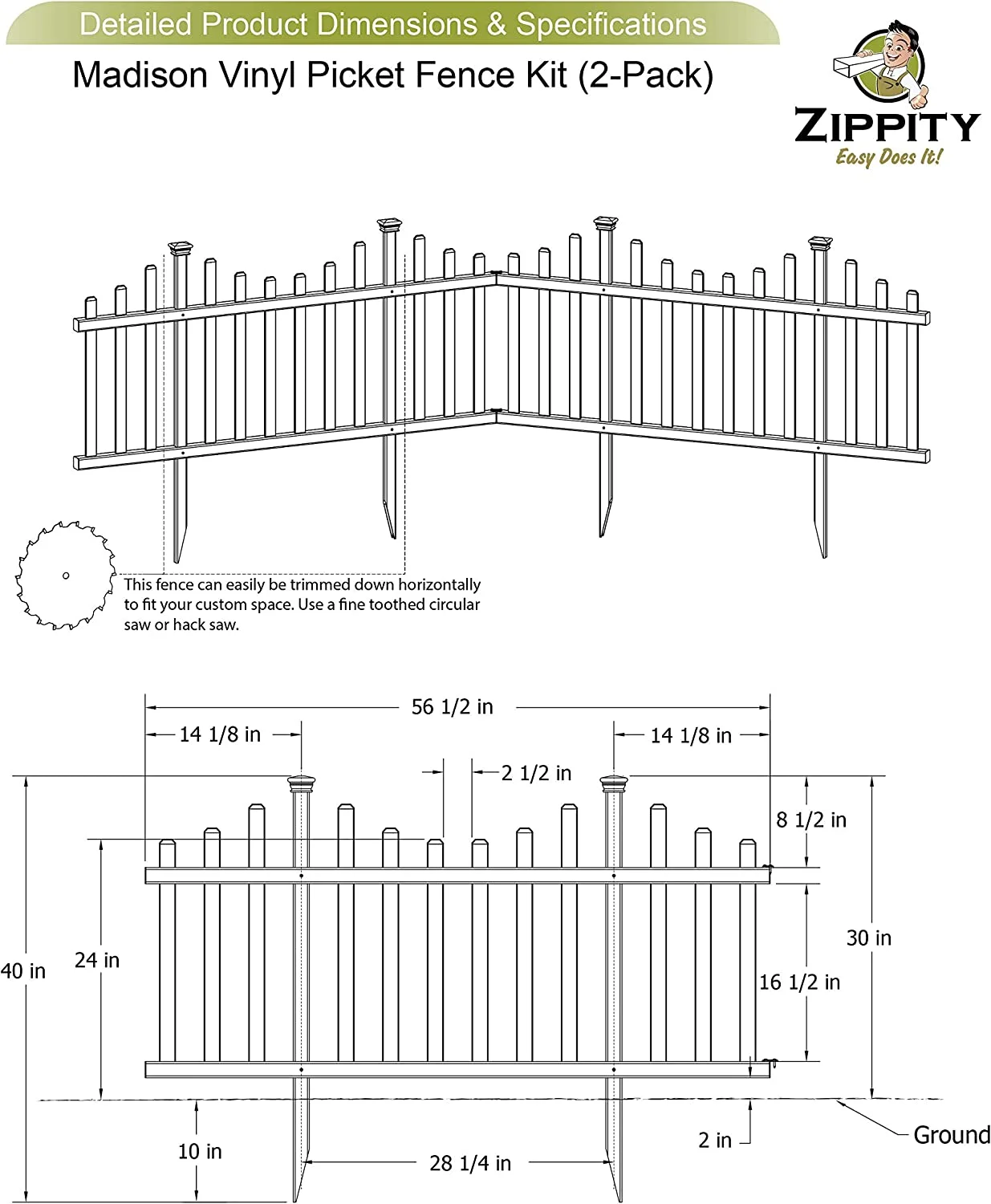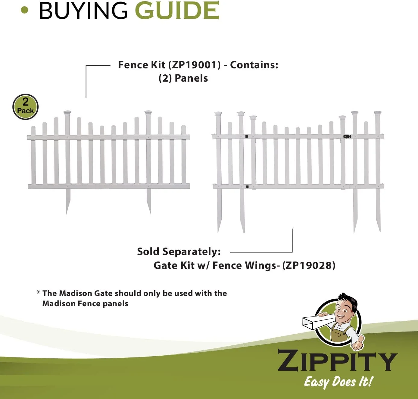 Zippity Outdoor Products ZP19001 No Dig Madison Vinyl Picket Fence, White, 30" x 56.5" (1 Box, 2 Panels), 1 x Pack of 2