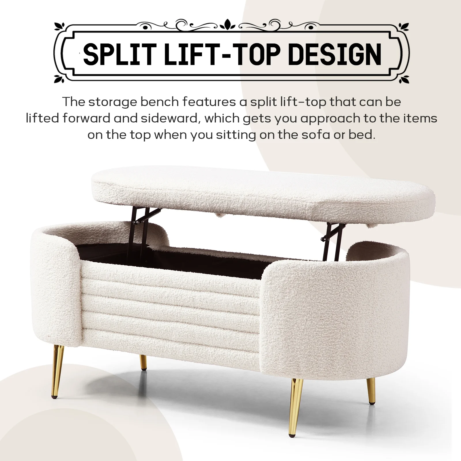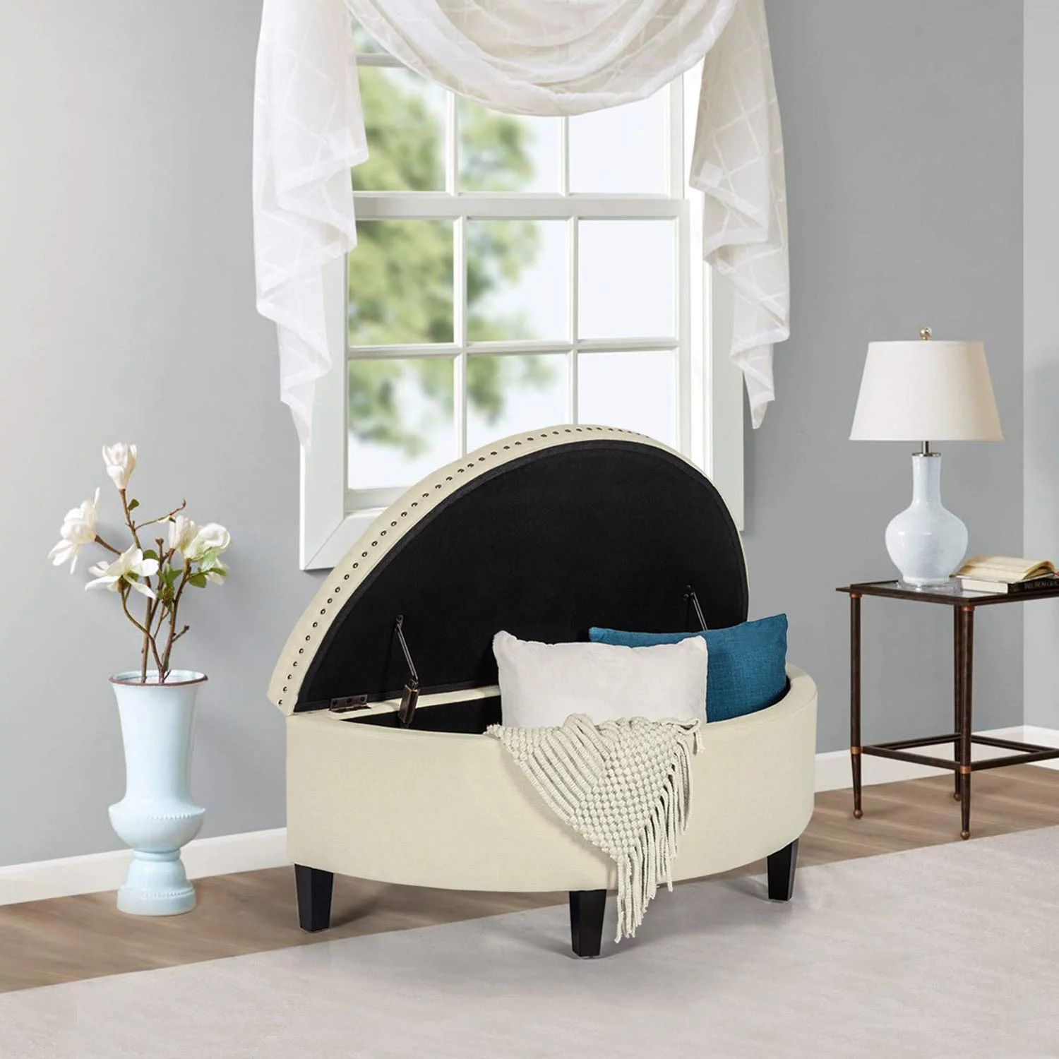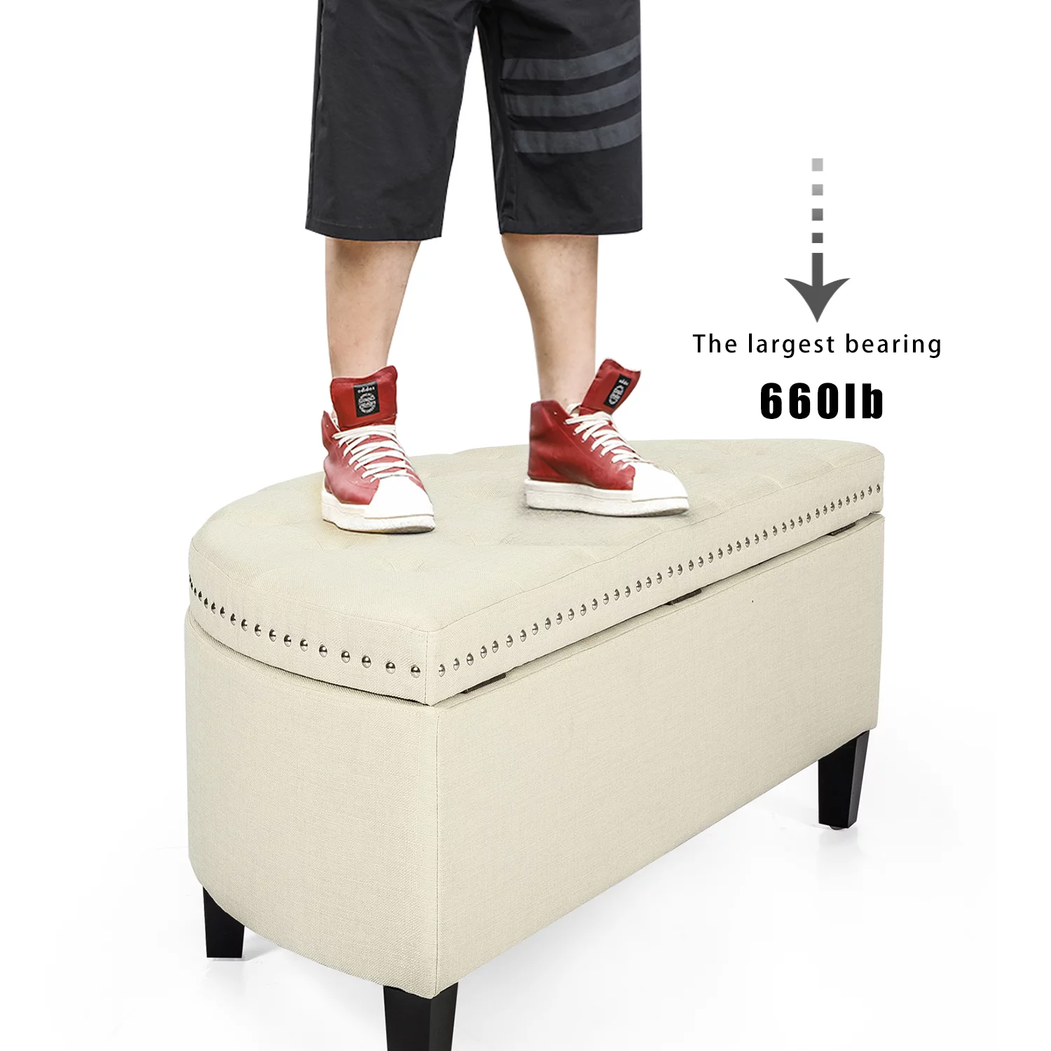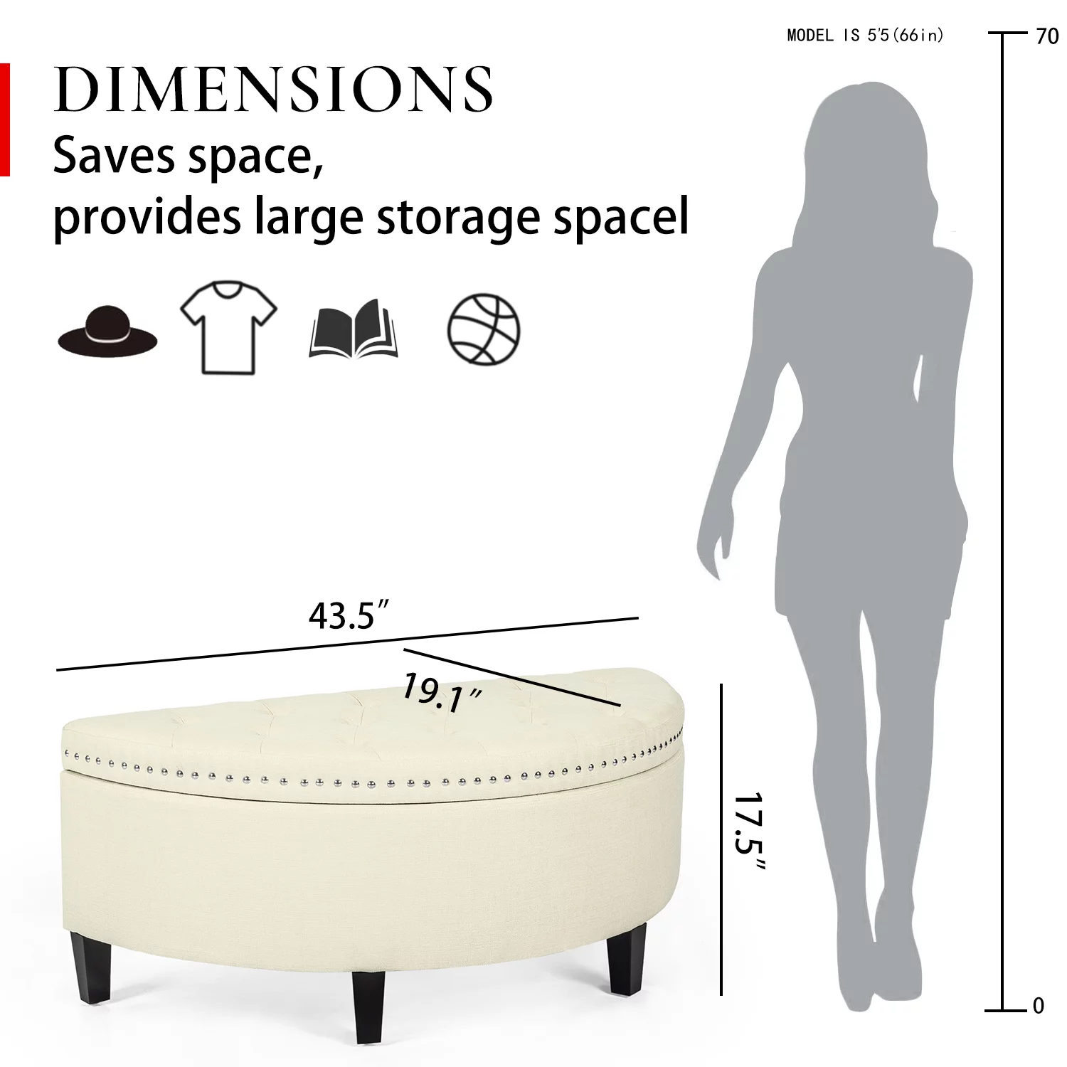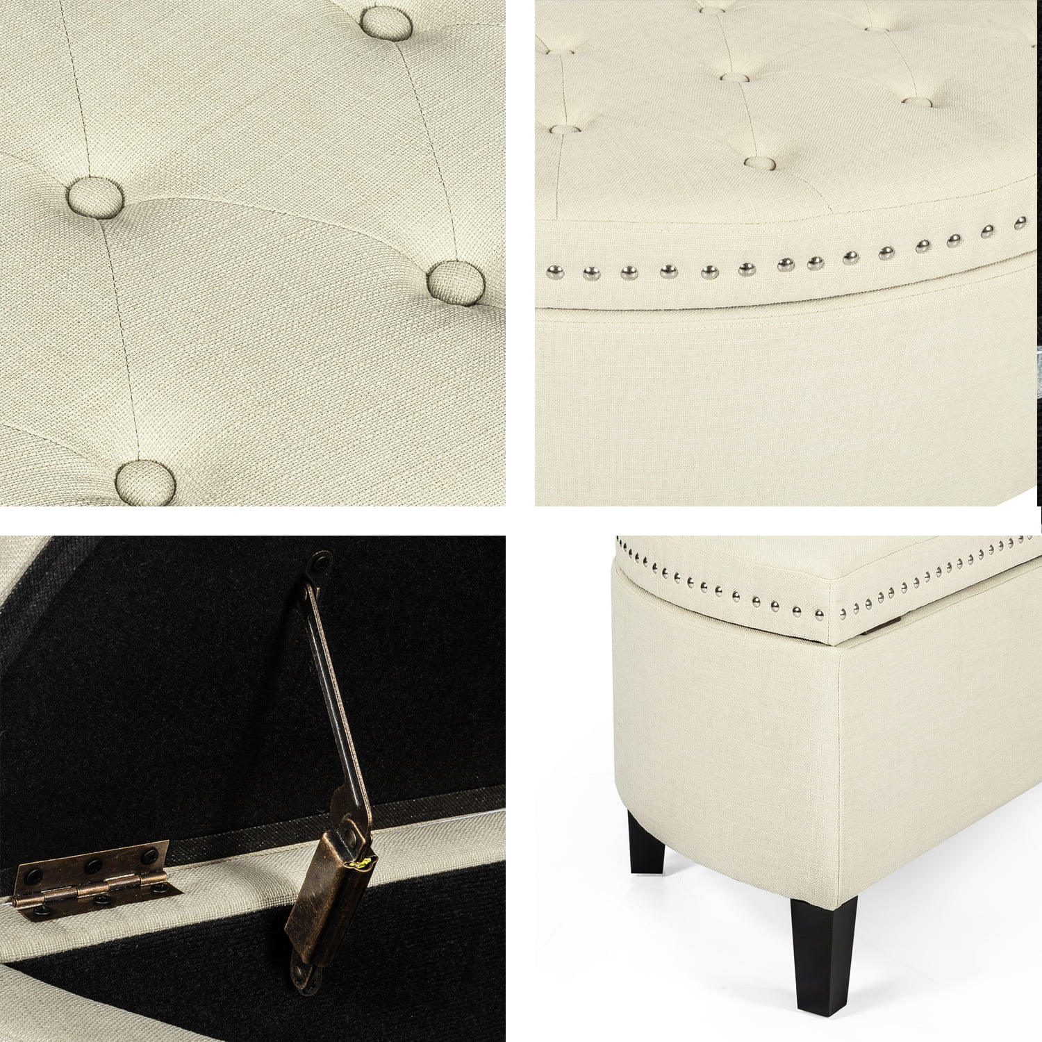 Homebeez 43.5" Half Moon Storage Ottoman Bench,Lift Top Button Bedroom Bench for Entryway Living Room,Beige