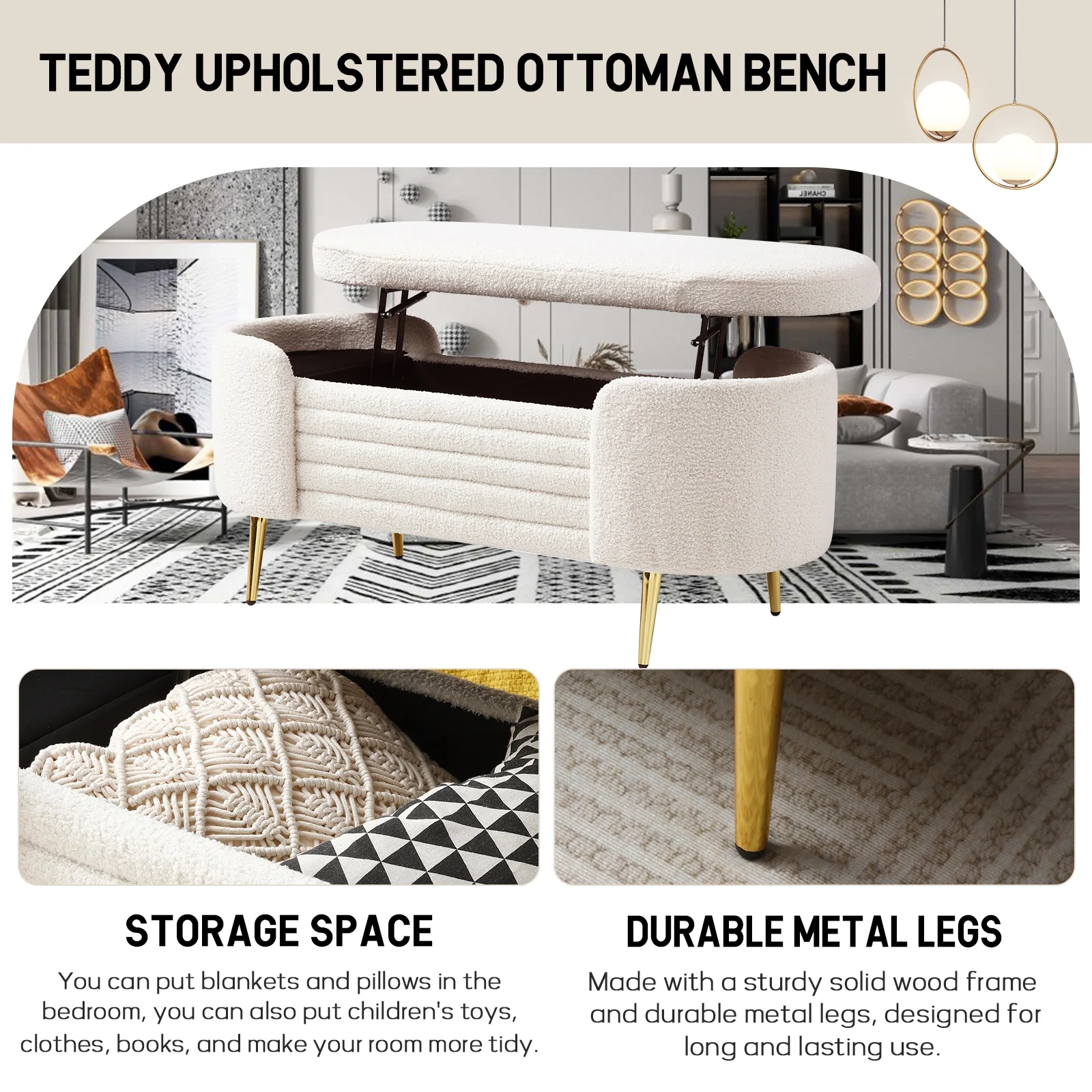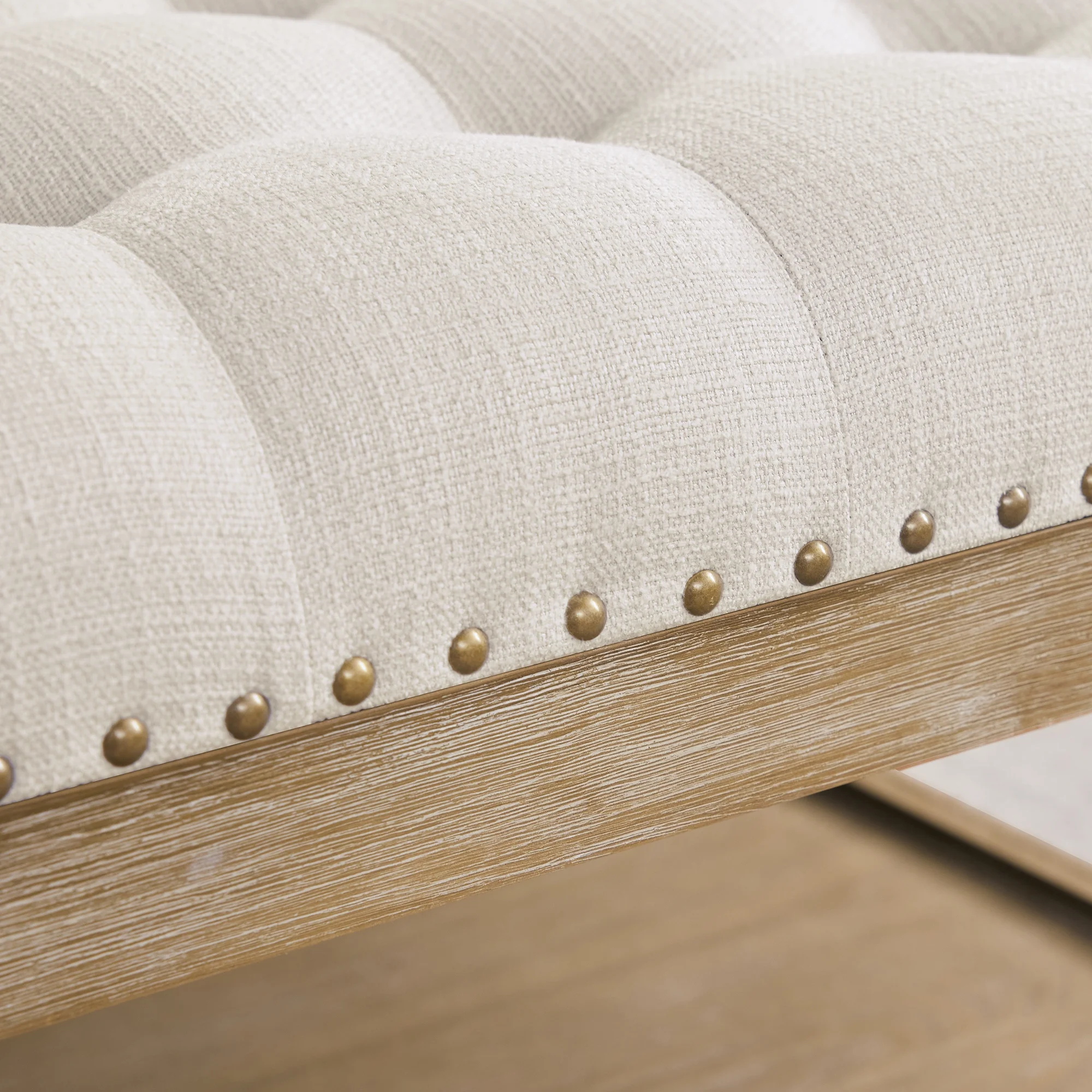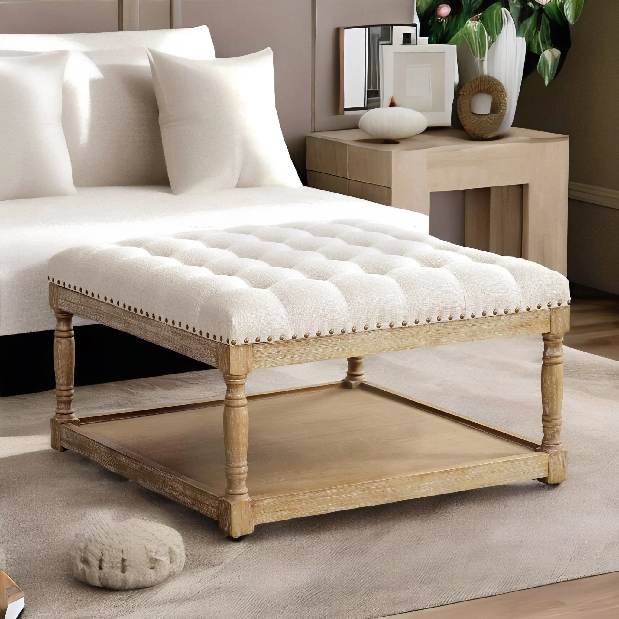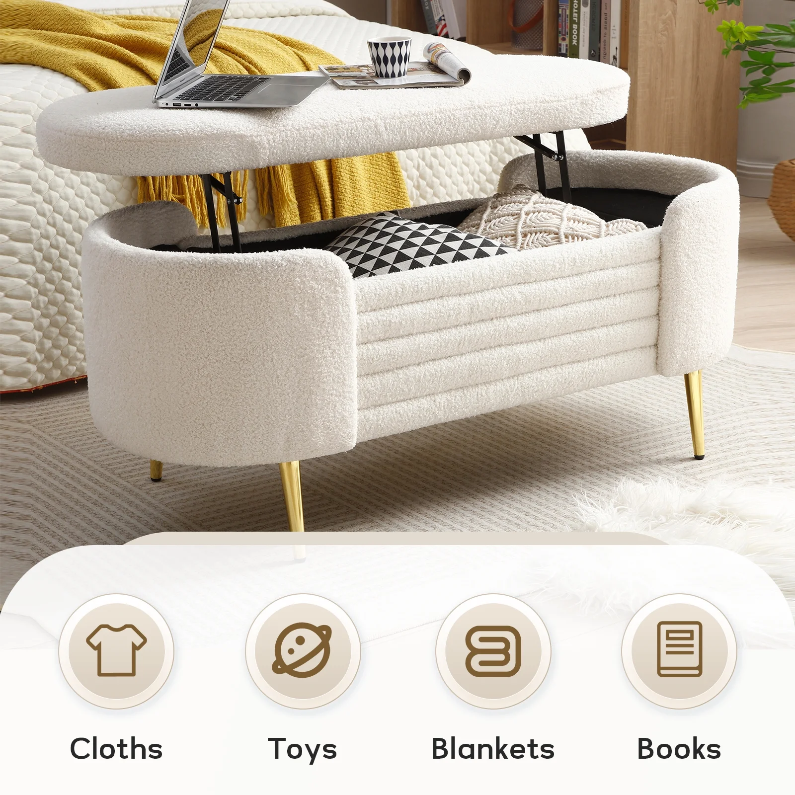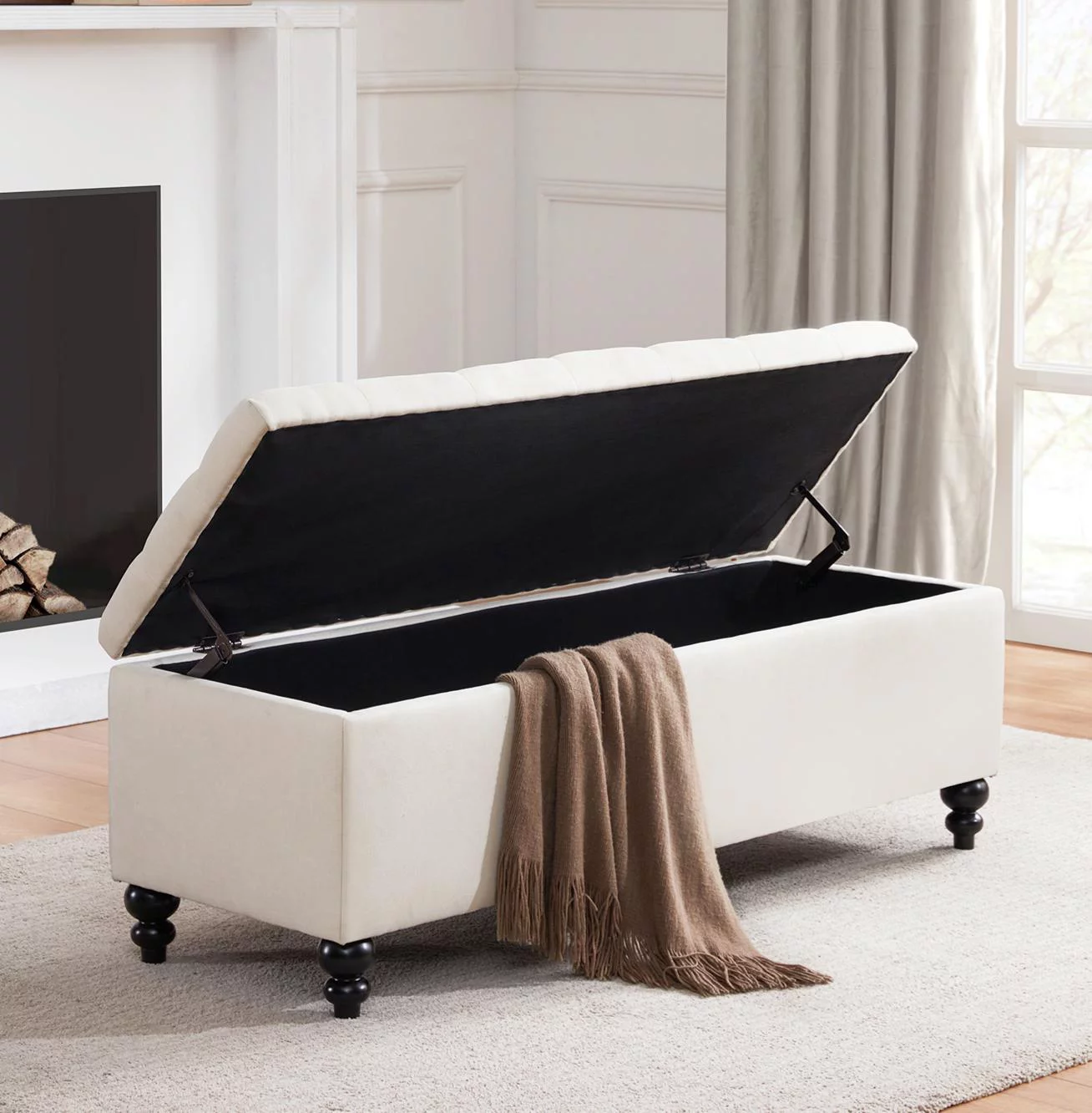 Homebeez 43.5" Half Moon Storage Ottoman Bench,Lift Top Button Bedroom Bench for Entryway Living Room,Beige