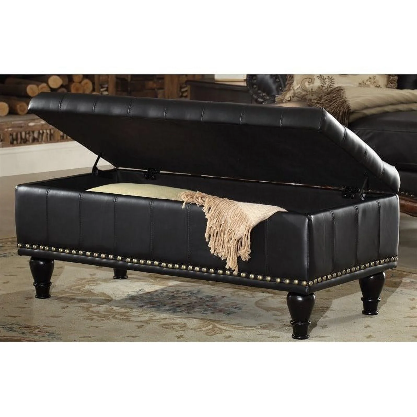 OSP Home Furnishings Caldwell Square Storage Ottoman in Black Bonded Leather with Decorative Nailheads