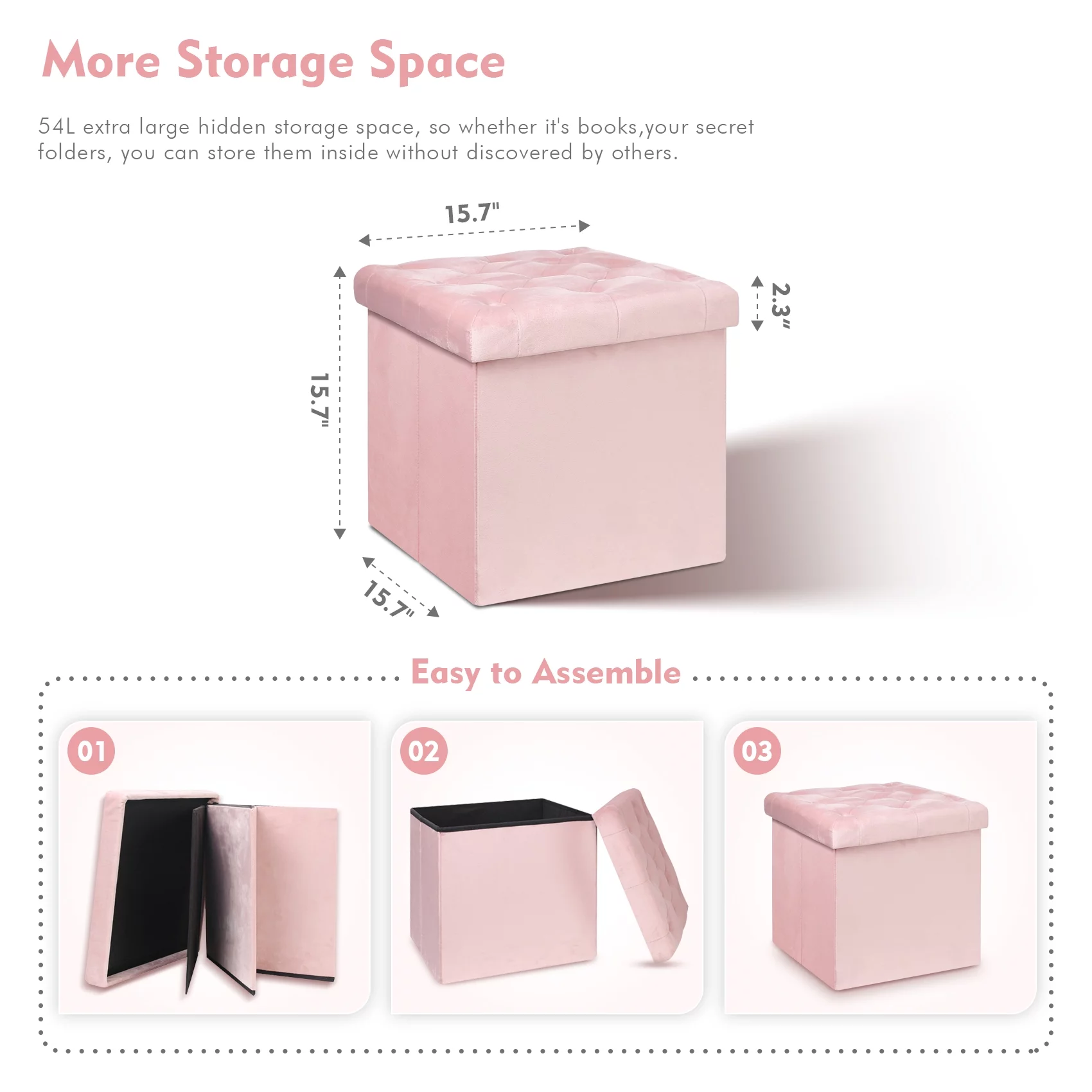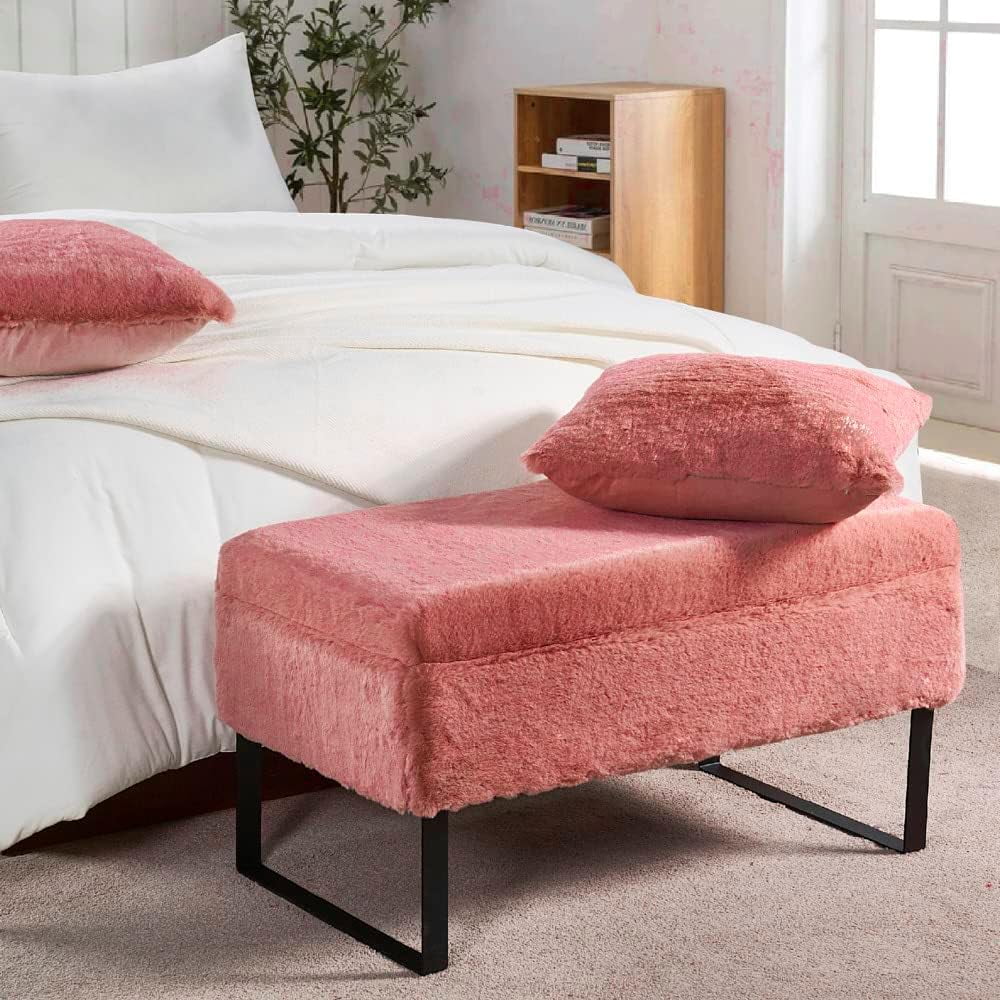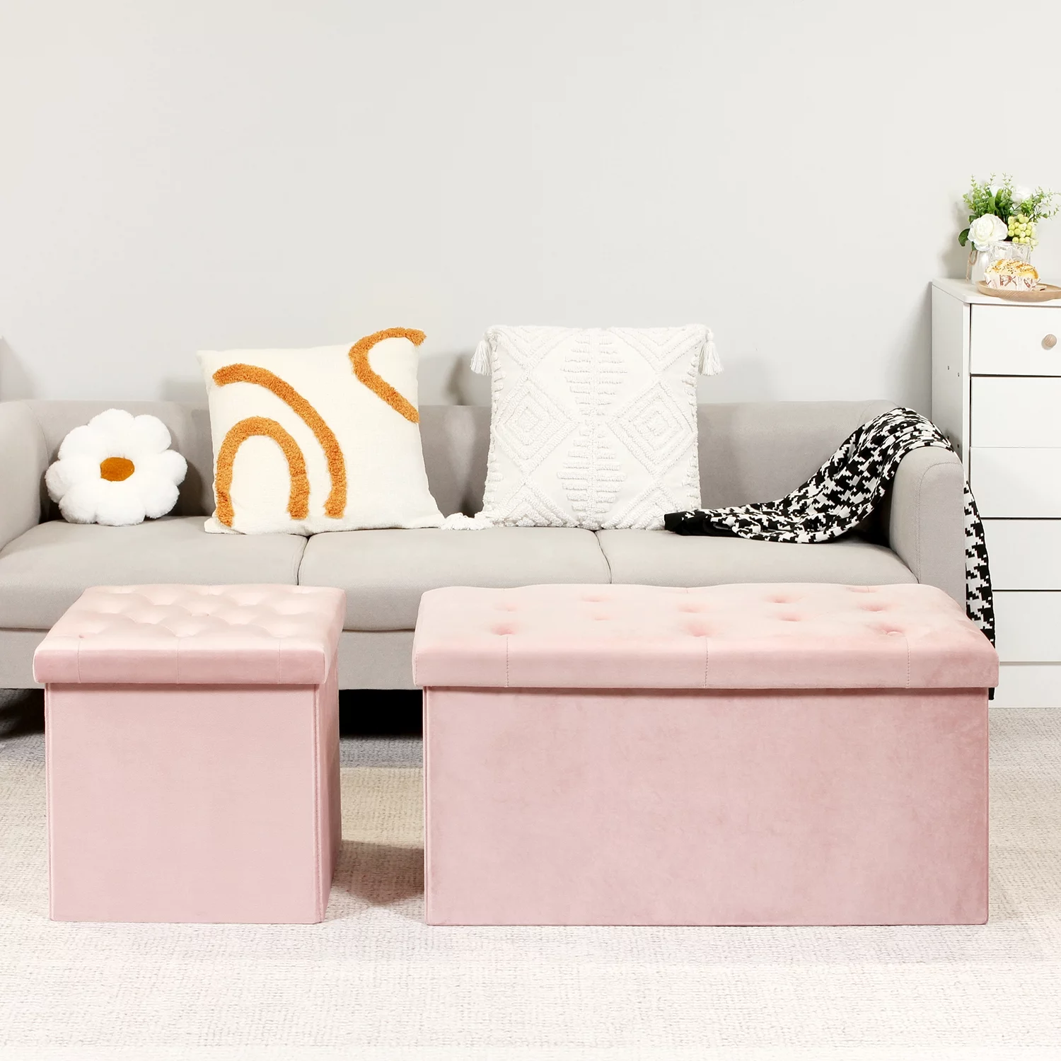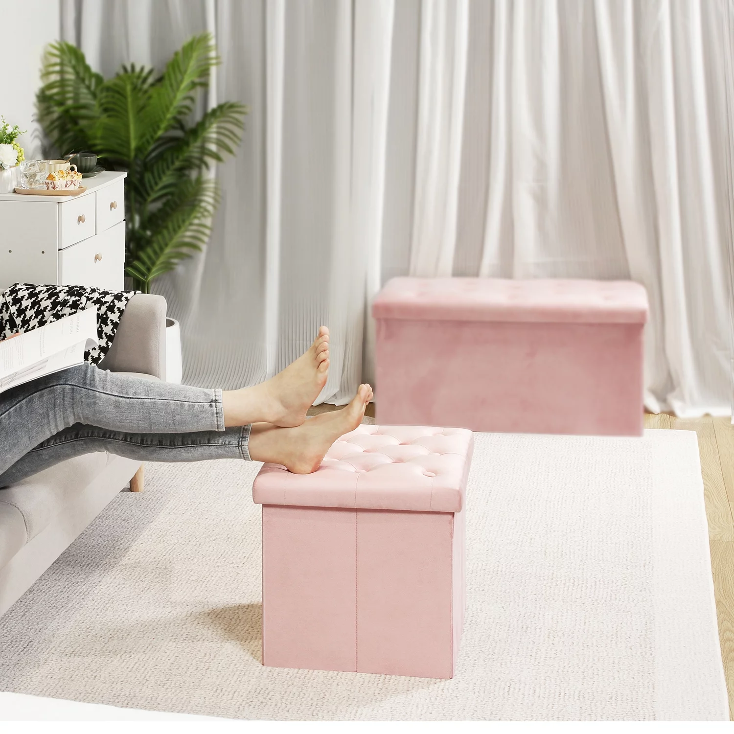 PINPLUS 30" & 15" Collapsible Ottoman Bench,Velvet Pink Storage, Toys Chest for girls, Foot Stool Rest Seat,Pack of 2