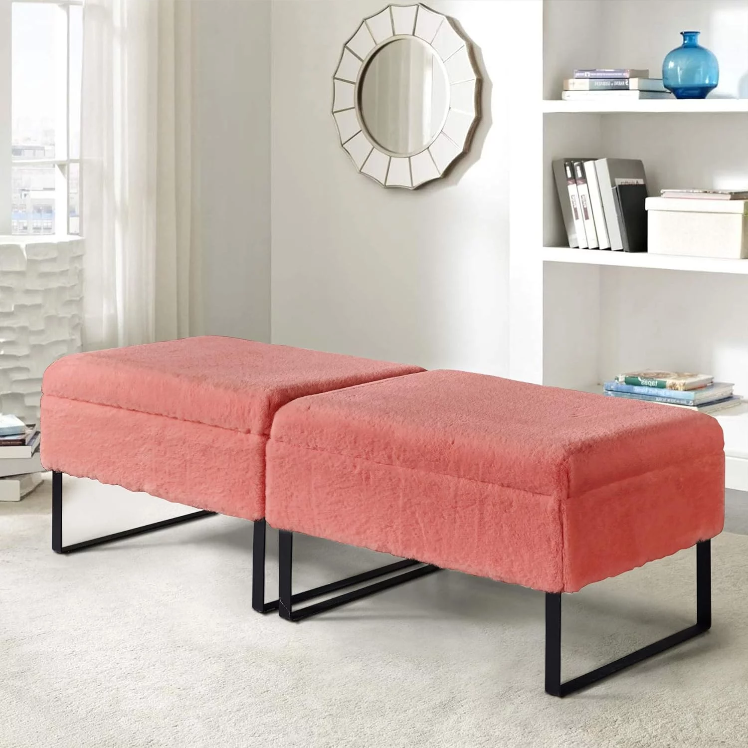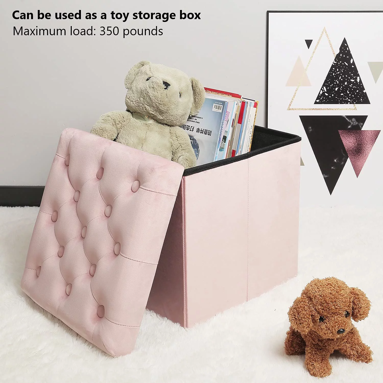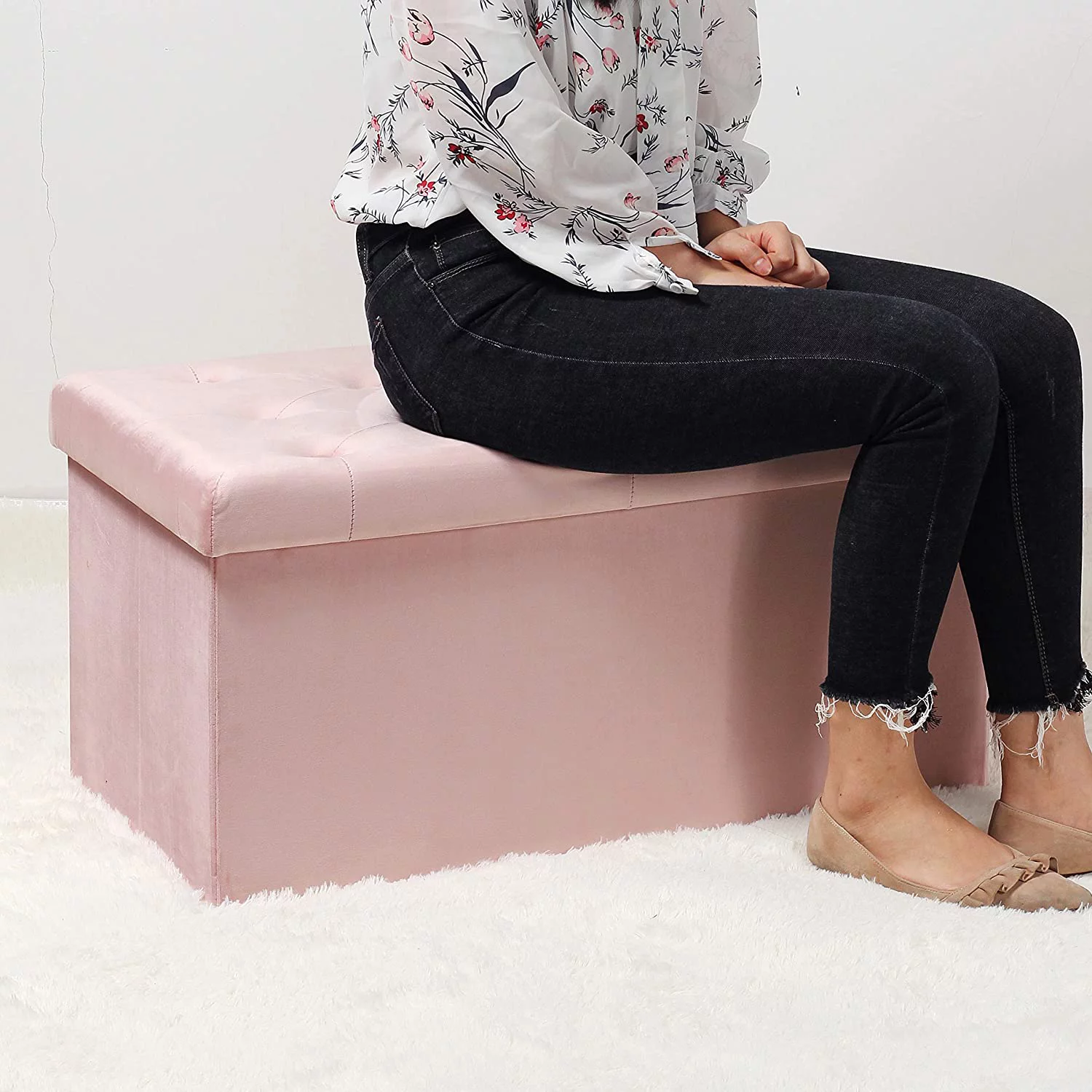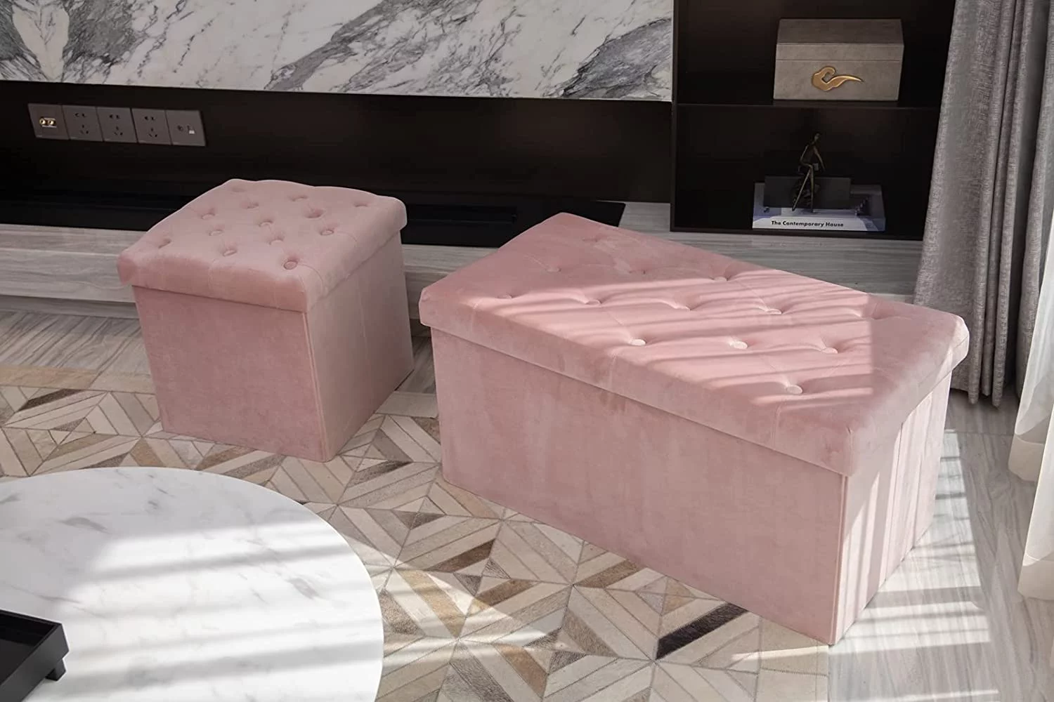 PINPLUS 30" & 15" Collapsible Ottoman Bench,Velvet Pink Storage, Toys Chest for girls, Foot Stool Rest Seat,Pack of 2