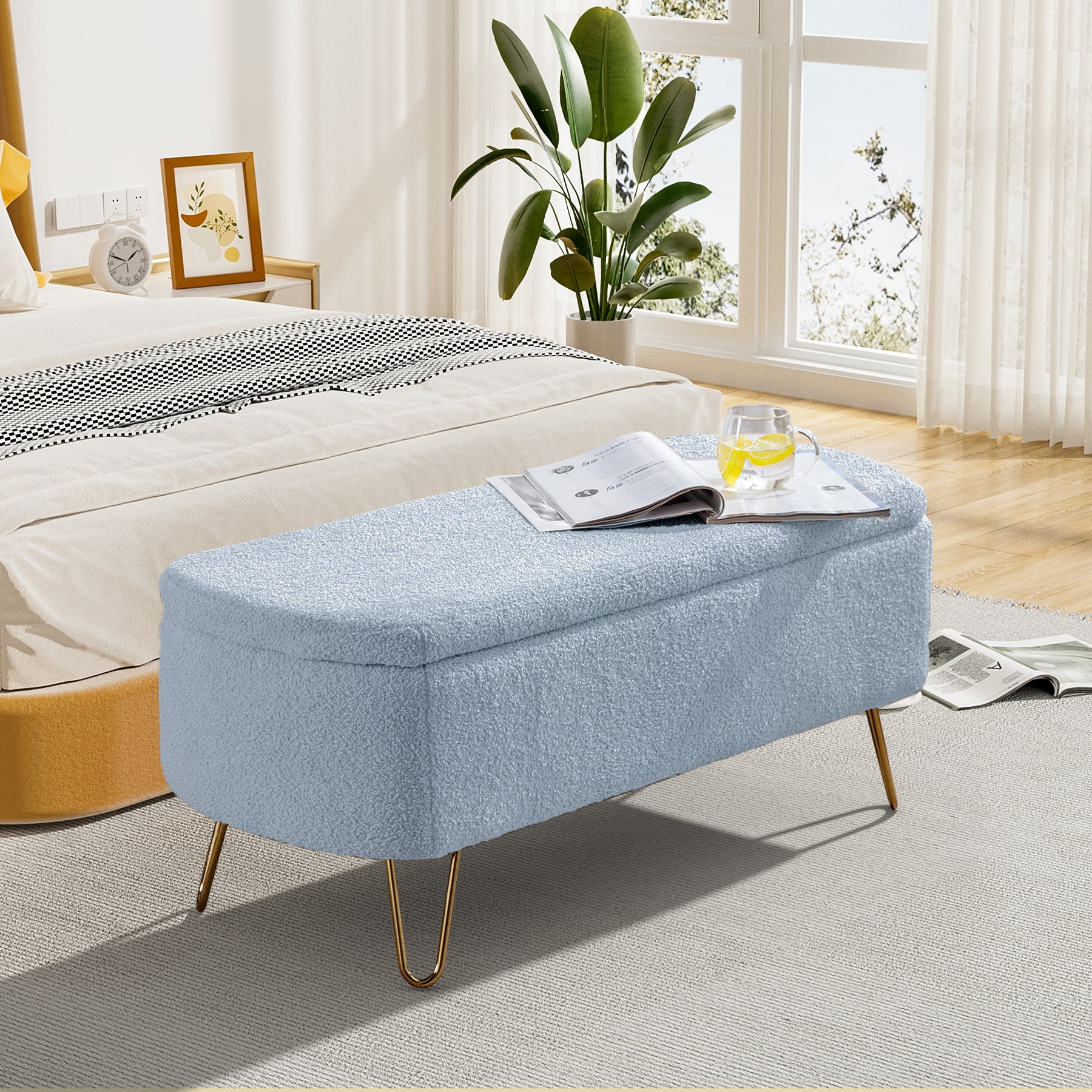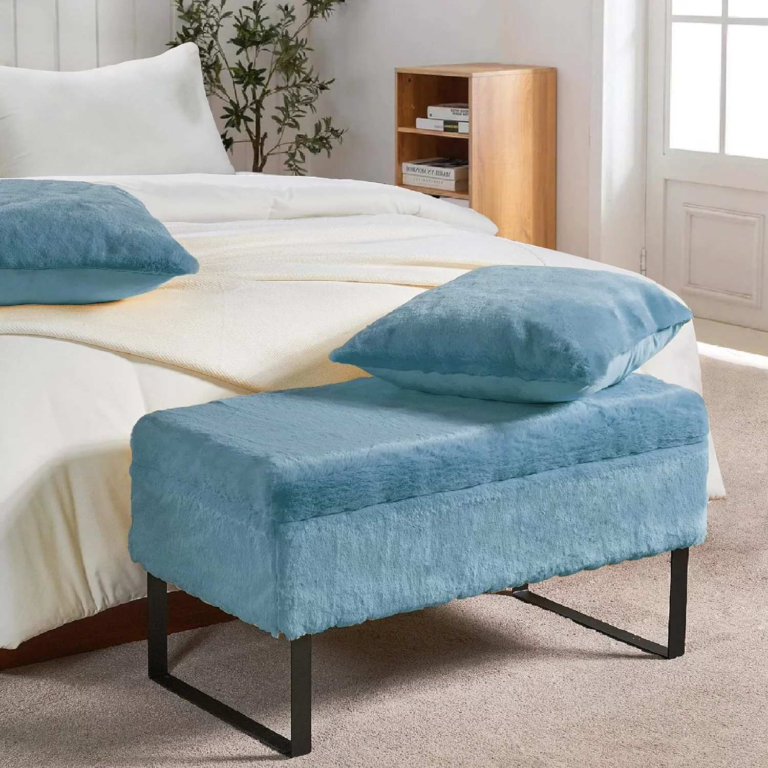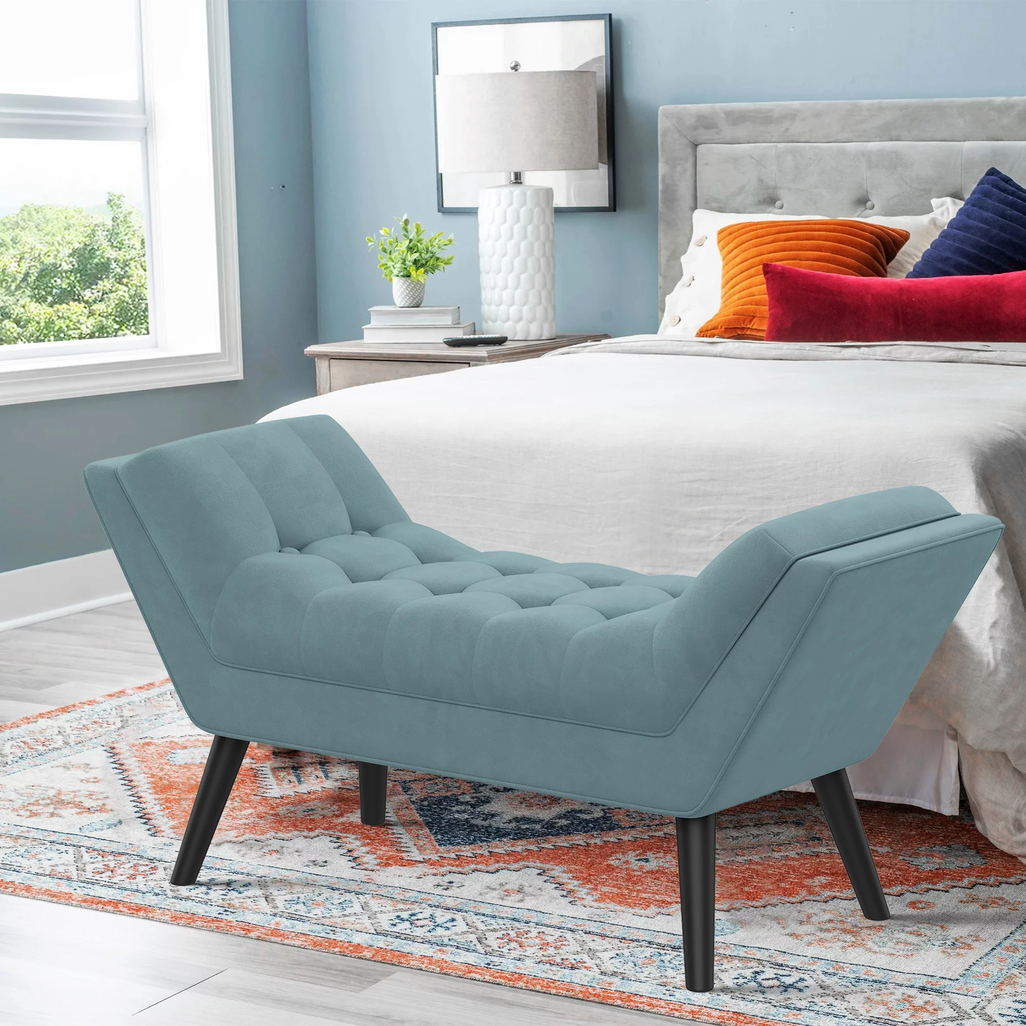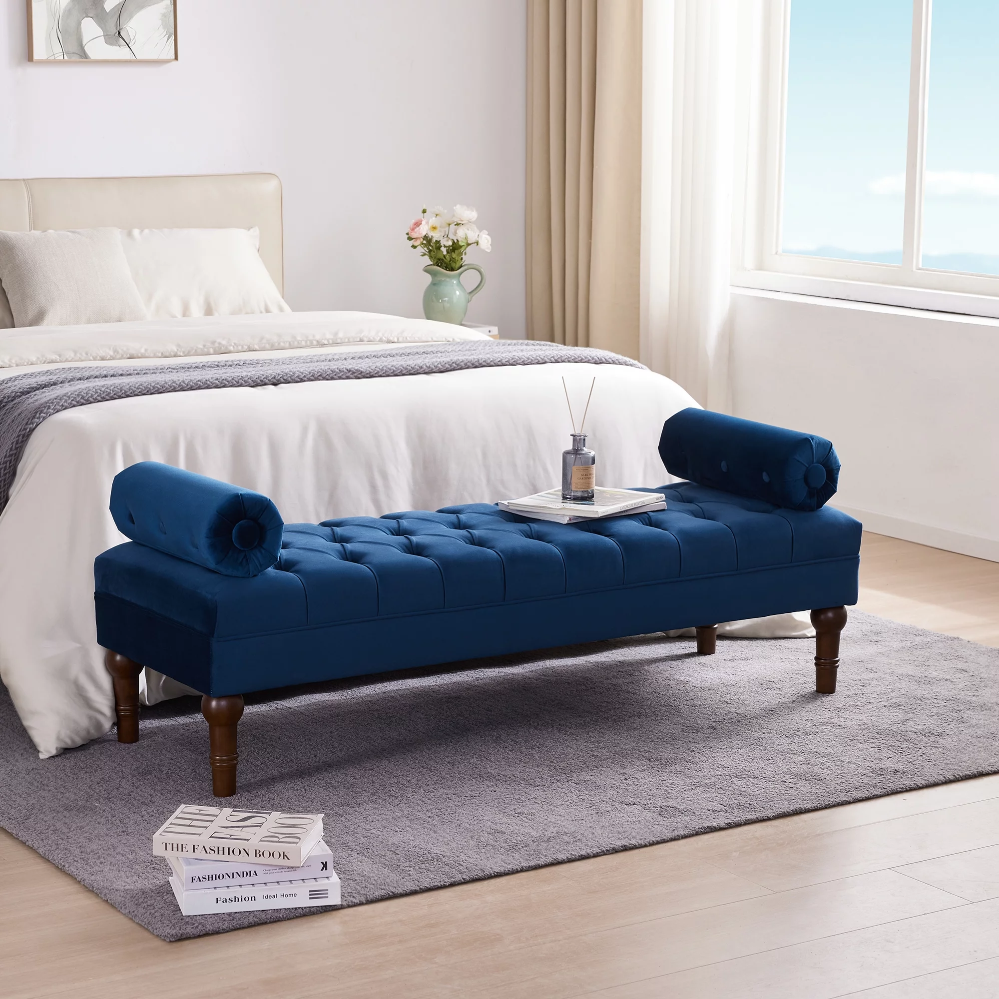 Andeworld Bed Bench Upholstered Tufted Footstool Entryway Ottoman Bench Two Seaters (Blue)