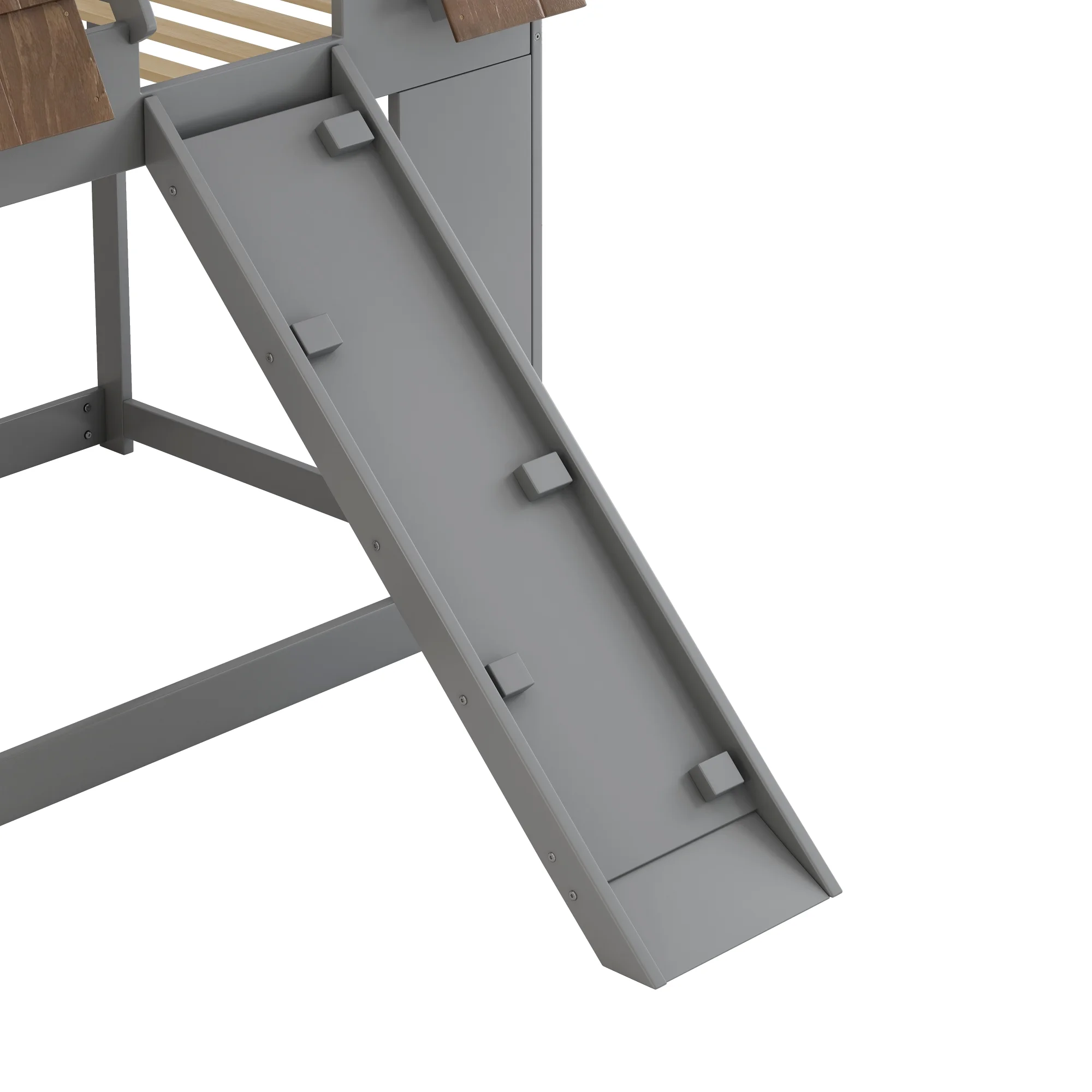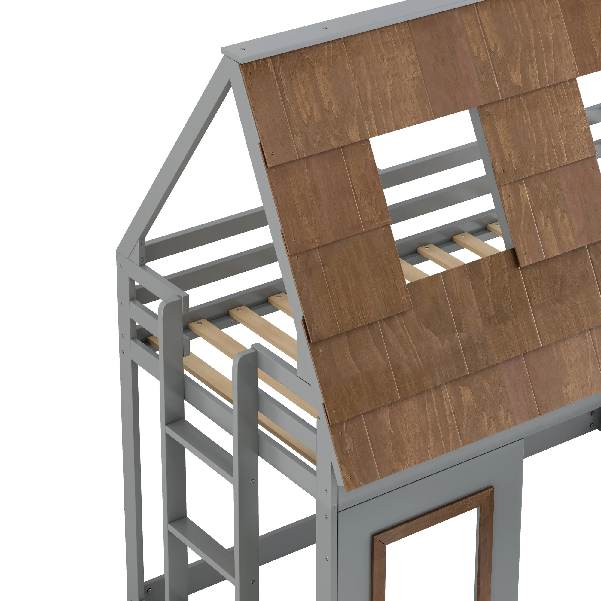 Cozy and Fun Wood Twin Size House Bunk Bed with Window Roof Shape Design with Ladder and Slide, Brown+Gray