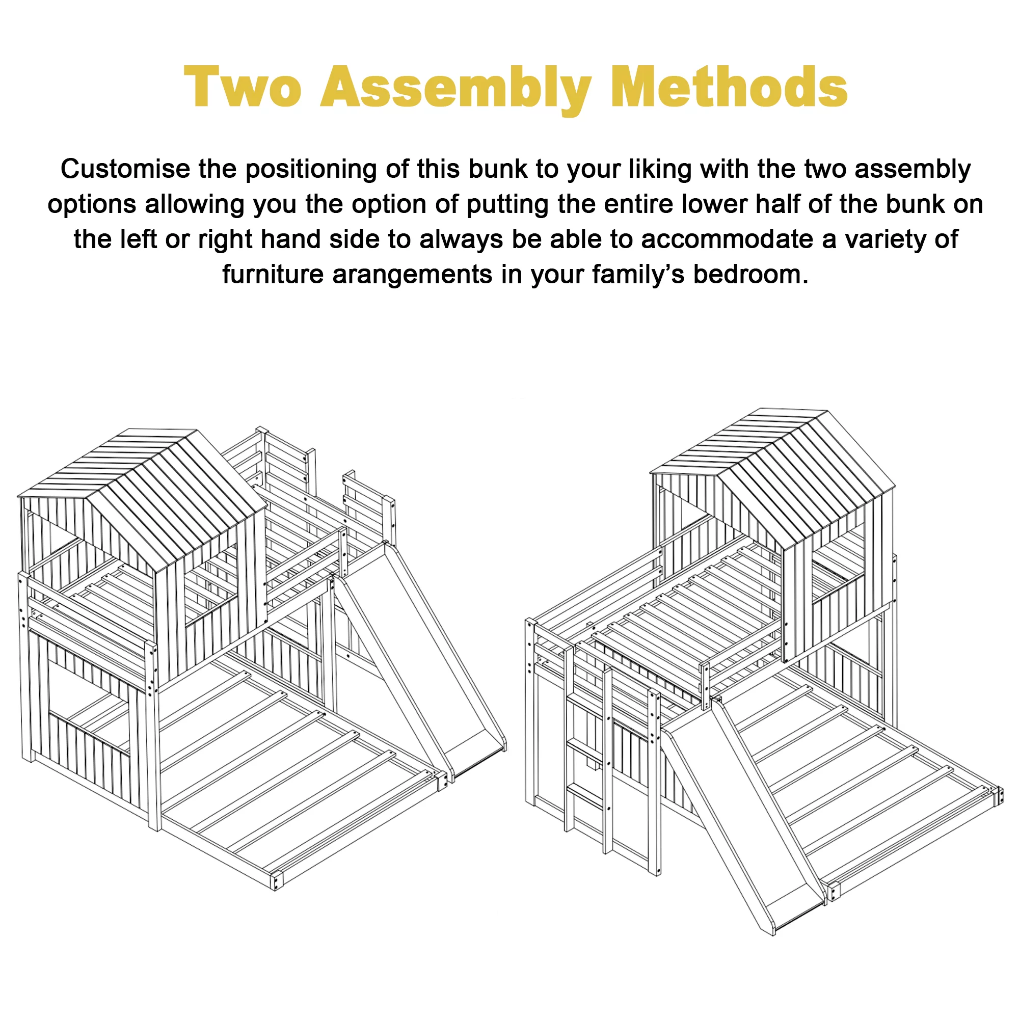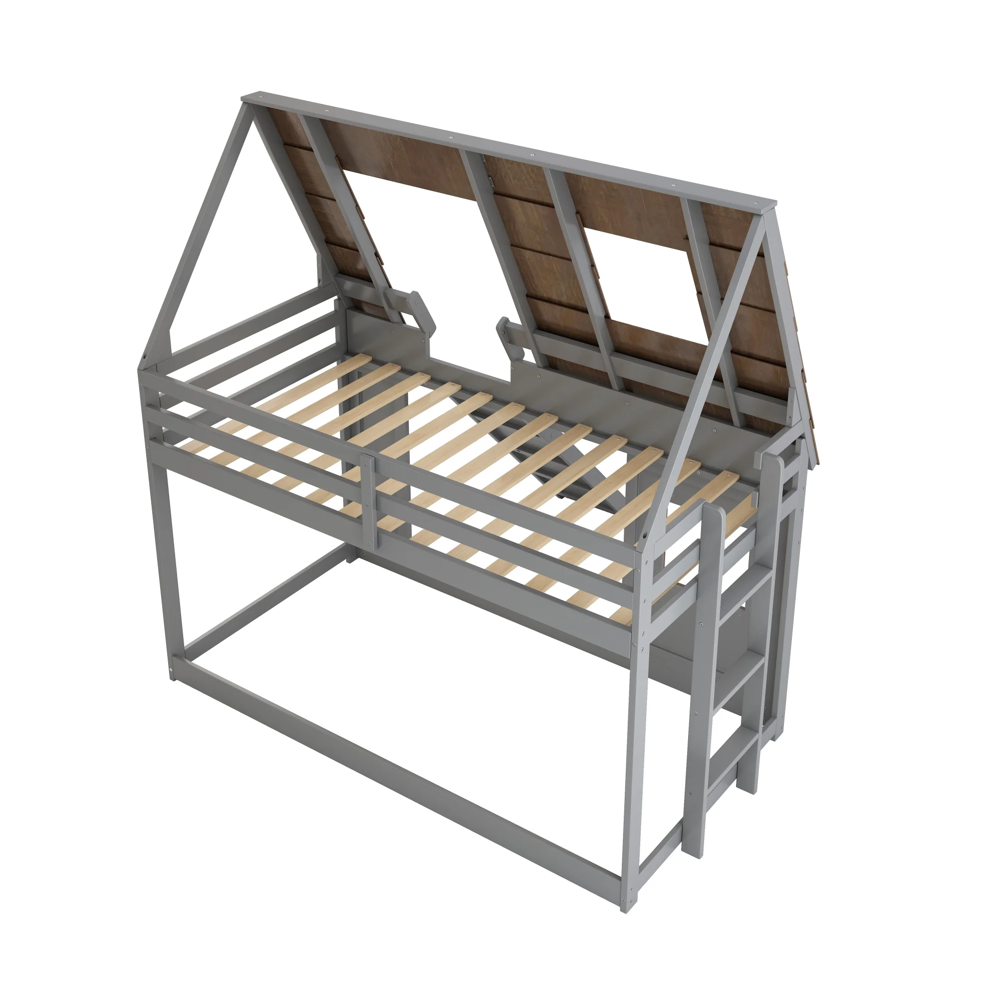 Twin-Size Wooden Bunk Bed with House-Inspired Design, Roof Window, Ladder & Slide - Brown & Gray