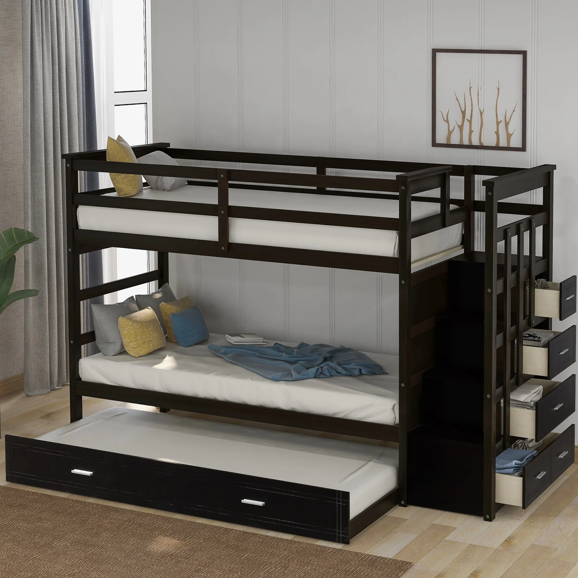 AFI Woodland Staircase Bunk Bed Twin over Twin with Twin Trundle in Walnut