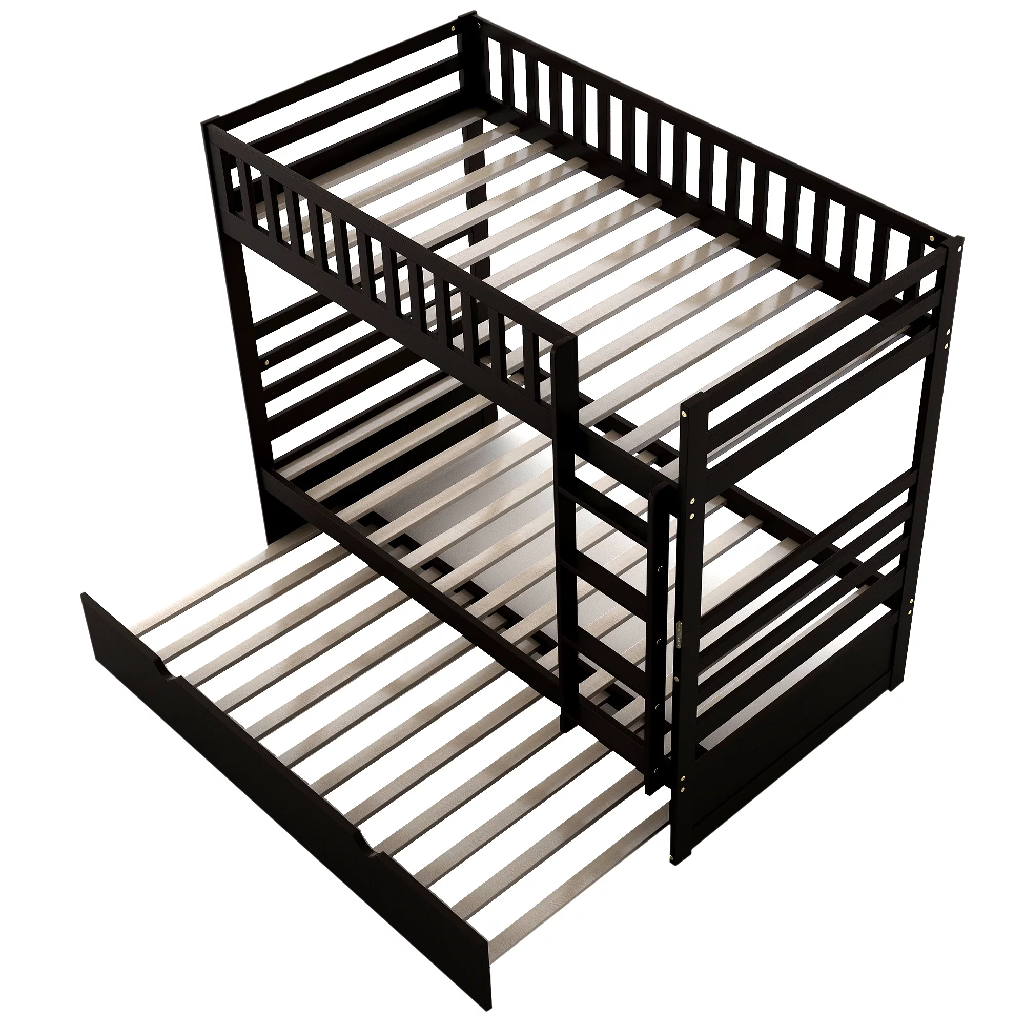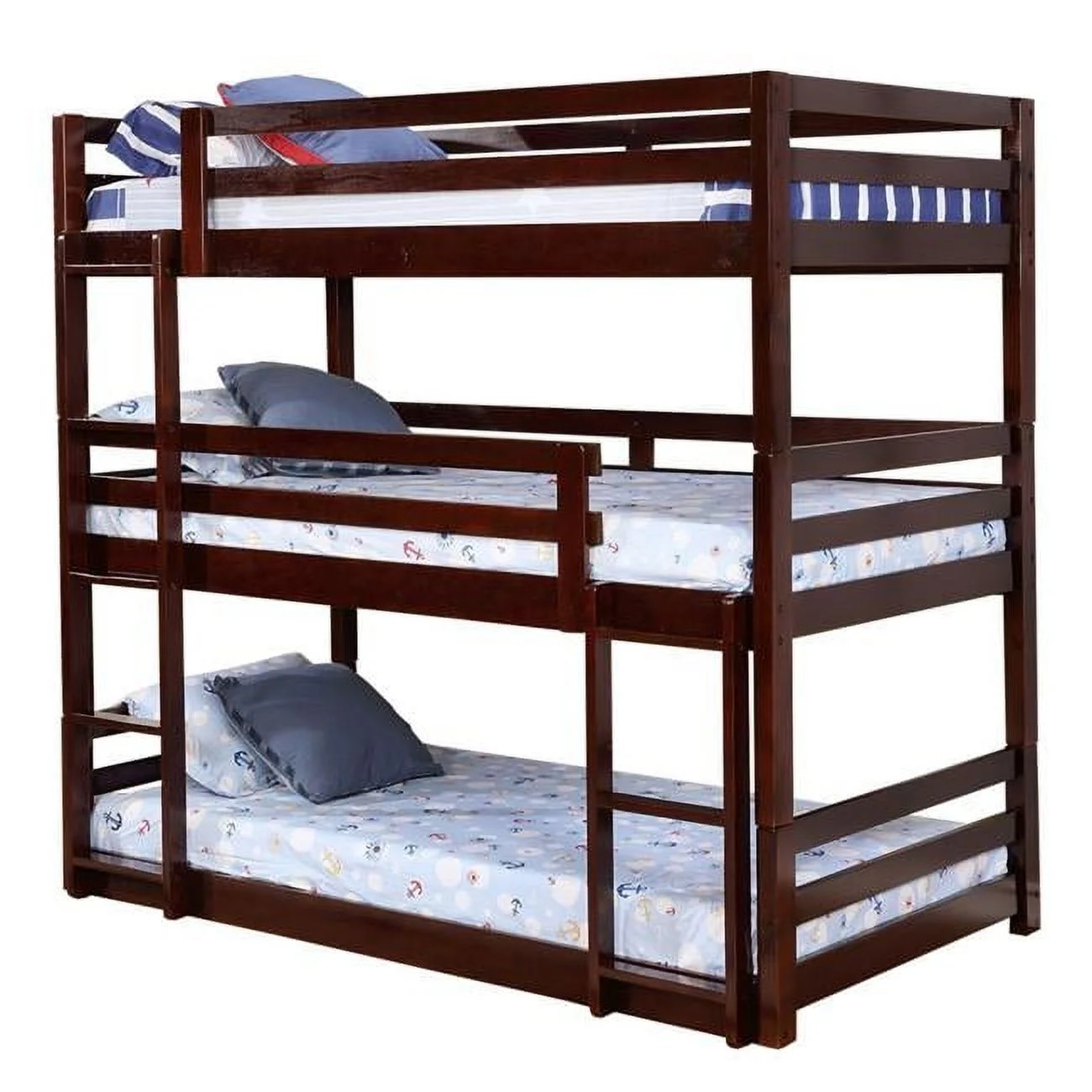 3 Tier Design Wooden Twin Size Bunk Bed with Attached Guardrails, Brown