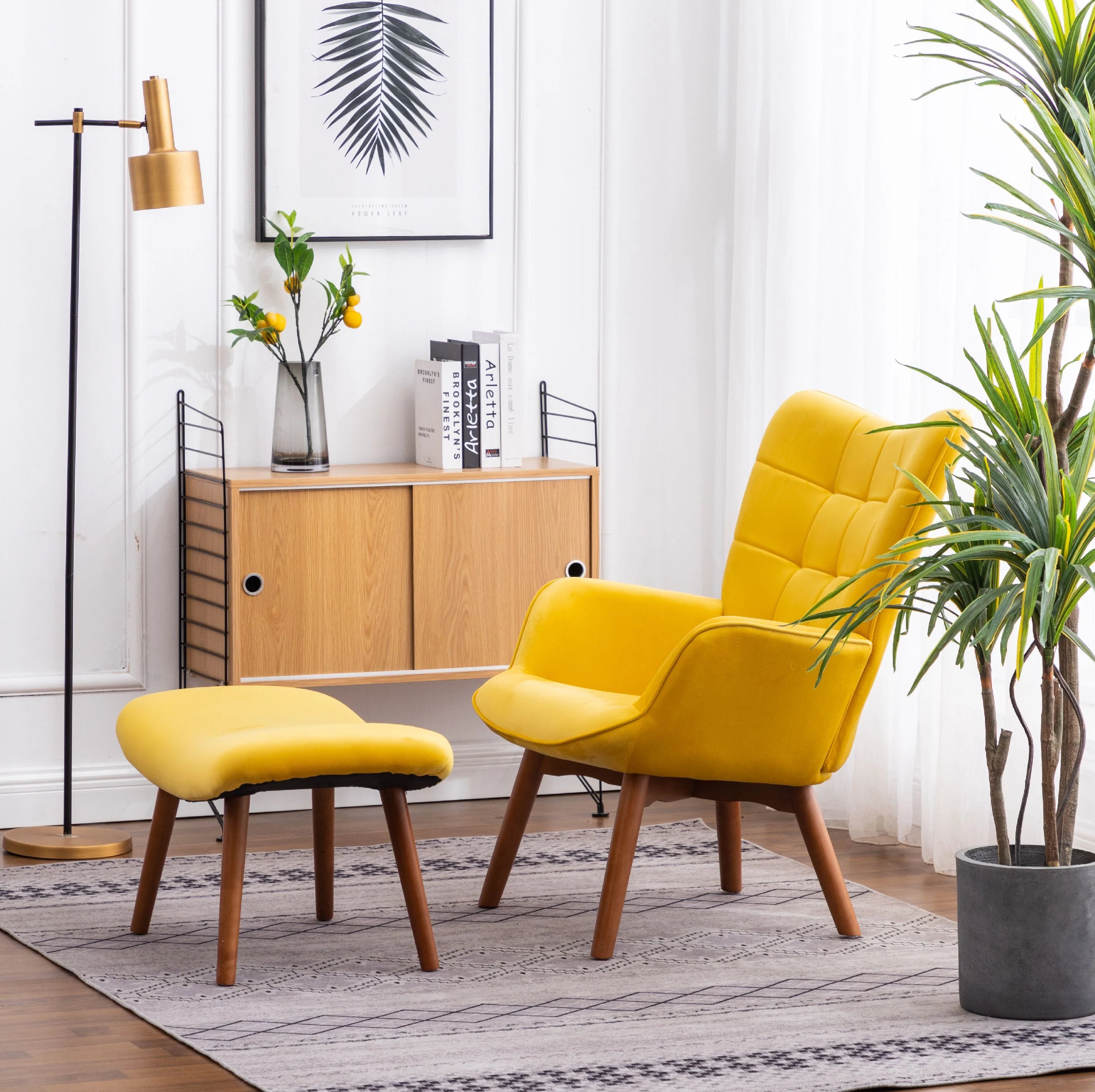 Roundhill Furniture Leiria Velvet Tufted Accent Chair with Ottoman in Yellow