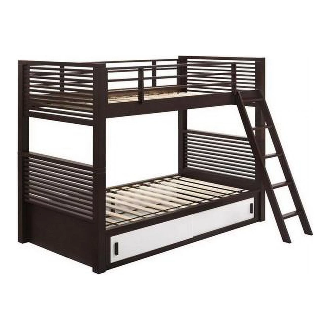 Transitional Twin Over Twin Bed with Attached Ladder and Drawers, Brown- Saltoro Sherpi