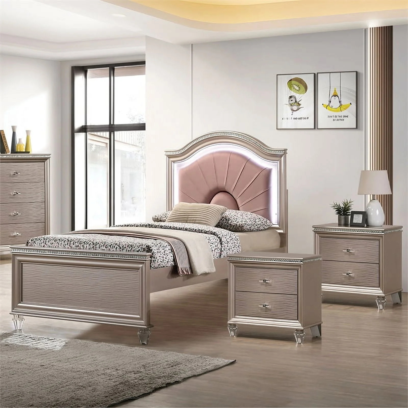 FOA Devado 3-Piece Rose Gold Solid Wood Bedroom Set - Twin + 2 Nightstands