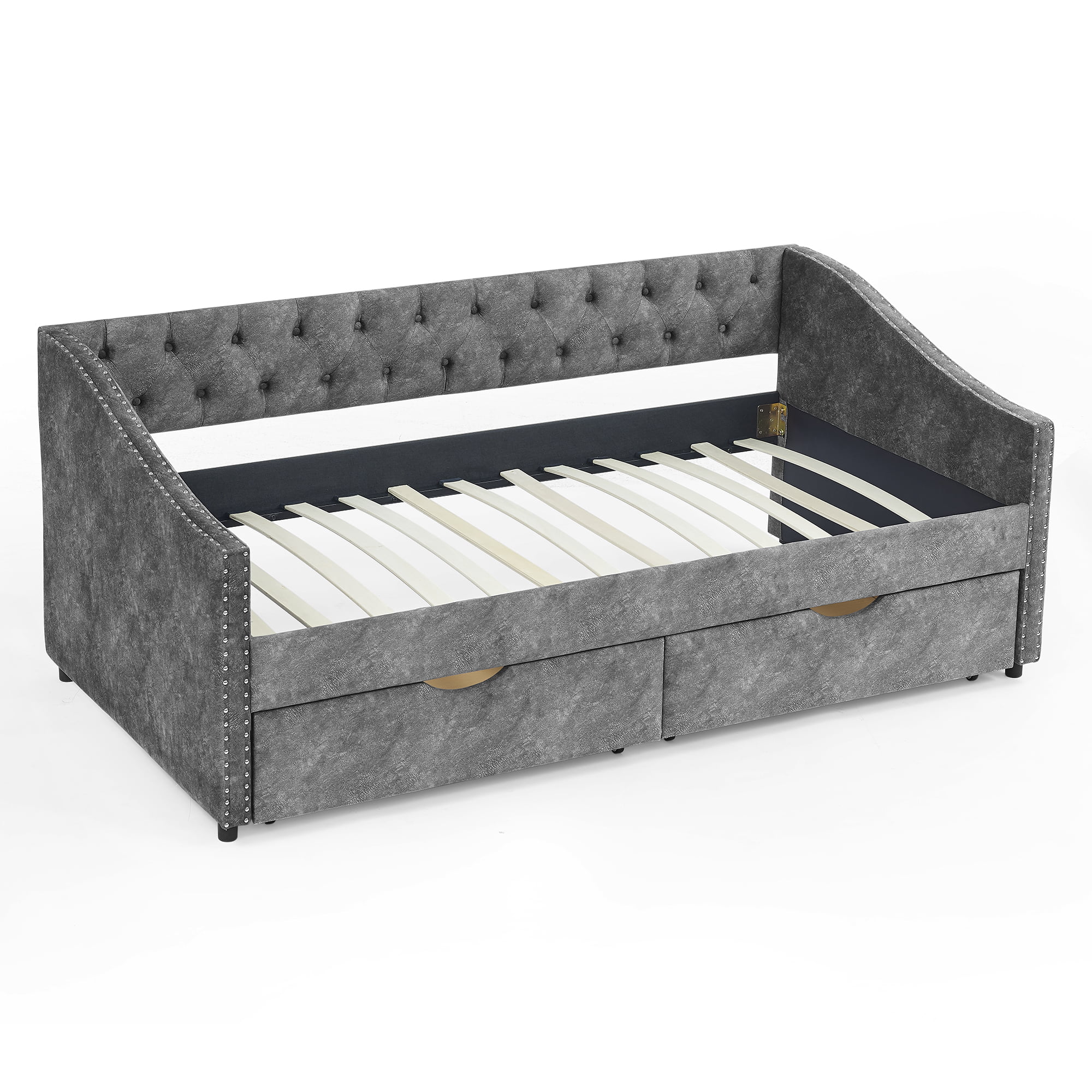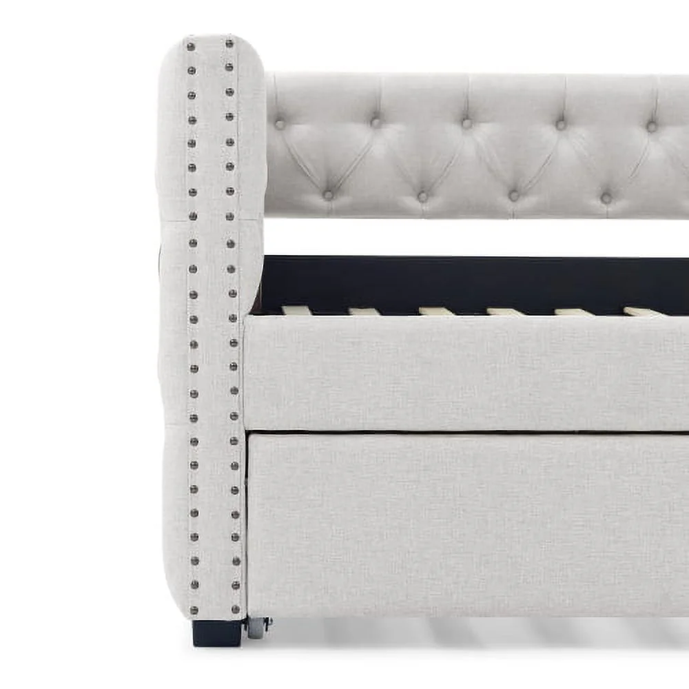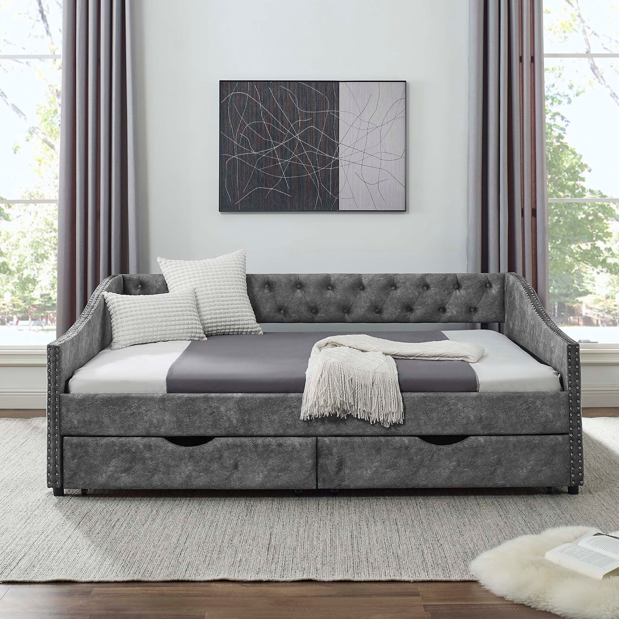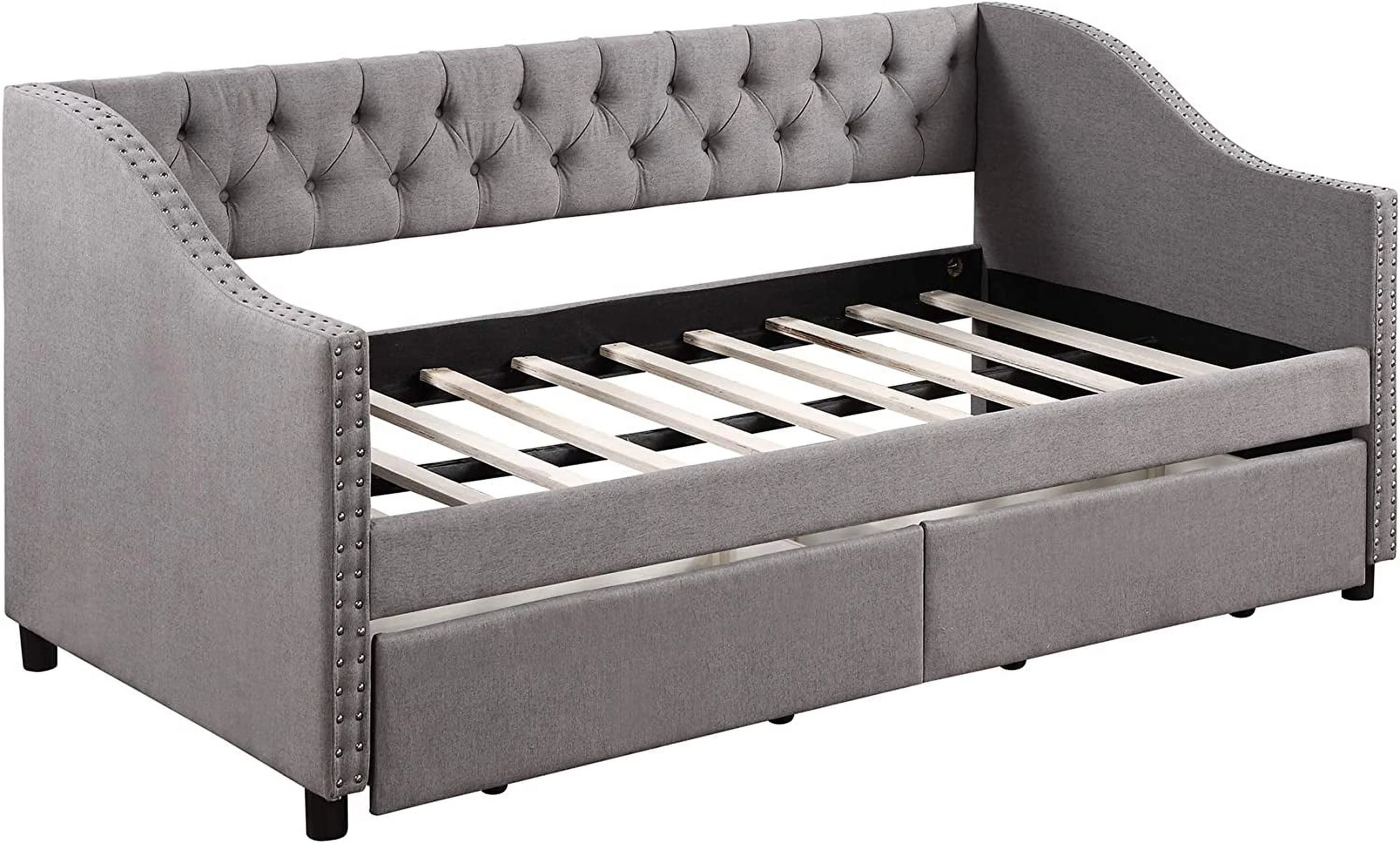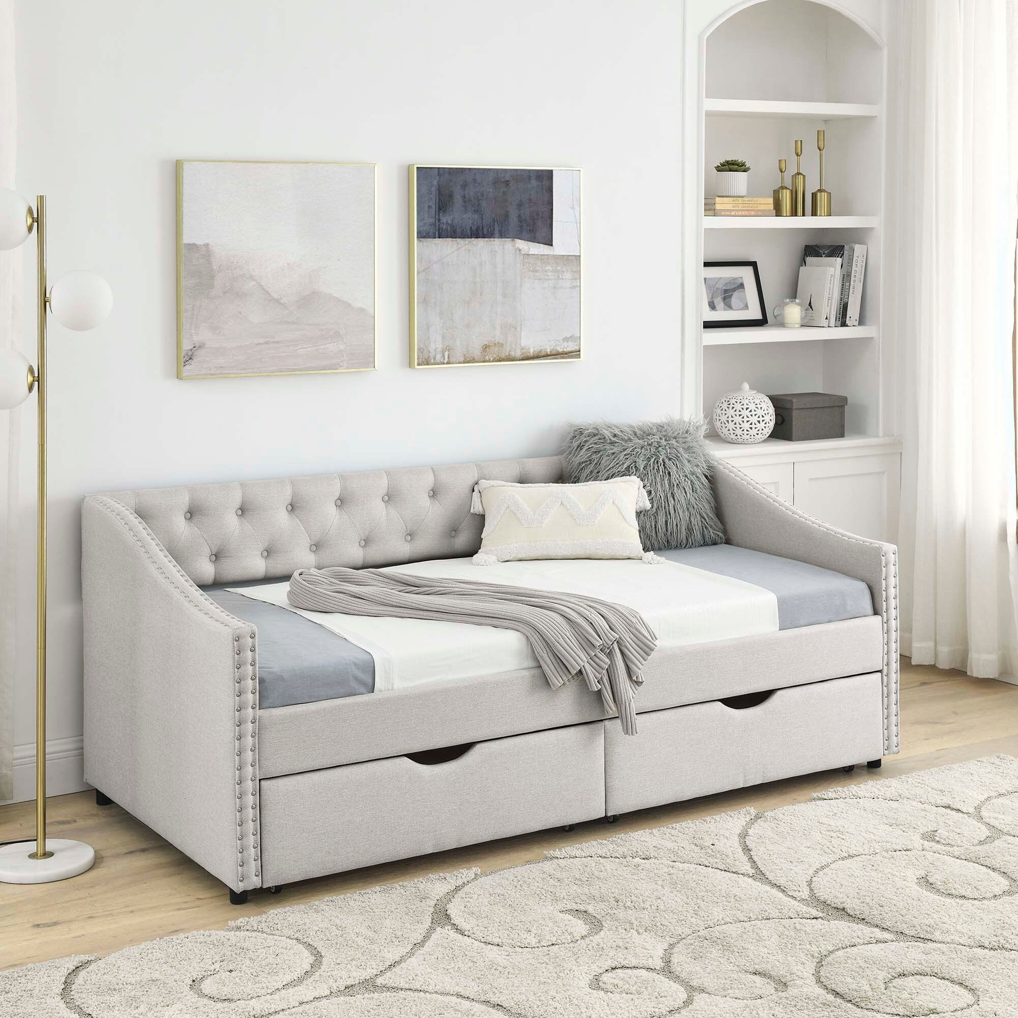 Twin Upholstered Daybed with Drawers and Wood Slat Support Sofa Bed Tufted Daybed Frame with Button Back for Living Room