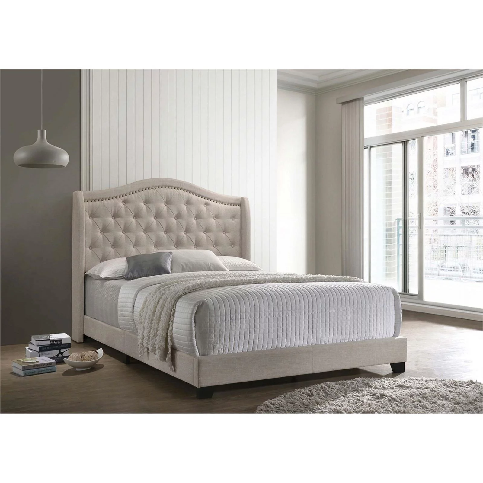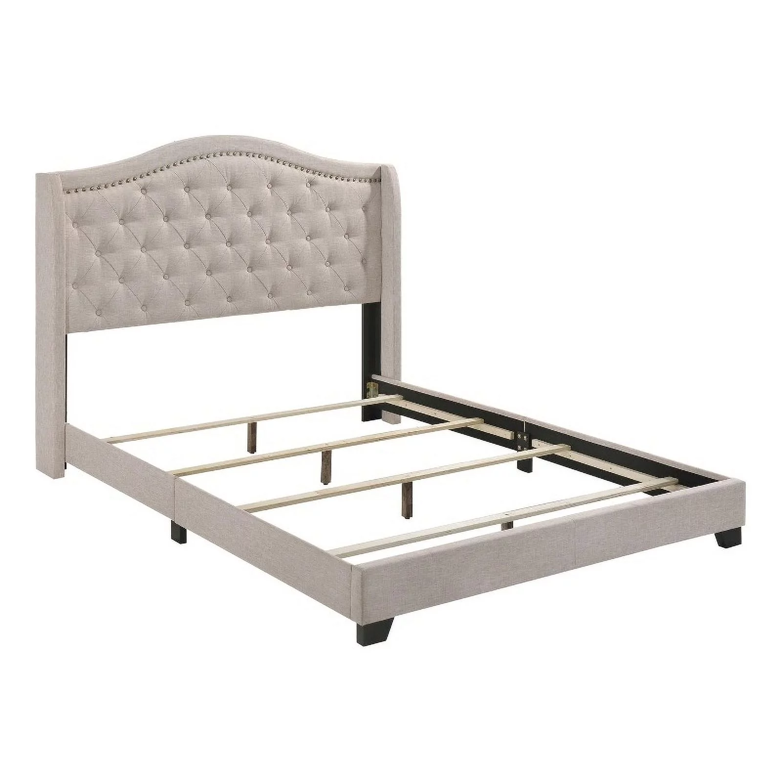 Pemberly Row Transitional Fabric Upholstered Camel Back Queen Bed Beige