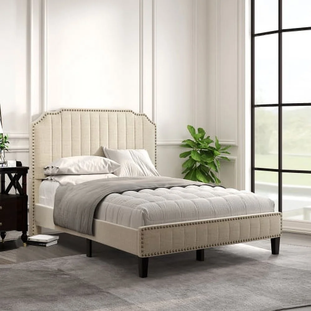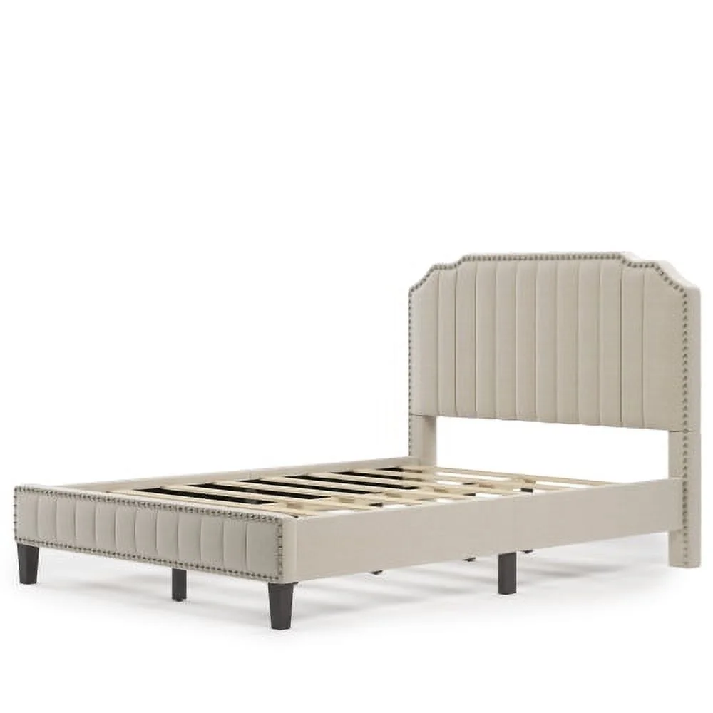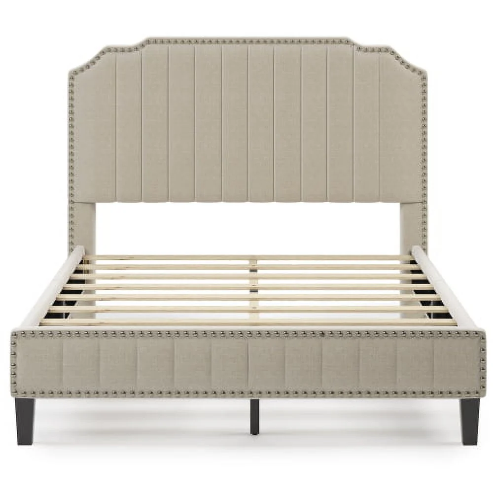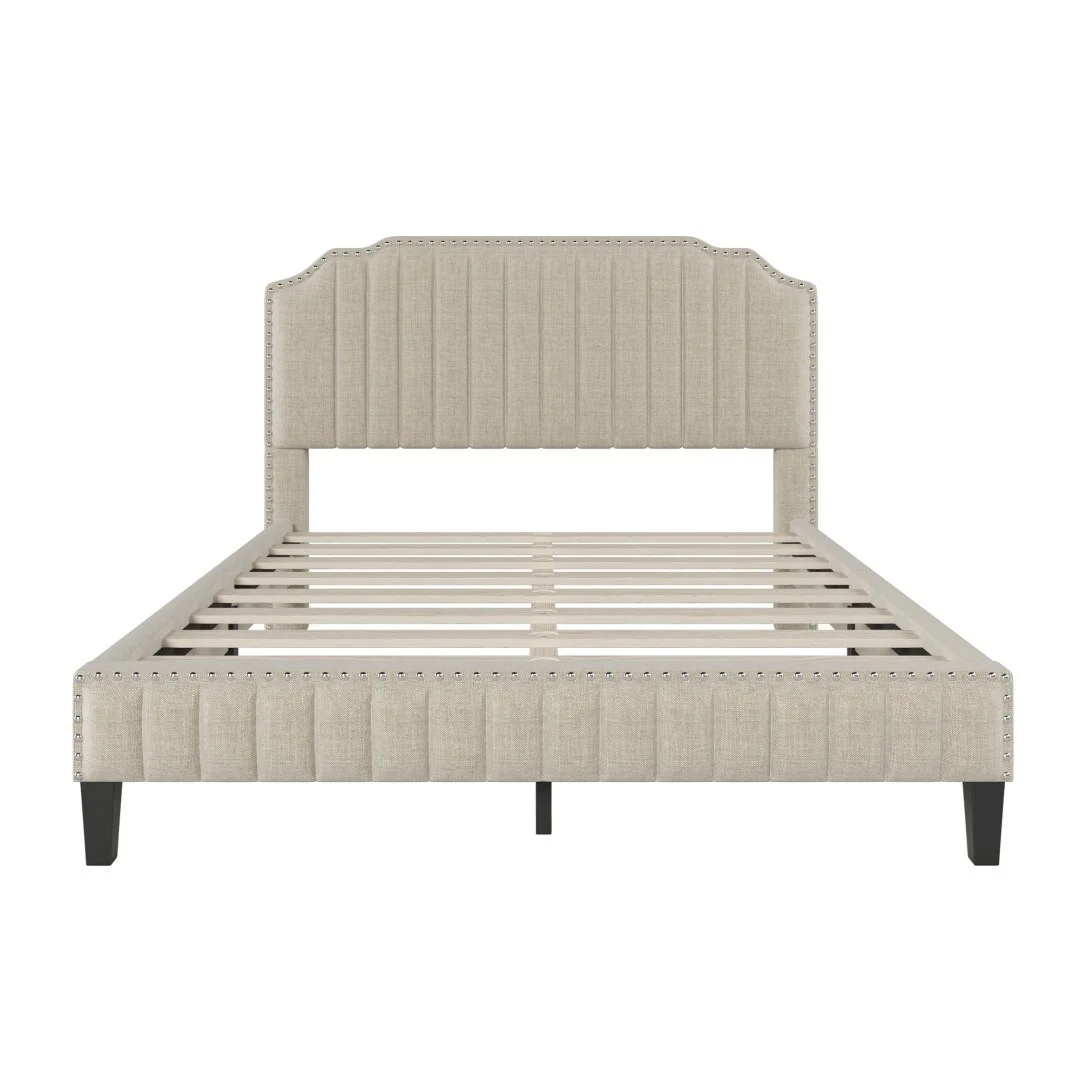 Linen Curved Upholstered Platform Bed with Solid Wood Frame&Nailhead Trim (Full)