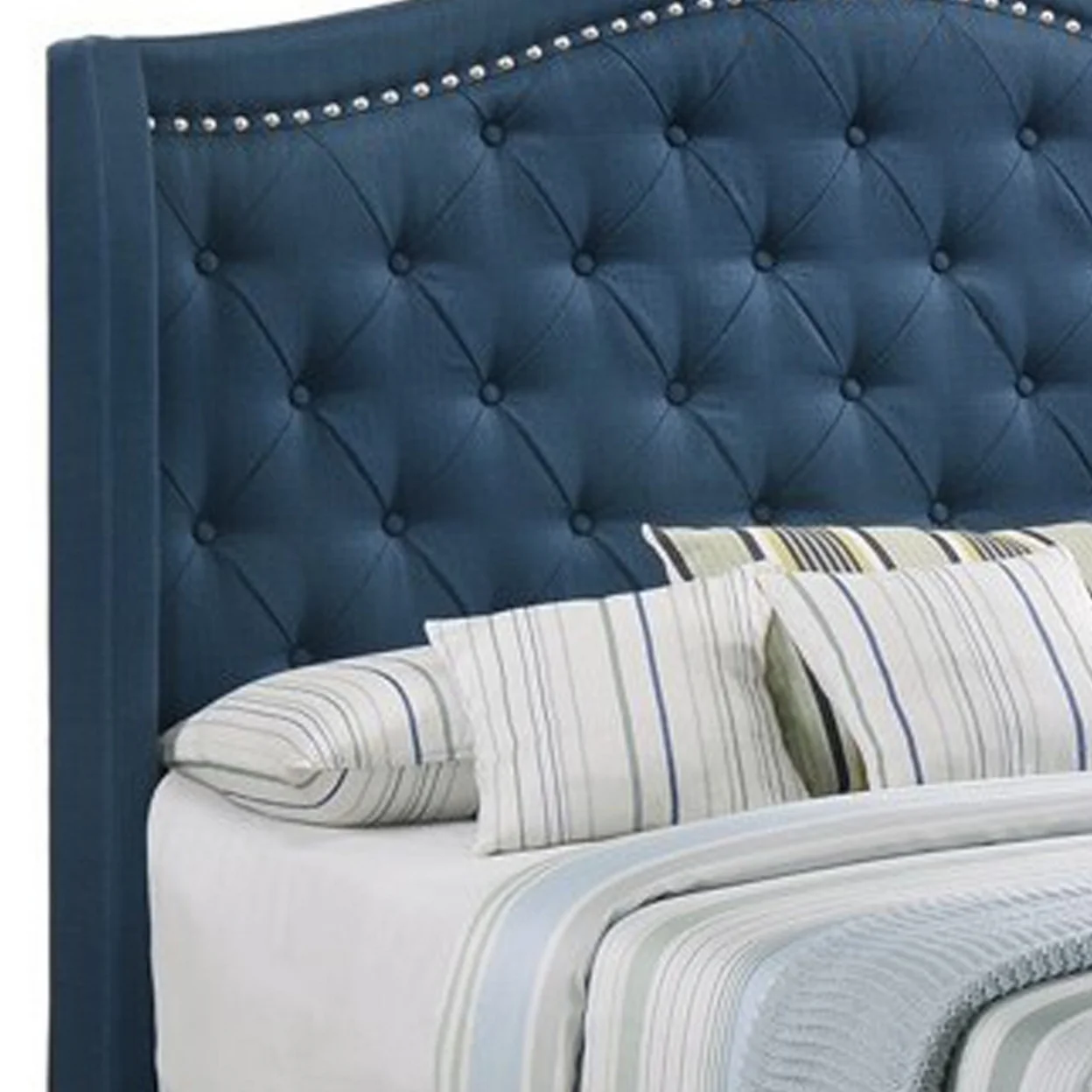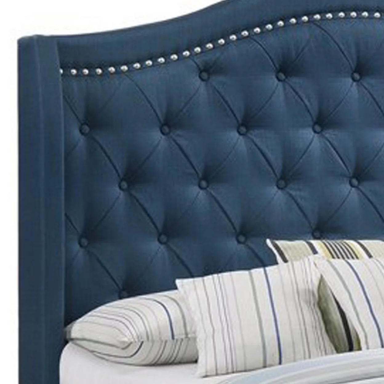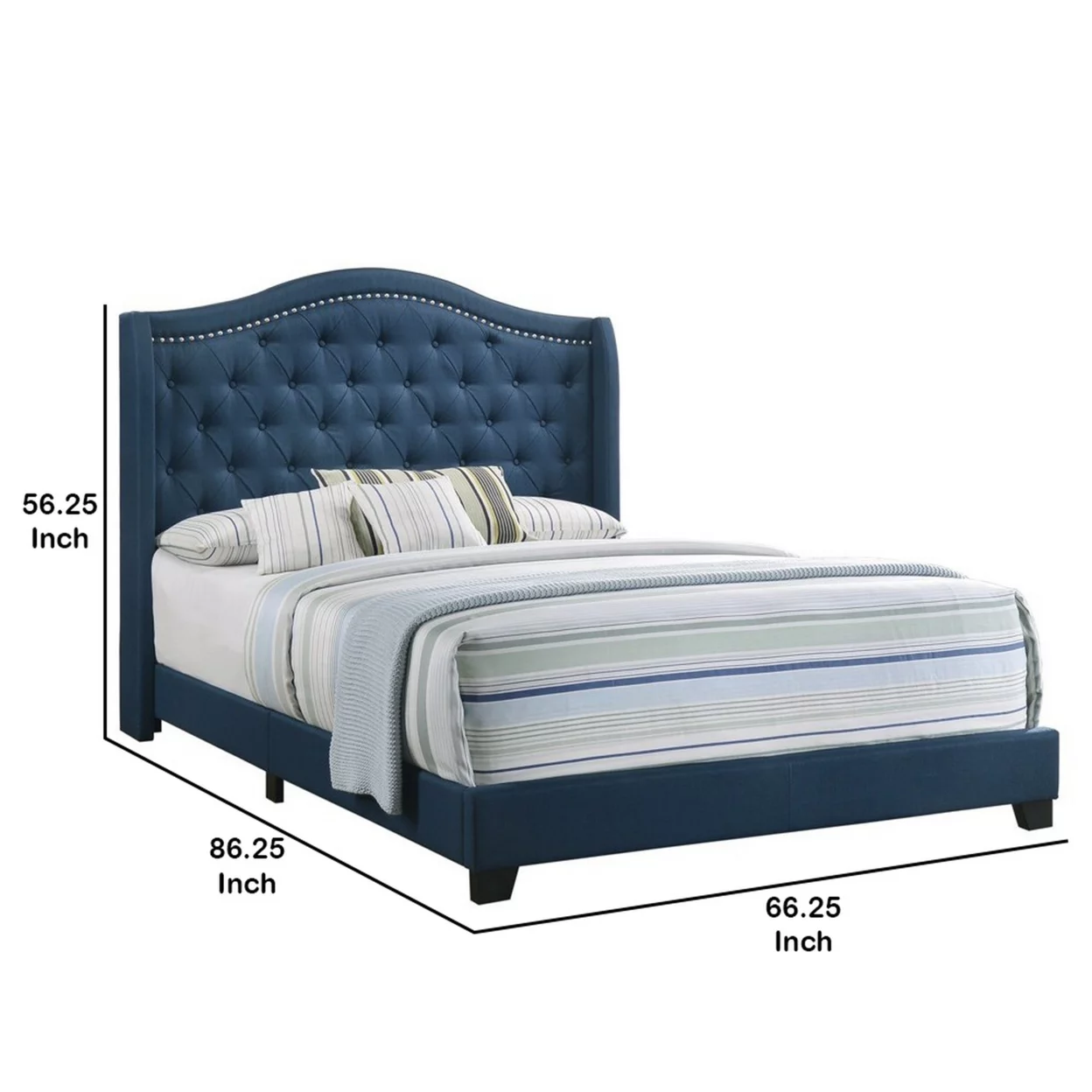 Fabric Upholstered Wooden Demi Wing Queen Bed with Camelback Headboard,Blue- Saltoro Sherpi