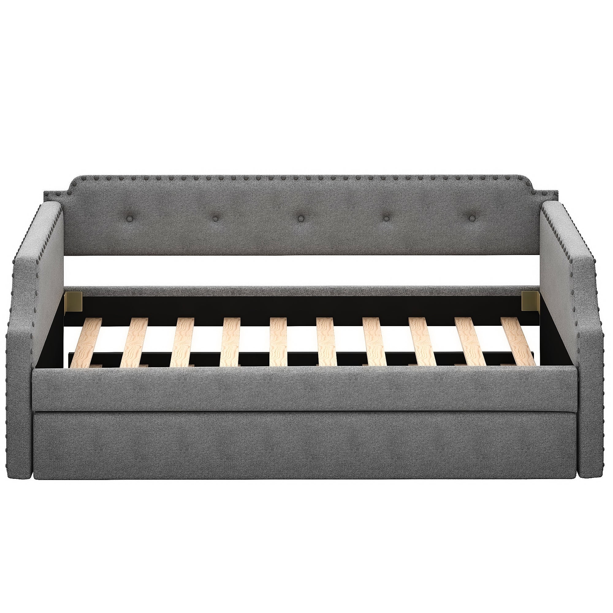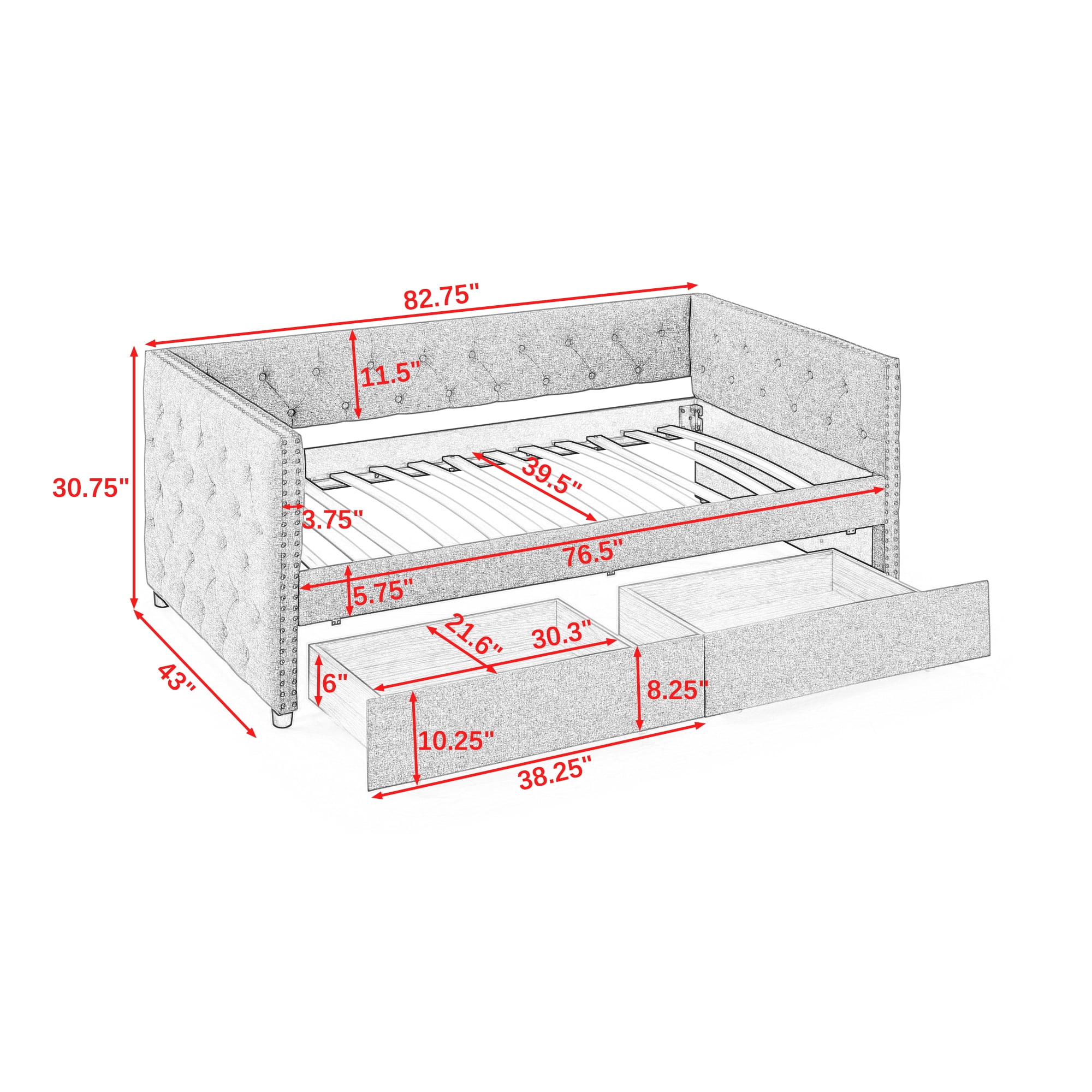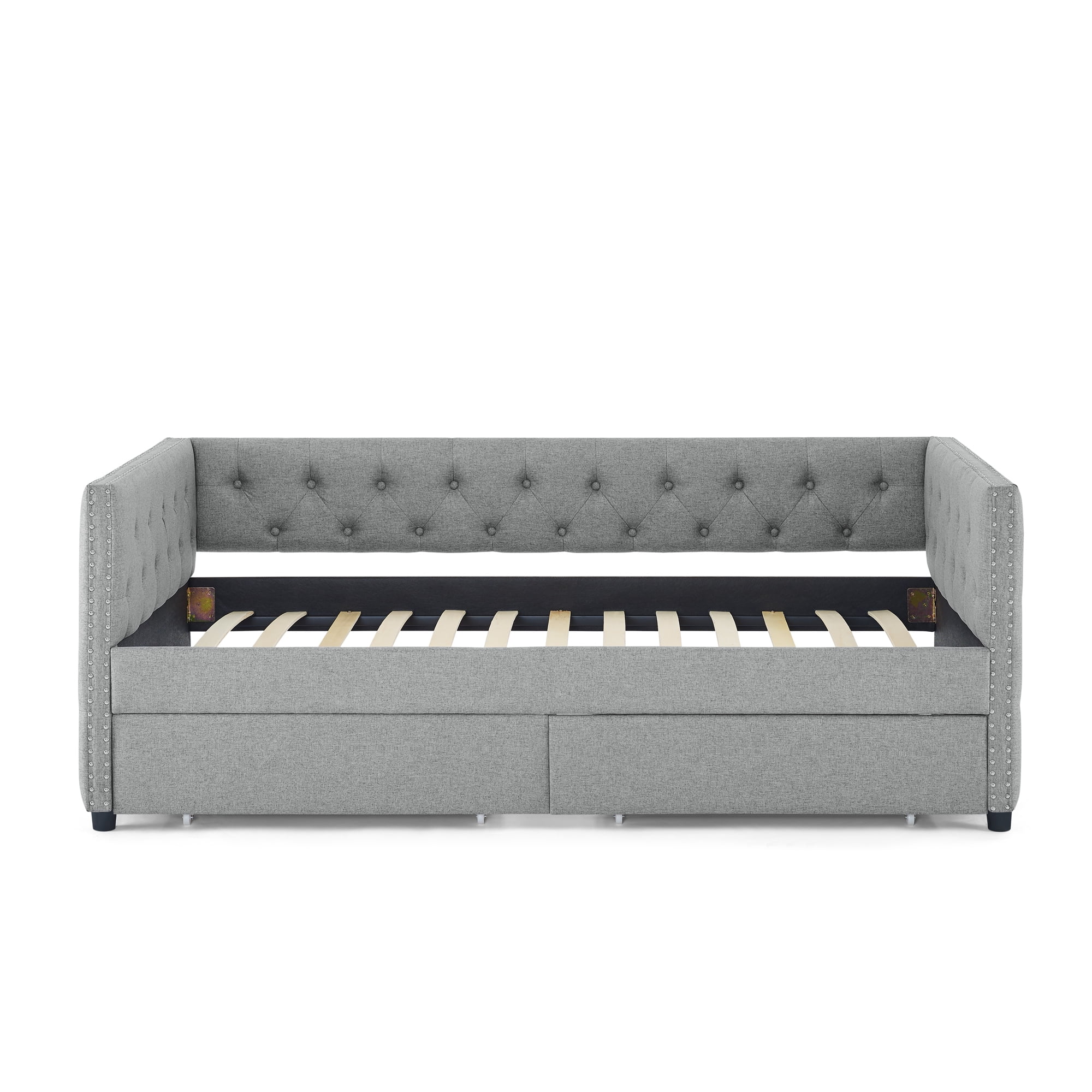 Upholstered Twin Size Daybed with Two Drawers, with Button and Copper Nail on Square Arms, Grey (82.75''x43''x30.75'')